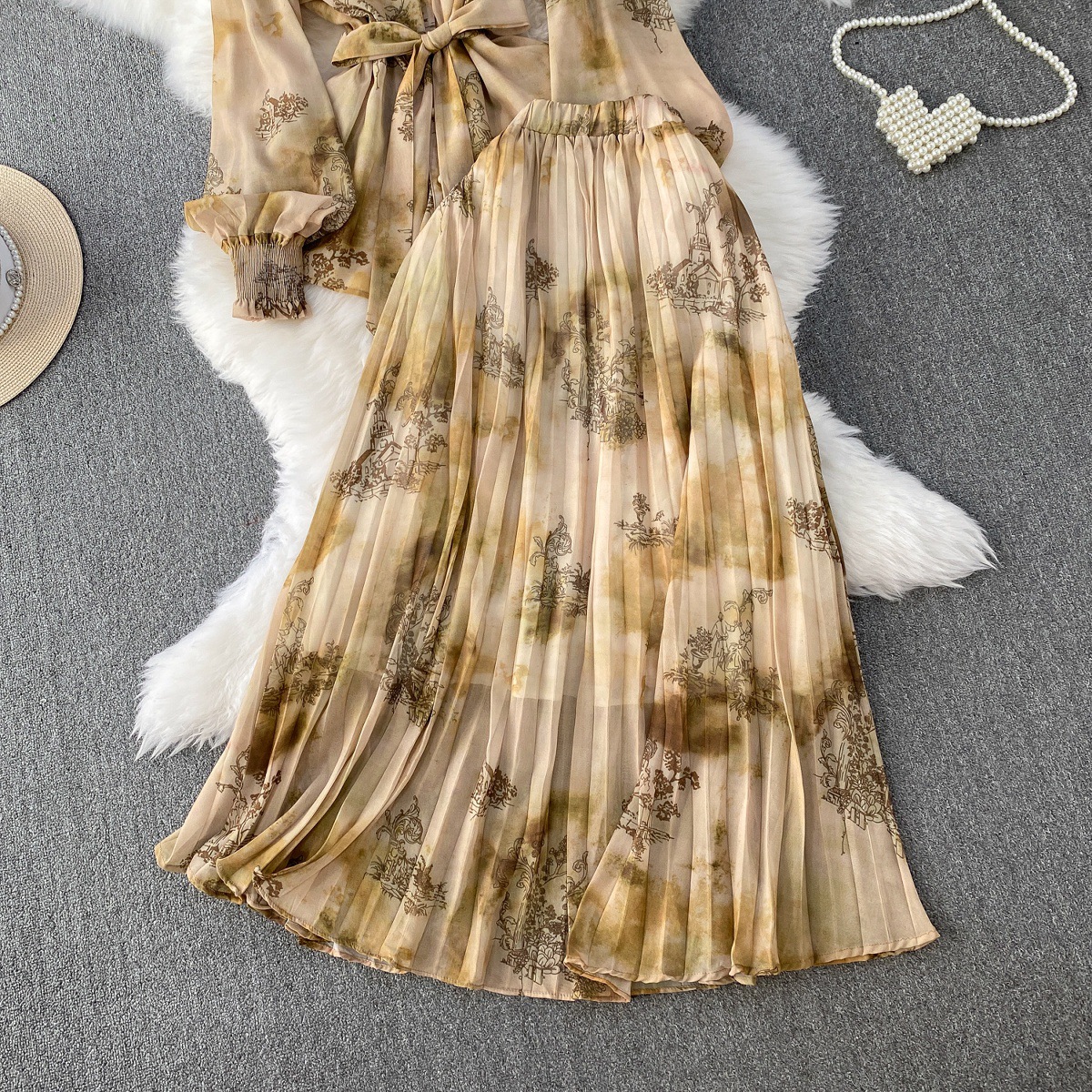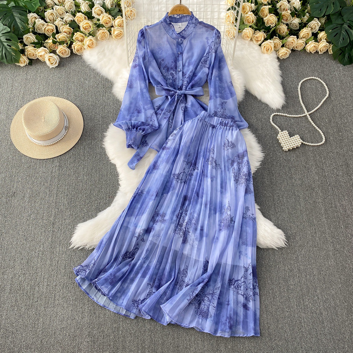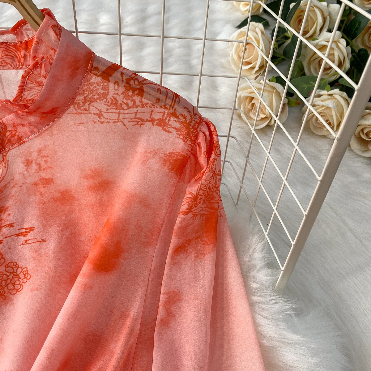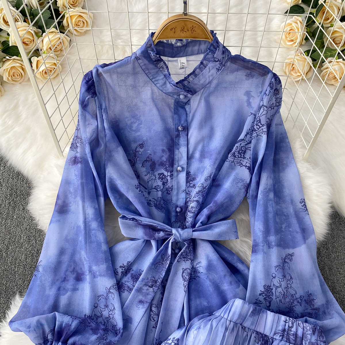 새로운 중국 스타일 인쇄 우아한 랜턴 소매 셔츠 여성의 여름 꽉 허리 슬리밍 탑 스커트 투피스 세트