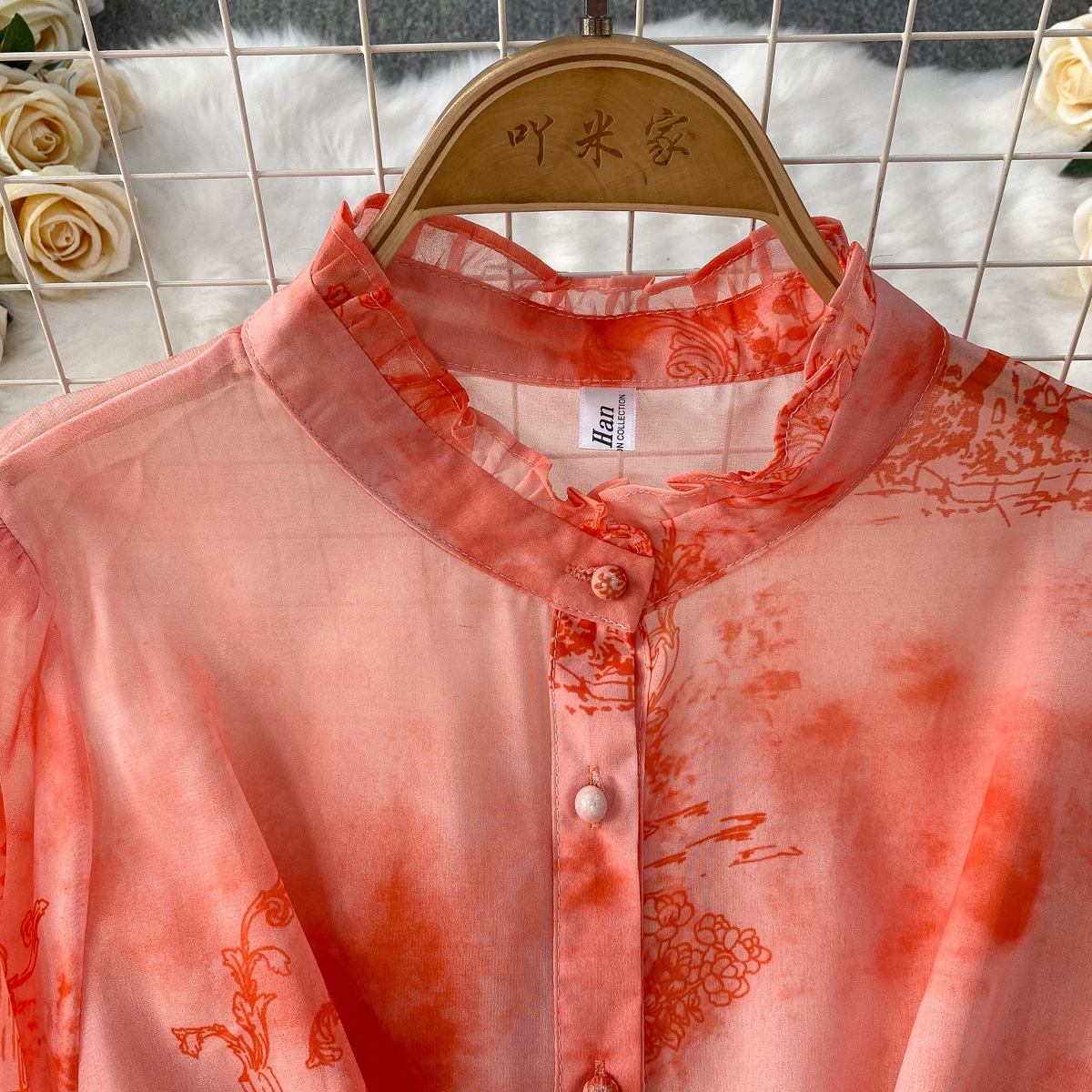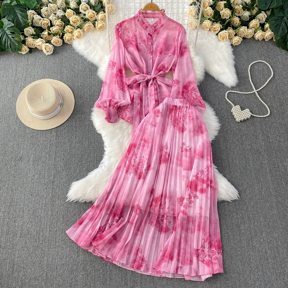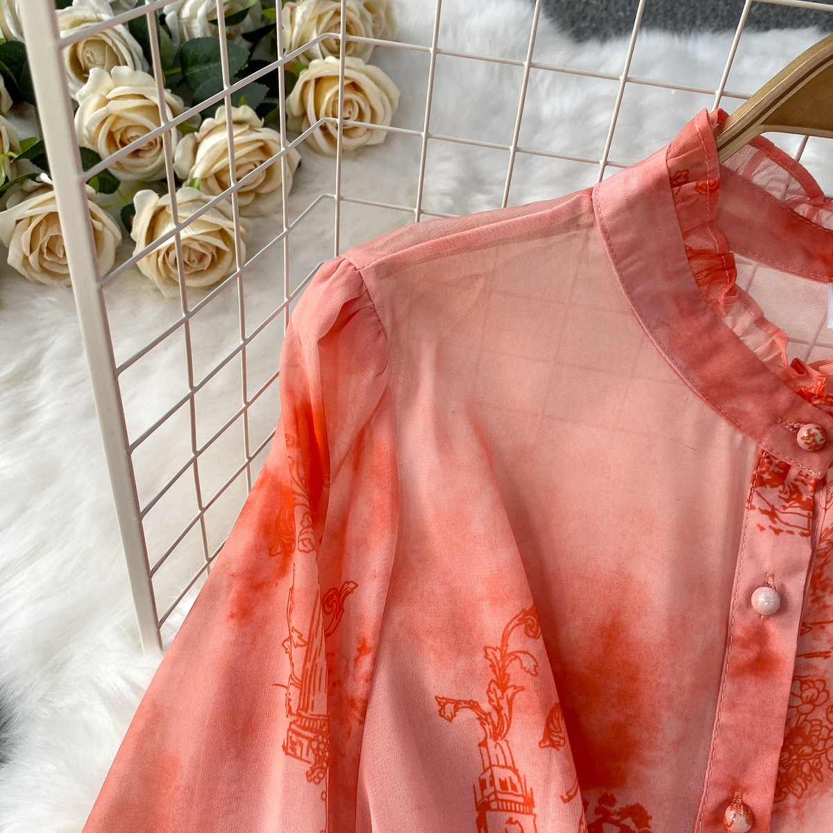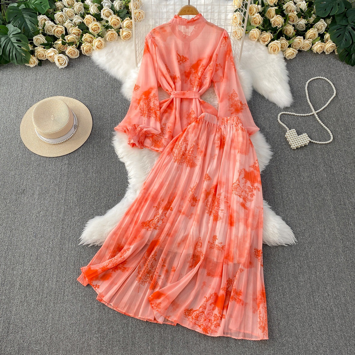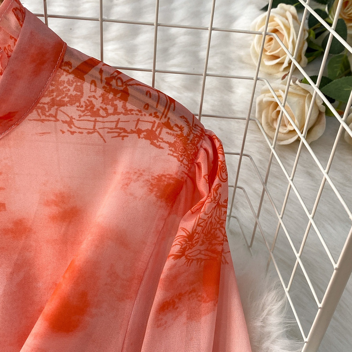 새로운 중국 스타일 인쇄 우아한 랜턴 소매 셔츠 여성의 여름 꽉 허리 슬리밍 탑 스커트 투피스 세트