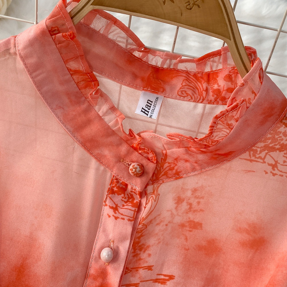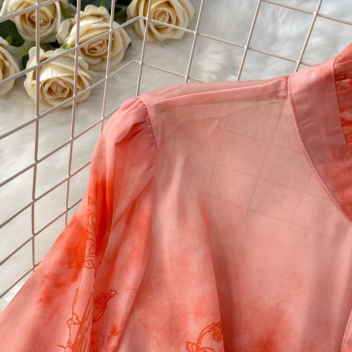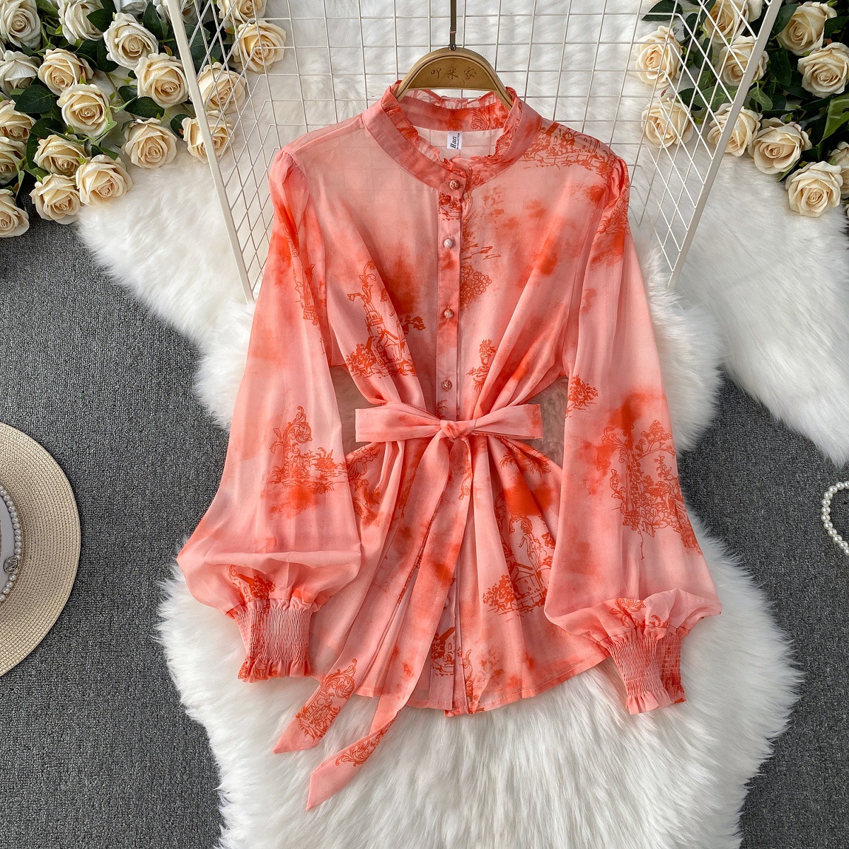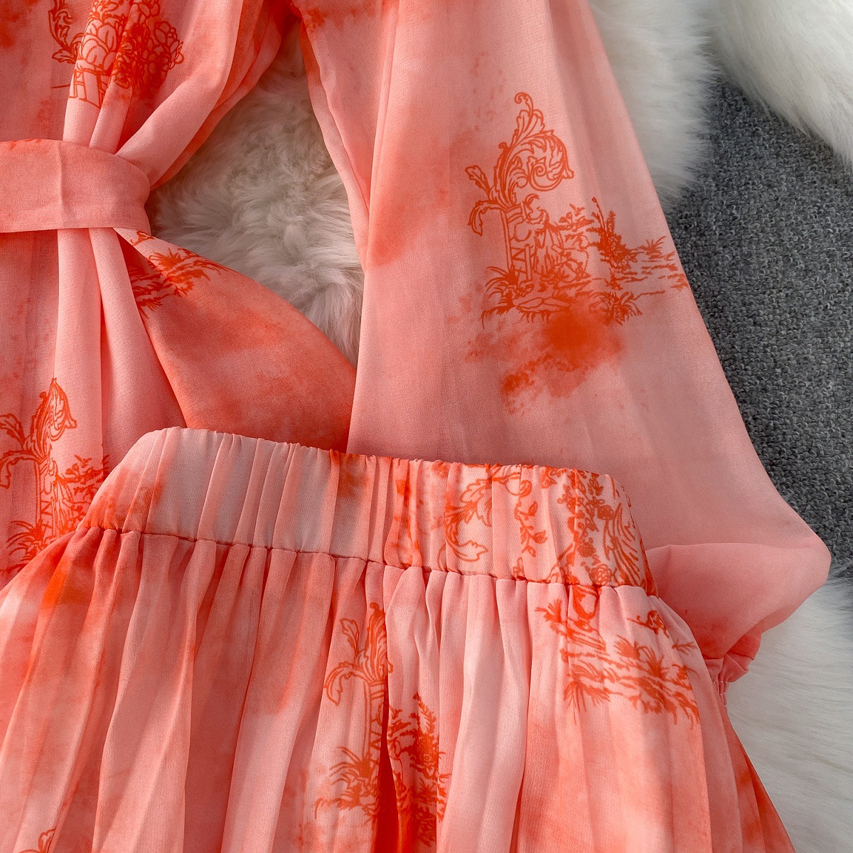 새로운 중국 스타일 인쇄 우아한 랜턴 소매 셔츠 여성의 여름 꽉 허리 슬리밍 탑 스커트 투피스 세트