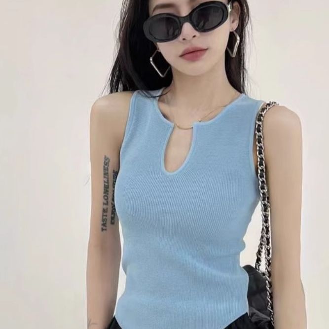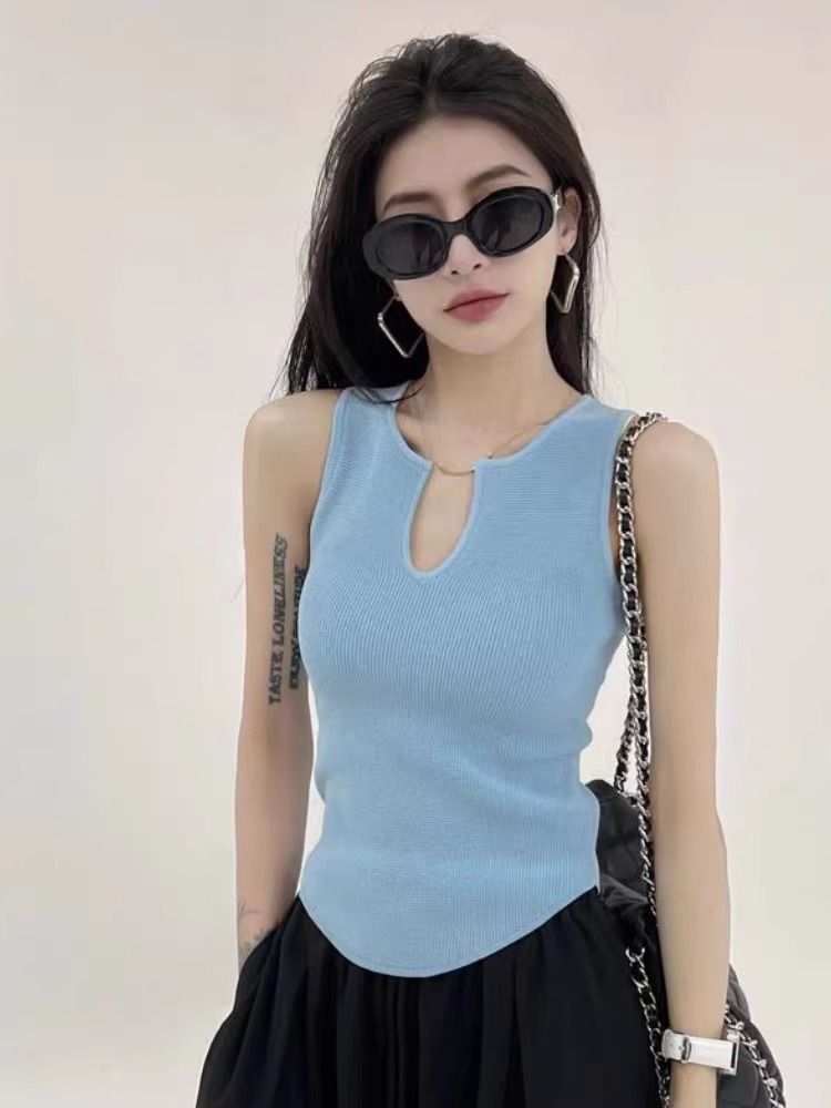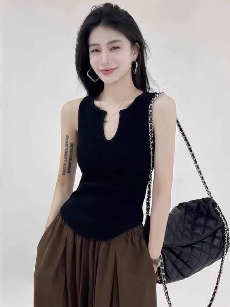 프랑스 스타일 민소매 조끼 여성 여름 디자인 센스 틈새 슬림 핏 아이스 실크 니트 셔츠 세련된 불규칙한 V 넥 탑