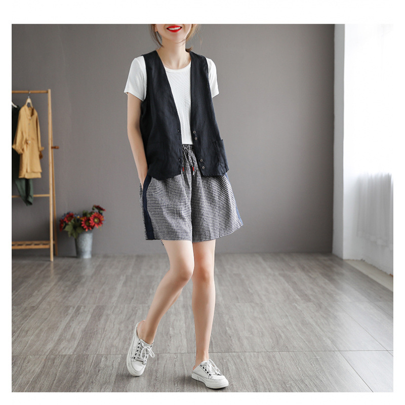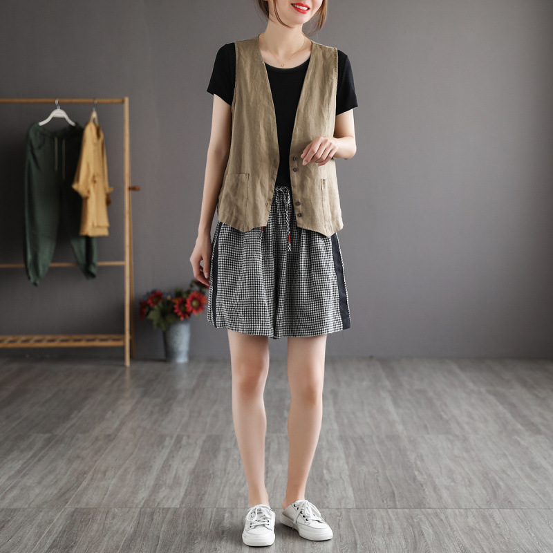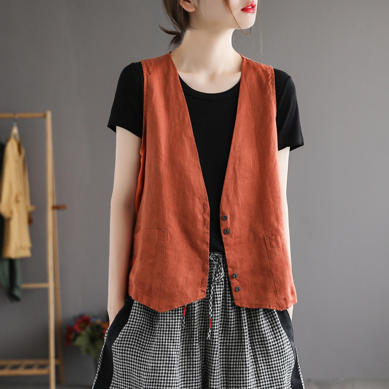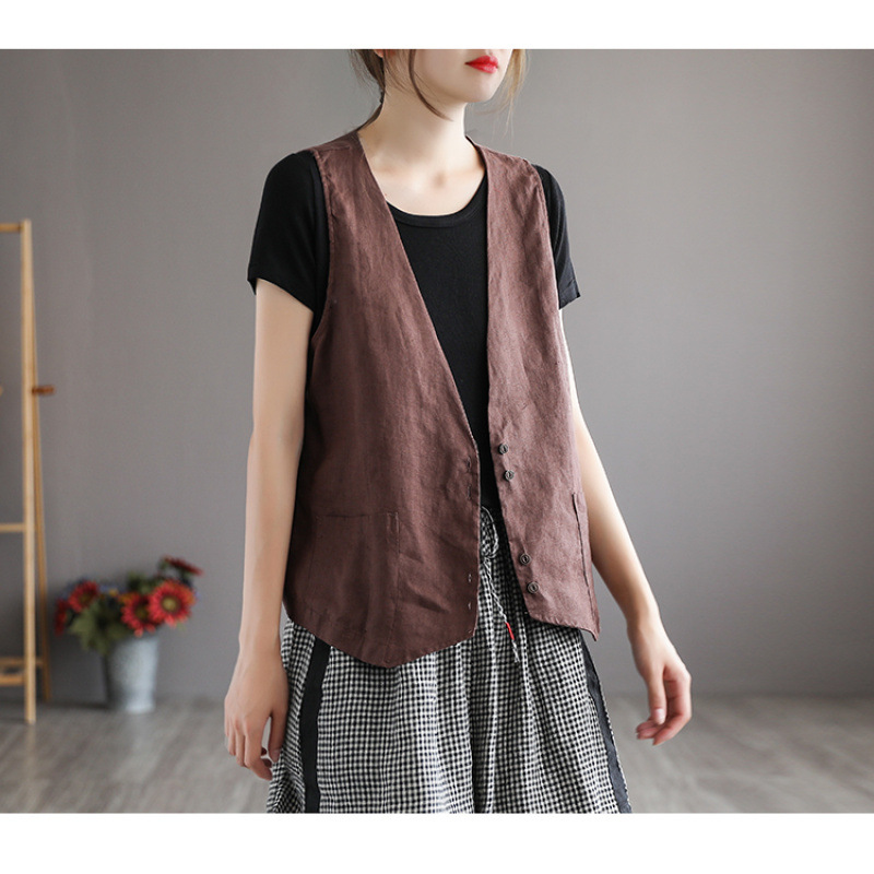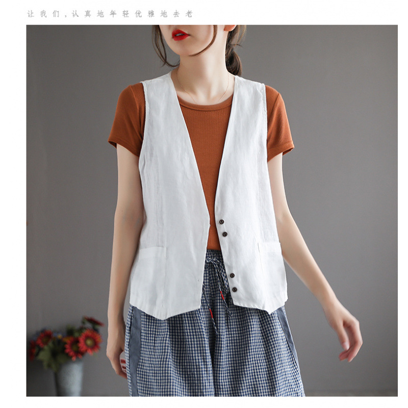 오리지널 문학 복고풍 코튼 린넨 솔리드 컬러 v 넥 조끼 여성 여름 얇은 대형 다목적 카디건 조끼스토어 가기