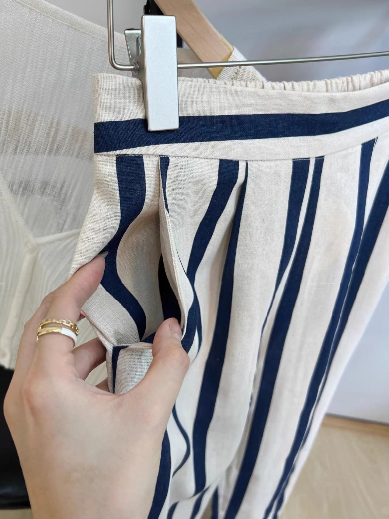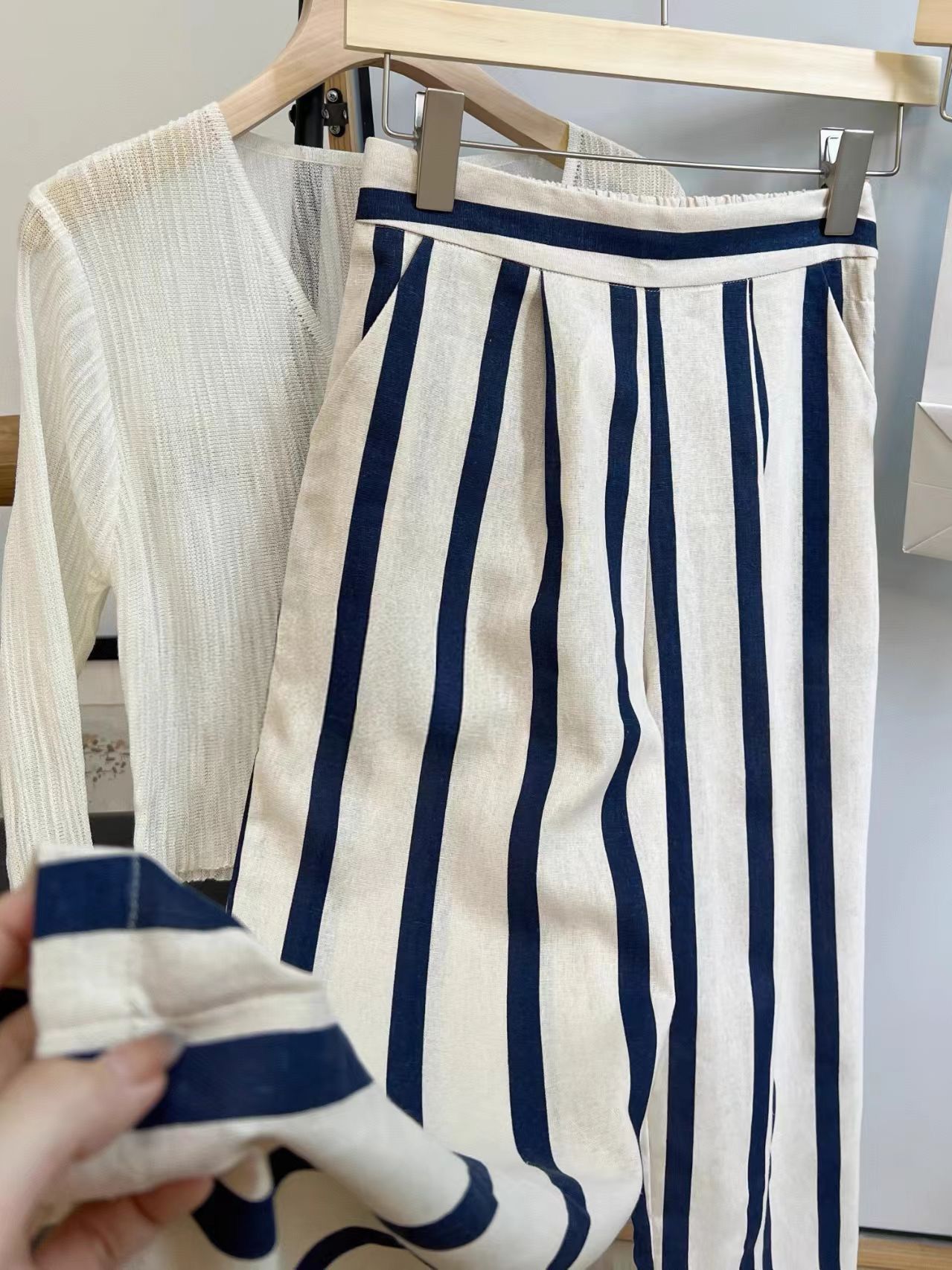 竖条纹棉麻裤子女春秋亚麻阔腿裤小个子九分裤夏季薄款直筒防晒裤