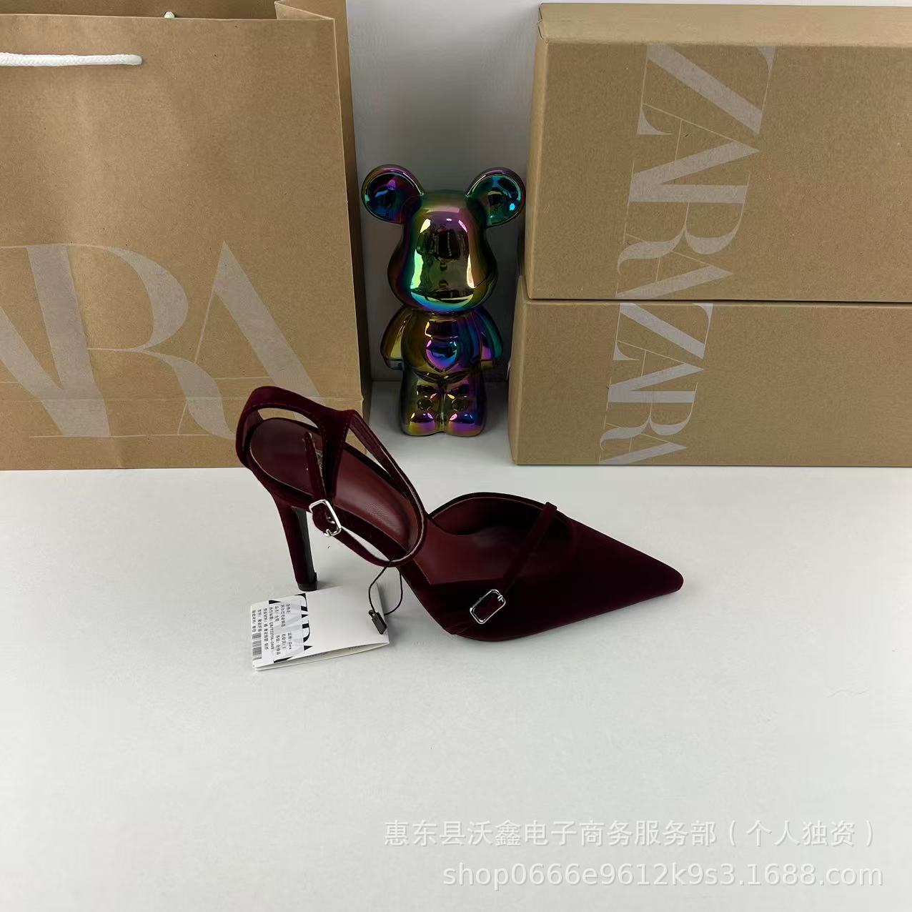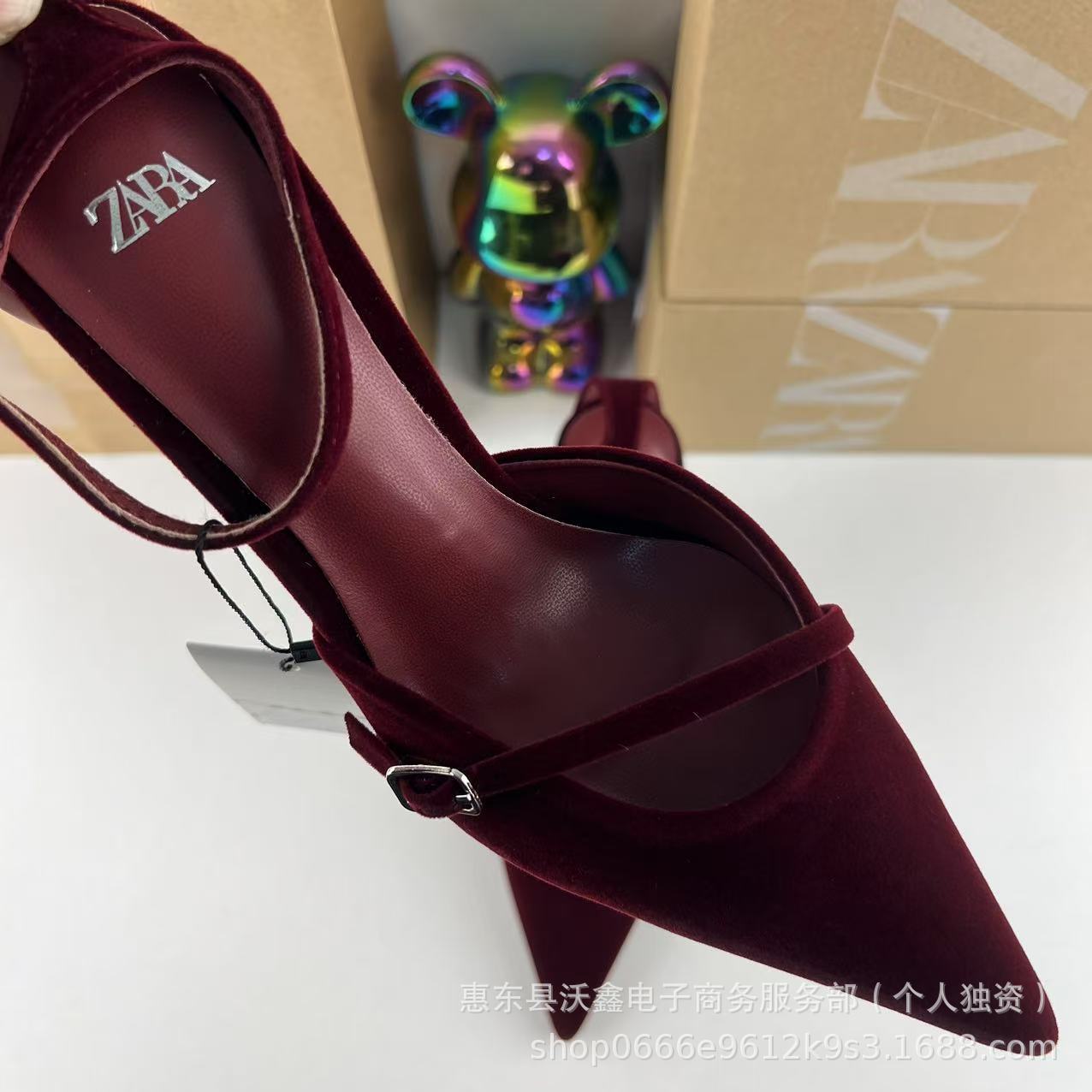 ZAR春季新品女鞋红绒天鹅绒效果尖头气质细高跟穆勒鞋丁字扣带单鞋