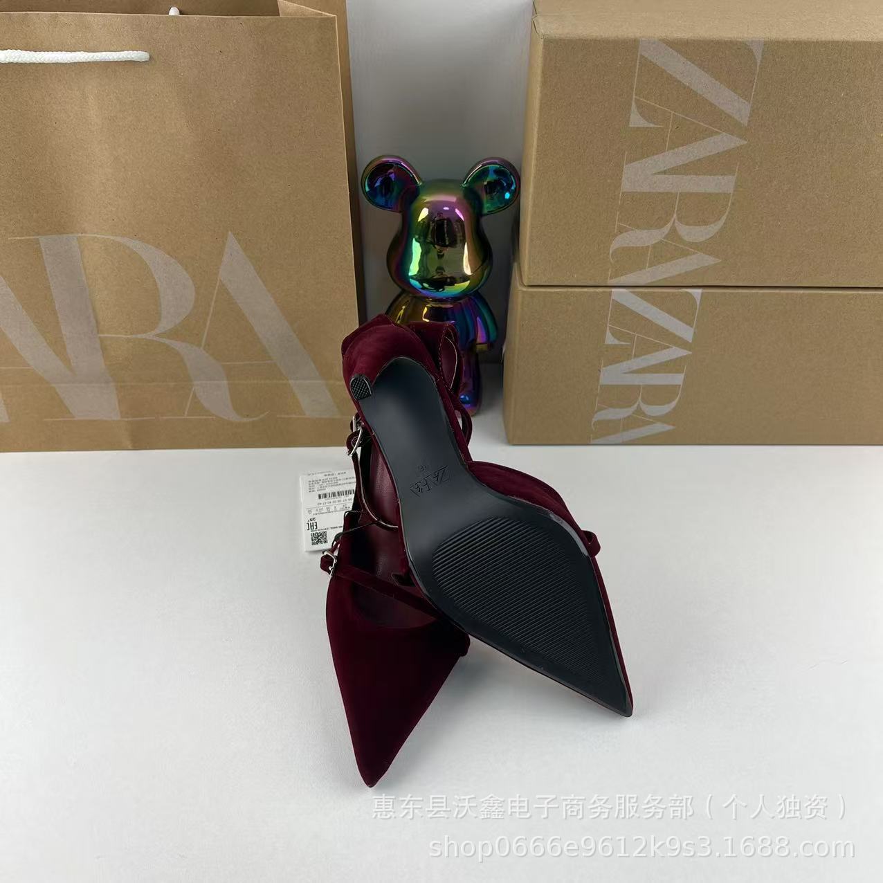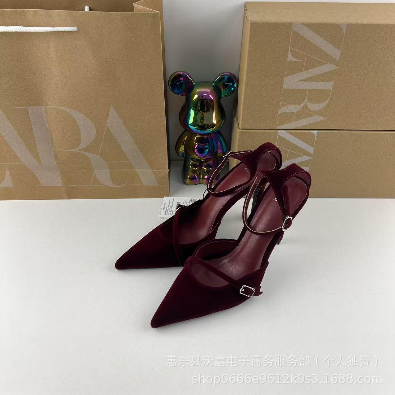 ZA 봄 새로운 여성 신발 레드 벨벳 효과 뾰족한 기질 얇은 힐 뮬러 신발 T-버클 싱글 신발스토어 가기