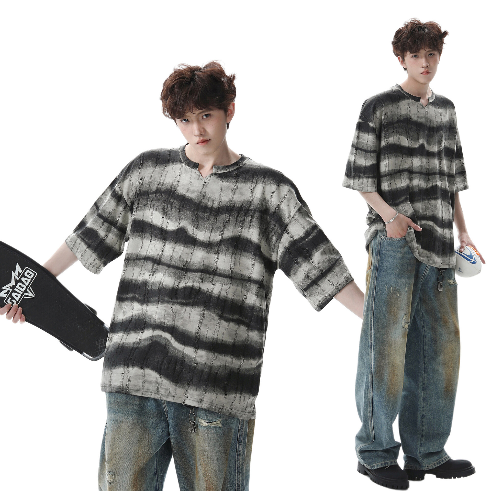 줄무늬 V 넥 반팔 티셔츠 남자 여름 더플 잘 생긴 하이 스트리트 미국 유행 느슨한 반소매 십대 티셔츠 탑스토어 가기