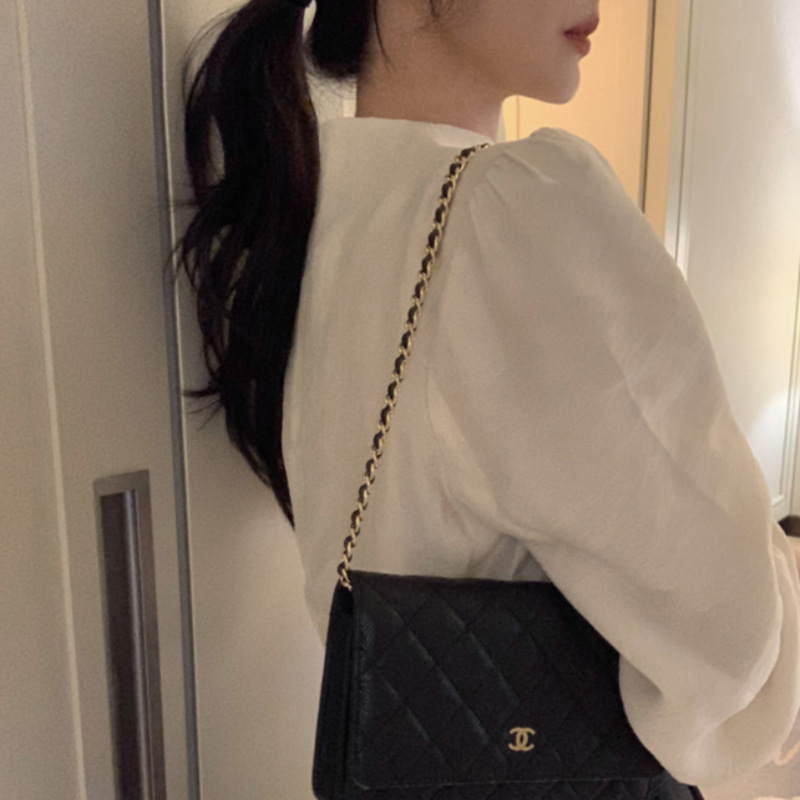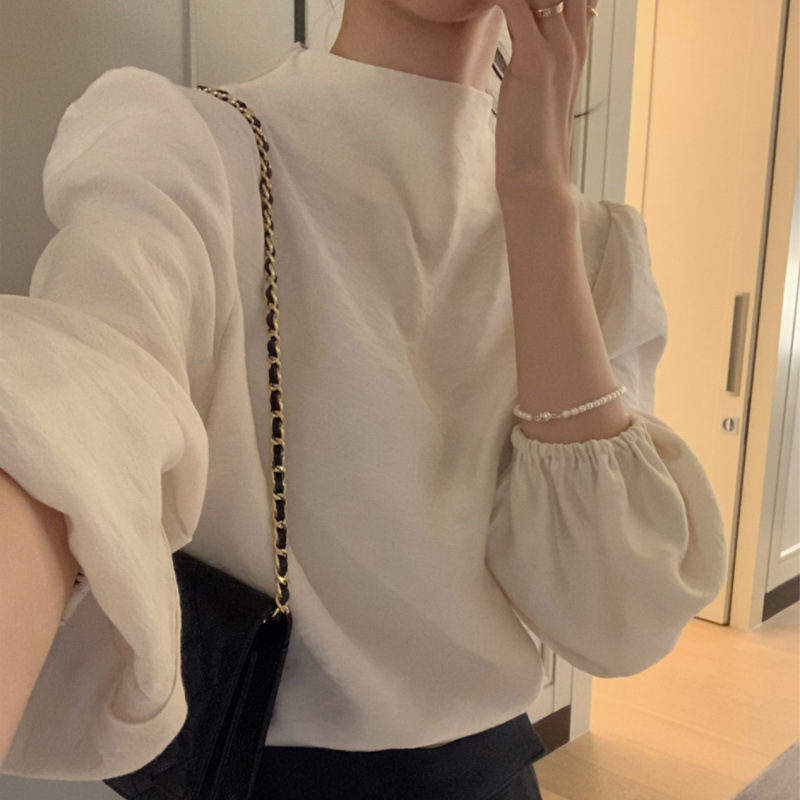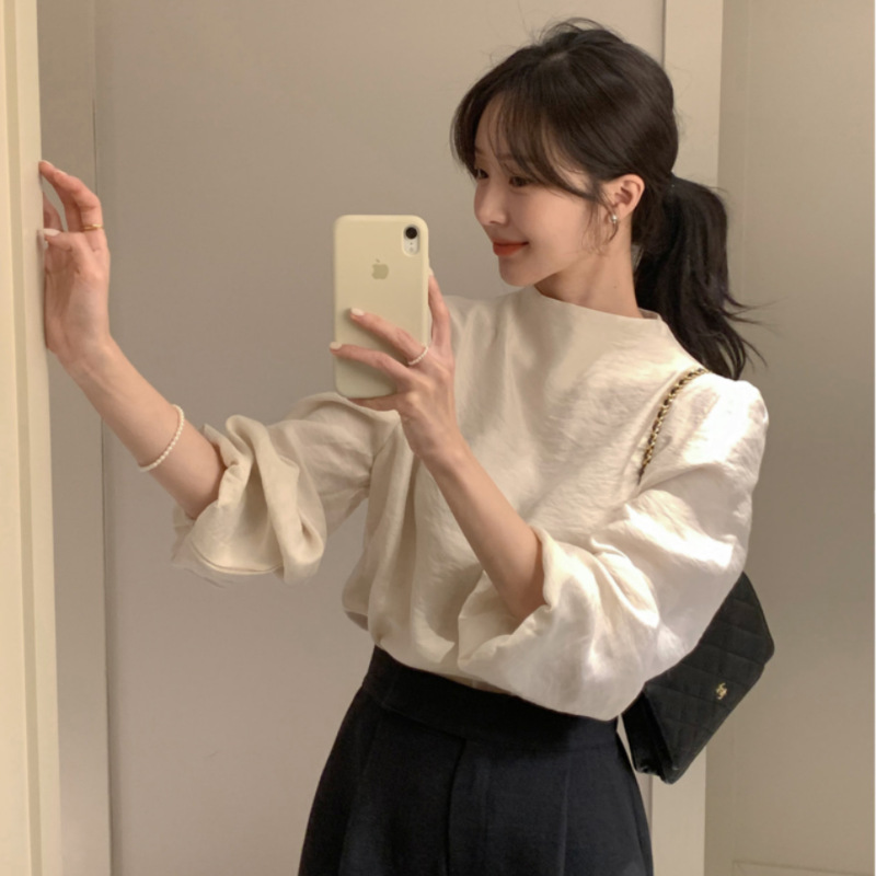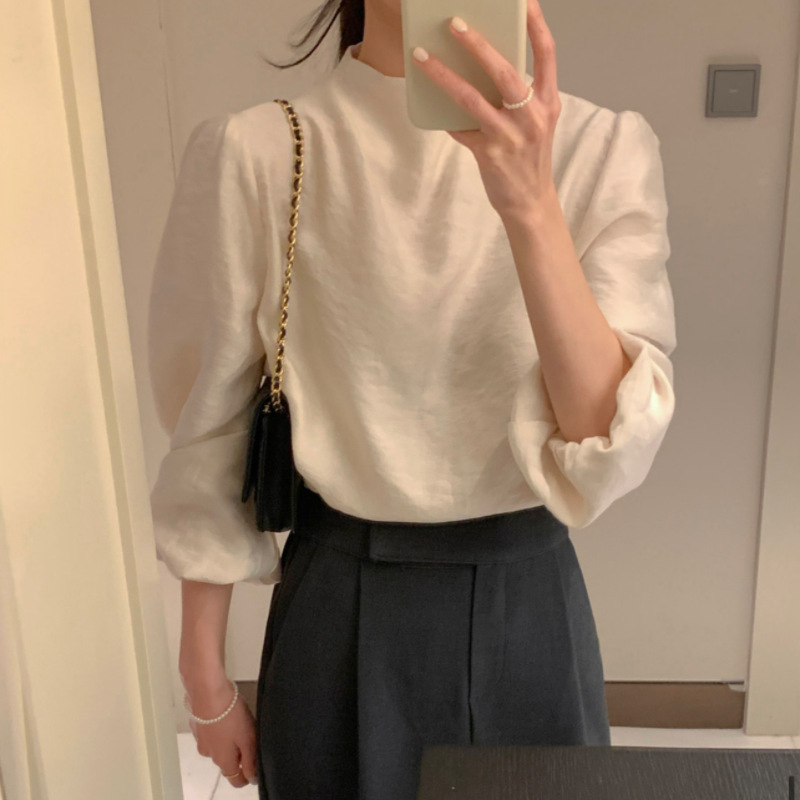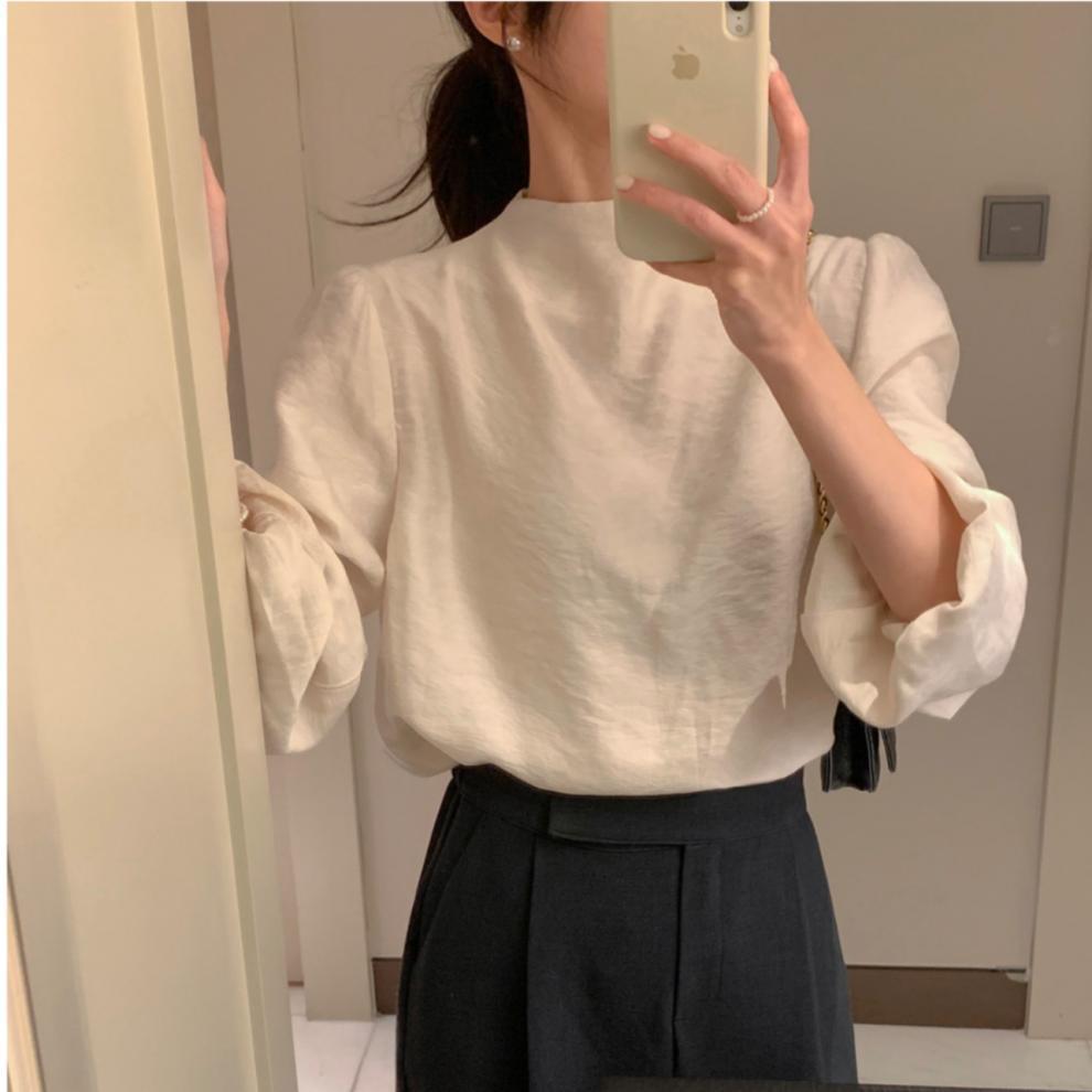 프랑스 레트로 하이 엔드 웨스턴 스타일 우아한 간단한 올 매치 긴 소매 라운드 넥 퍼프 소매 단색 셔츠 최고 여성 트렌디스토어 가기