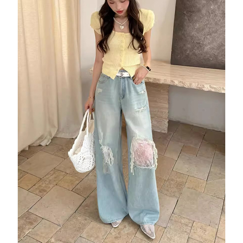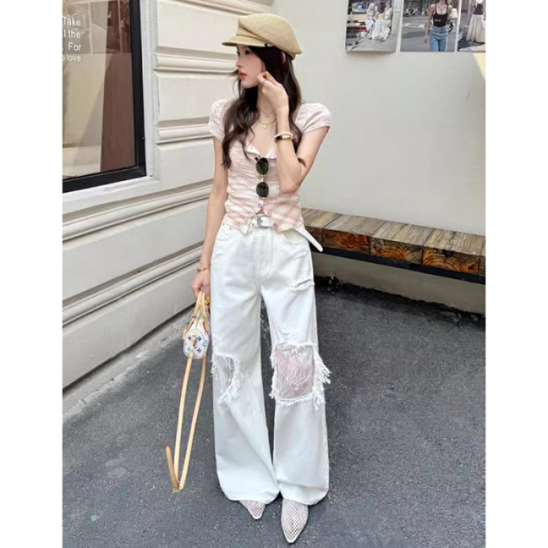 레이스 스티칭 리핑 청바지 여성용 2025 여름 디자인 높은 허리 올매치 루즈 슬리밍 스트레이트 팬츠스토어 가기