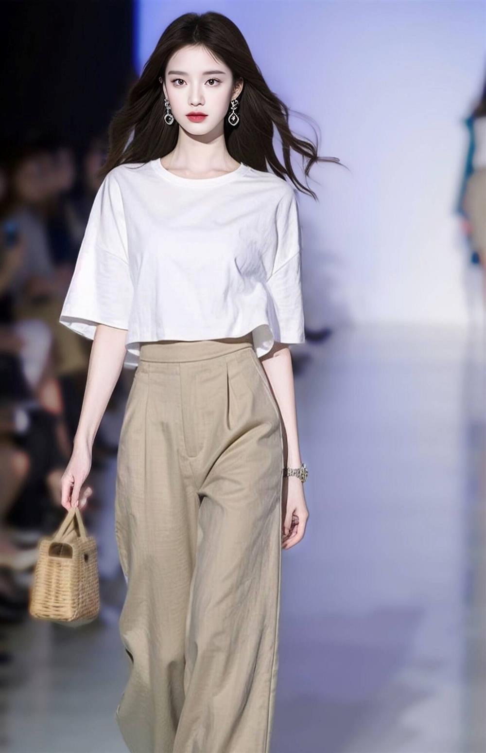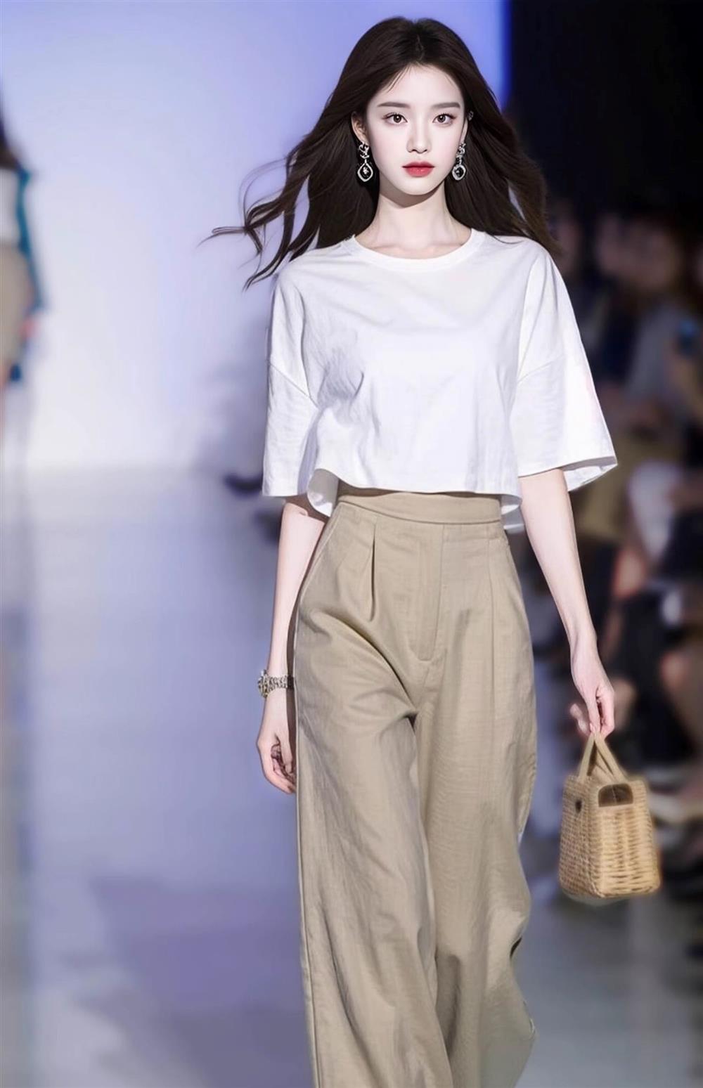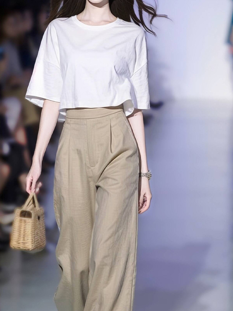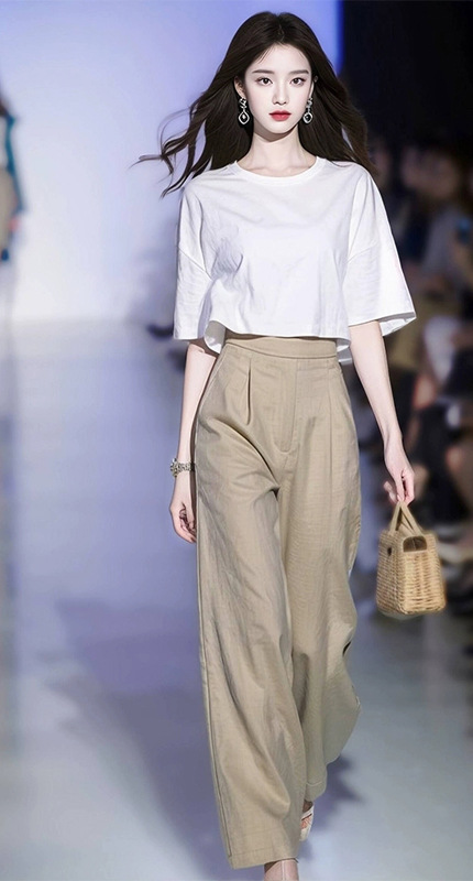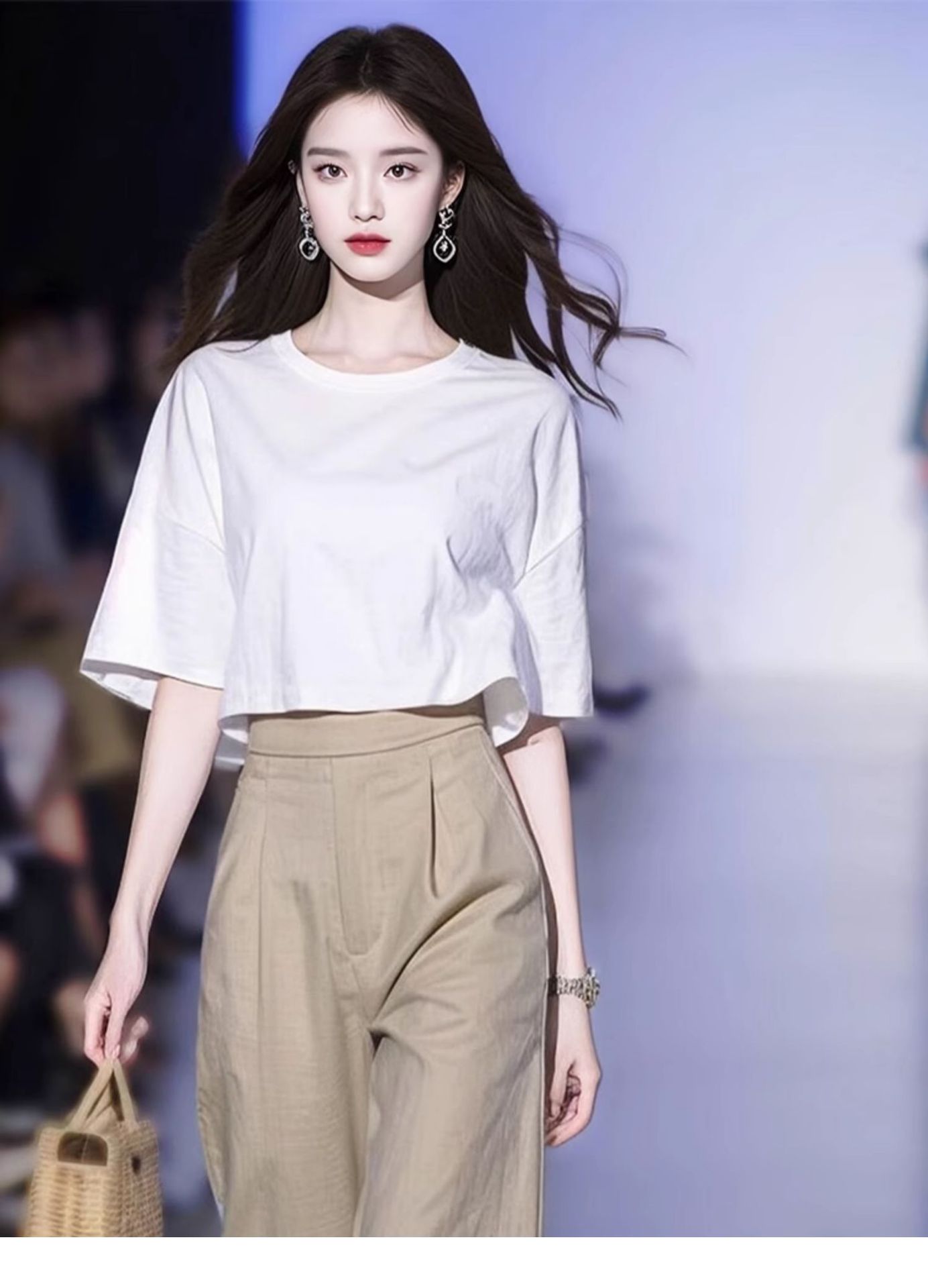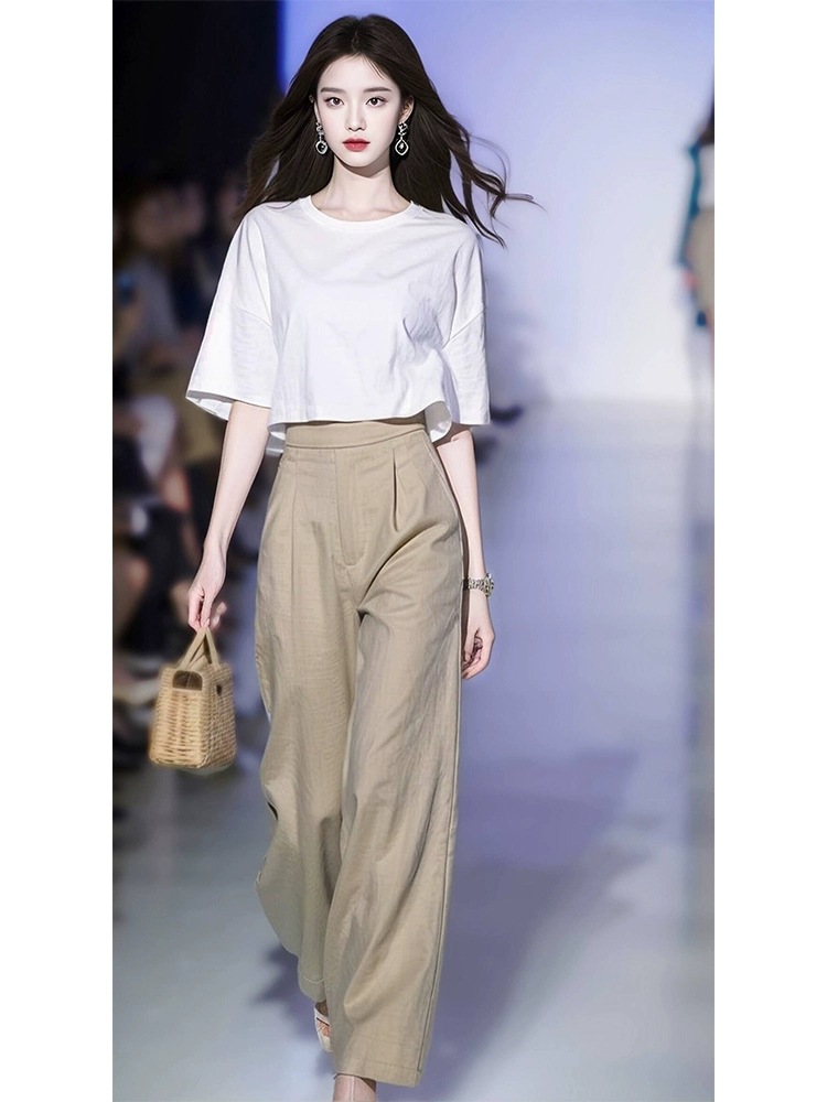 편안한 느낌의 세트 2025 여름 착용 짧은 소매 흰색 티셔츠 넓은 다리 바지 투피스 세트 튀긴 거리