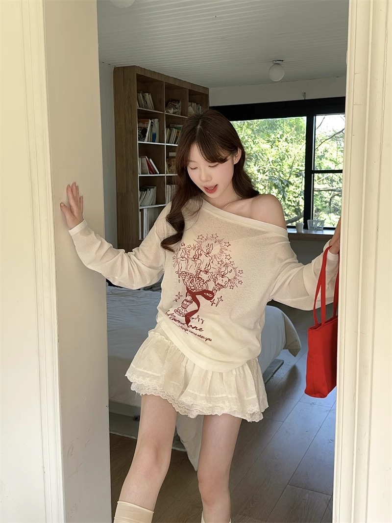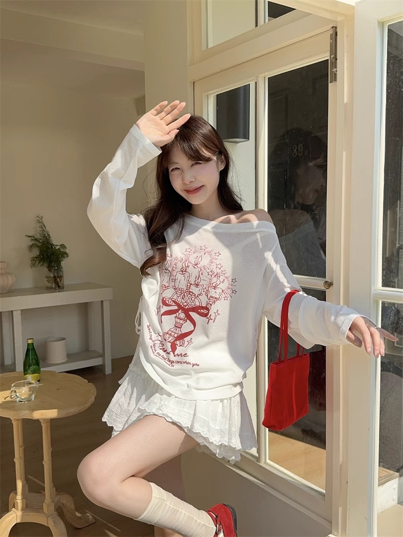 한국 스타일 달콤한 스파이스 소녀 그래피티 화이트 오비큐 오프 숄더 긴팔 블라우스 티셔츠 여성 여름 디자인 센스 니치 드로스트링 탑
