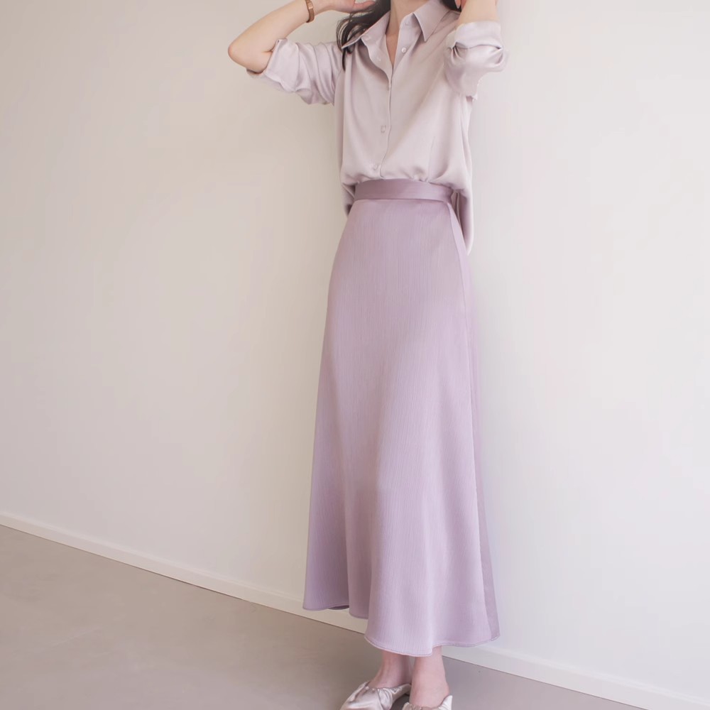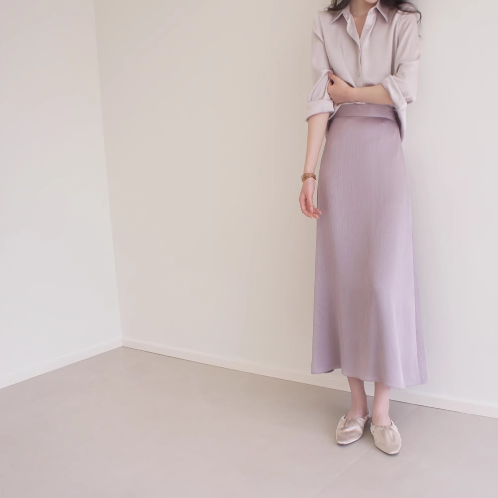 SS STUDIO 회색 톤 보라색 세로 패턴 높은 허리 무릎 마이크로 등 허리 탄성 스커트 부드럽고 우아한 여성스토어 가기