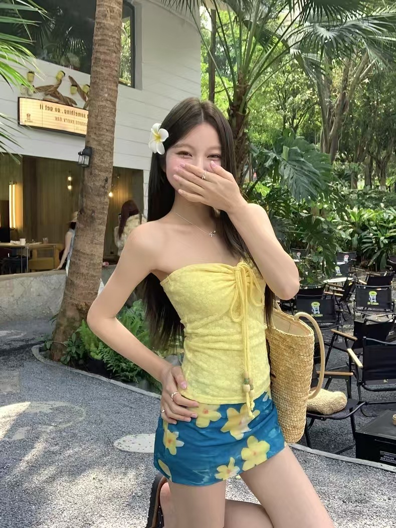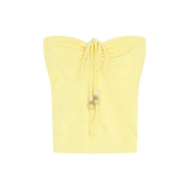 프랑스 달콤한 도파민 노란색 Halter Camisole 여성 여름 의상 해변 휴가 용 짧은 정상