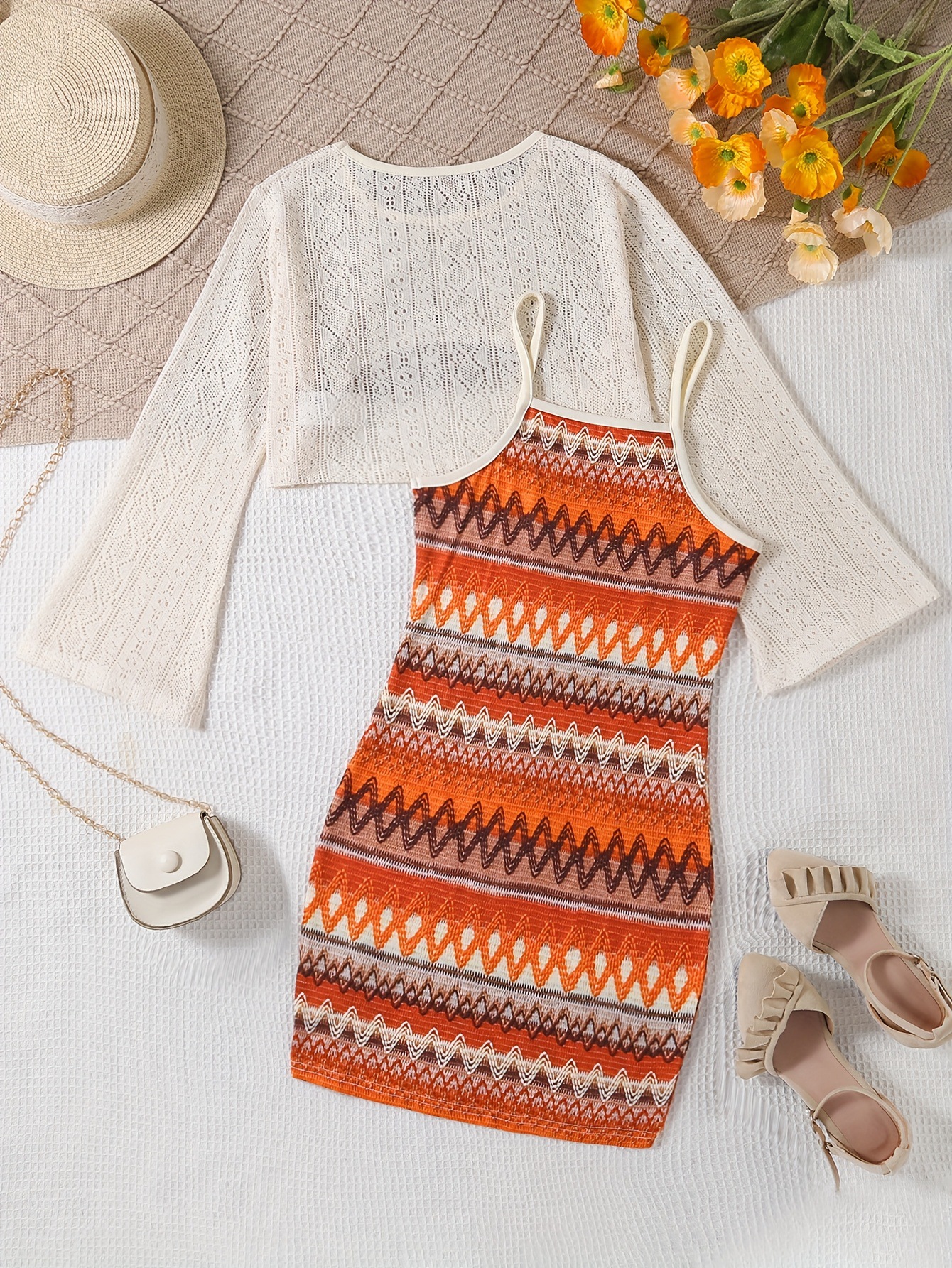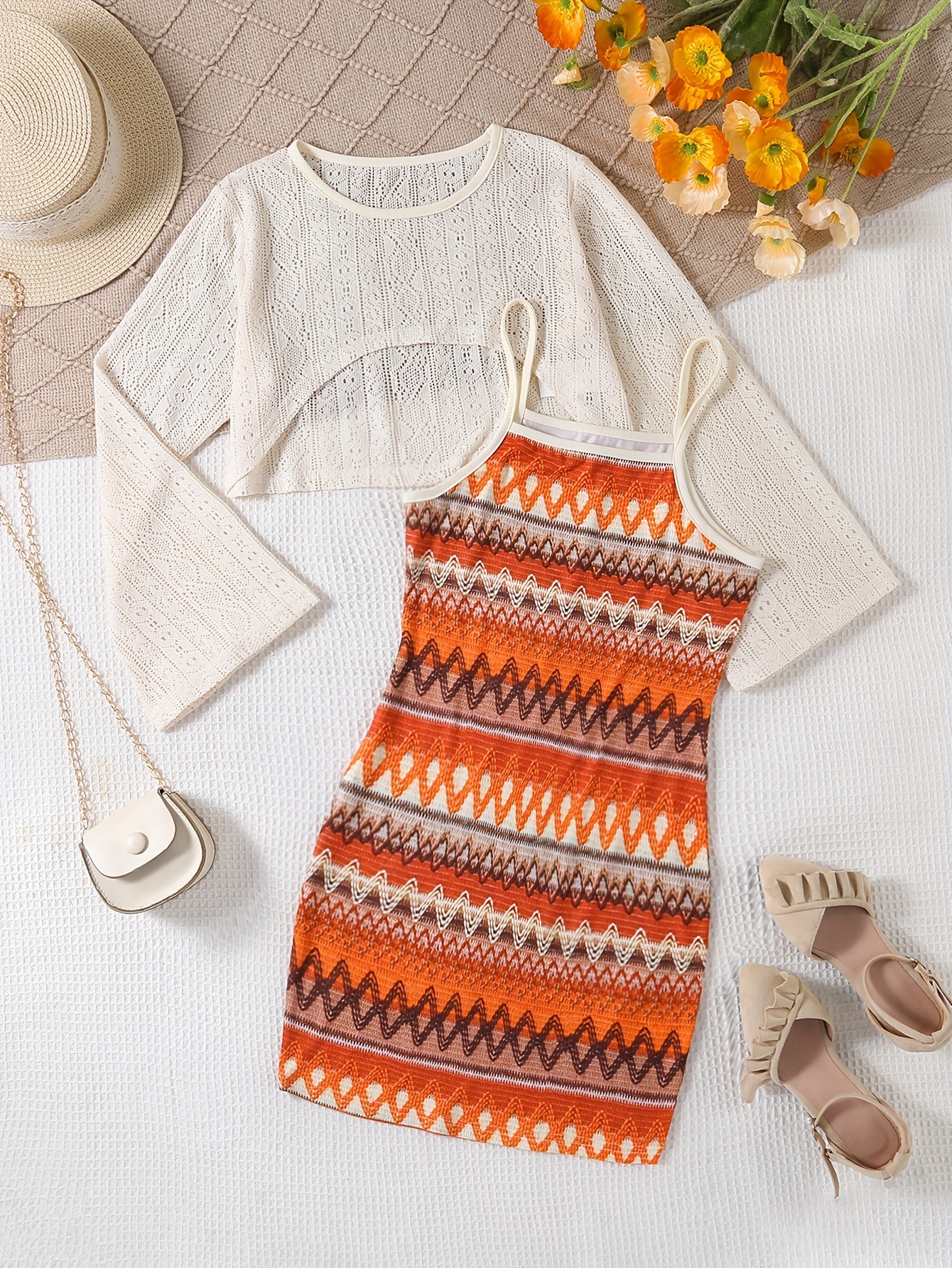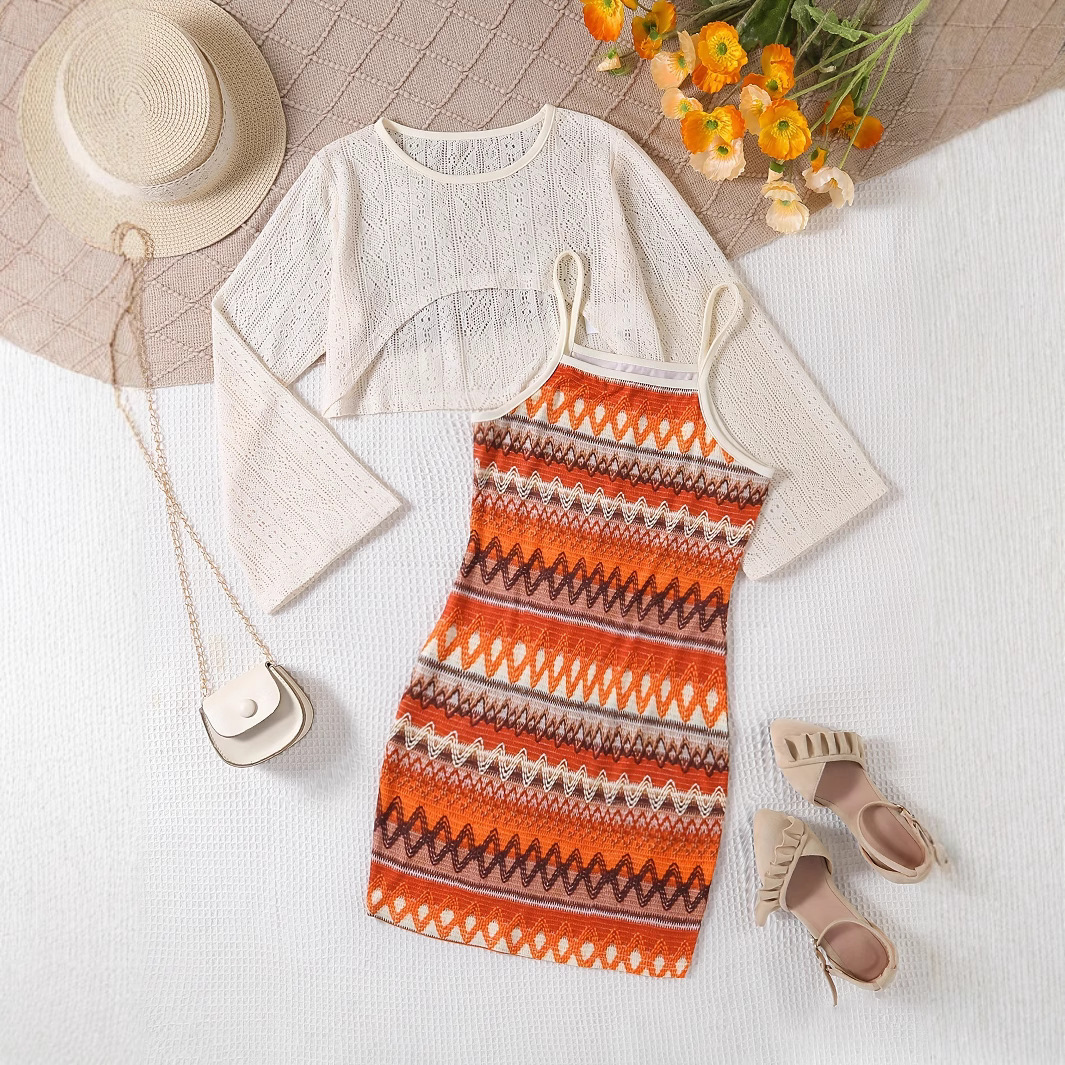 국경 간 소녀 캐주얼 야외 휴가 정장 라운드 넥 긴팔 탑 컬러 블록 스트라이프 슬림 드레스 투피스 세트