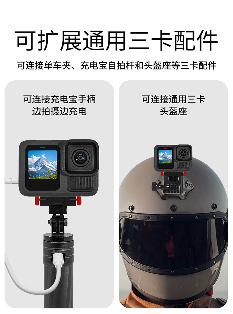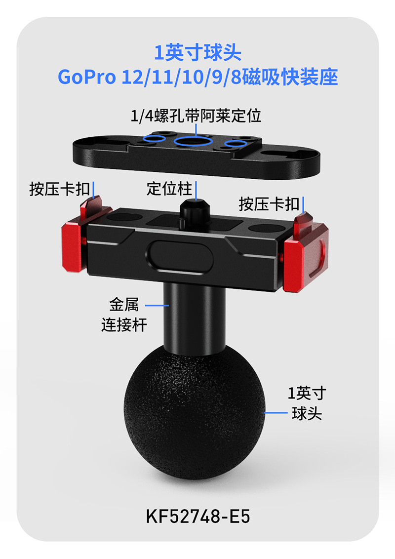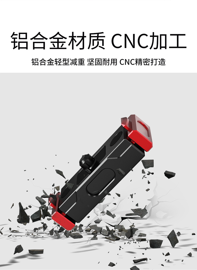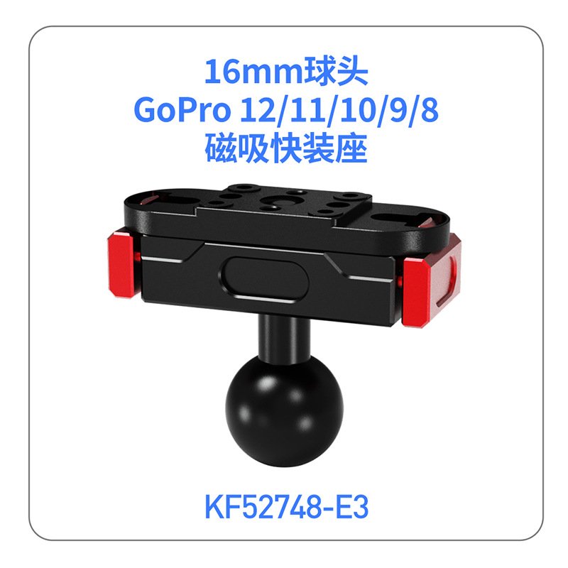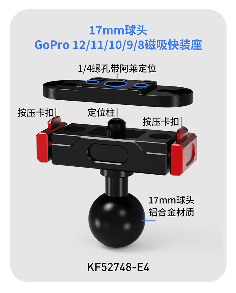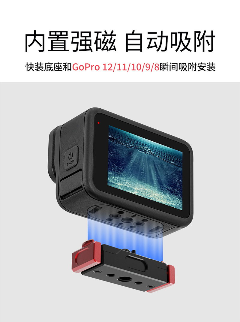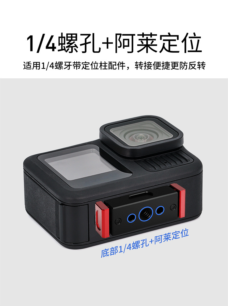 三、主要特点关键词:铝合金材质 CNC加工 1/4螺孔 阿莱定位孔 N52强磁 适用于GoPro12/11/10/9/8相机 相机。