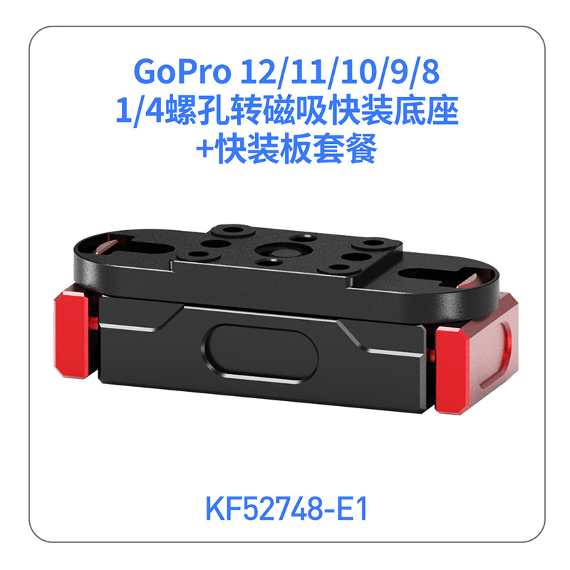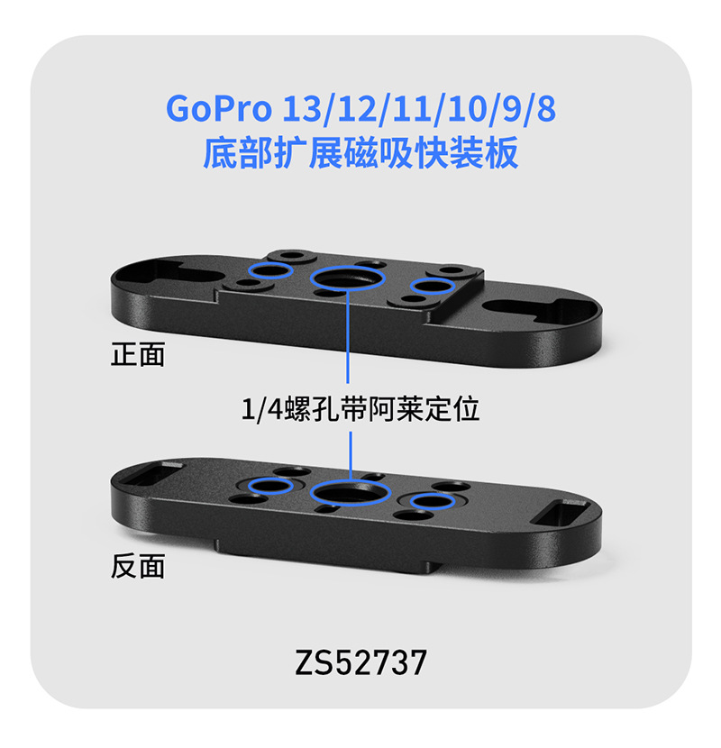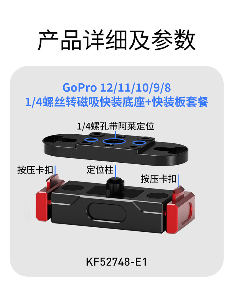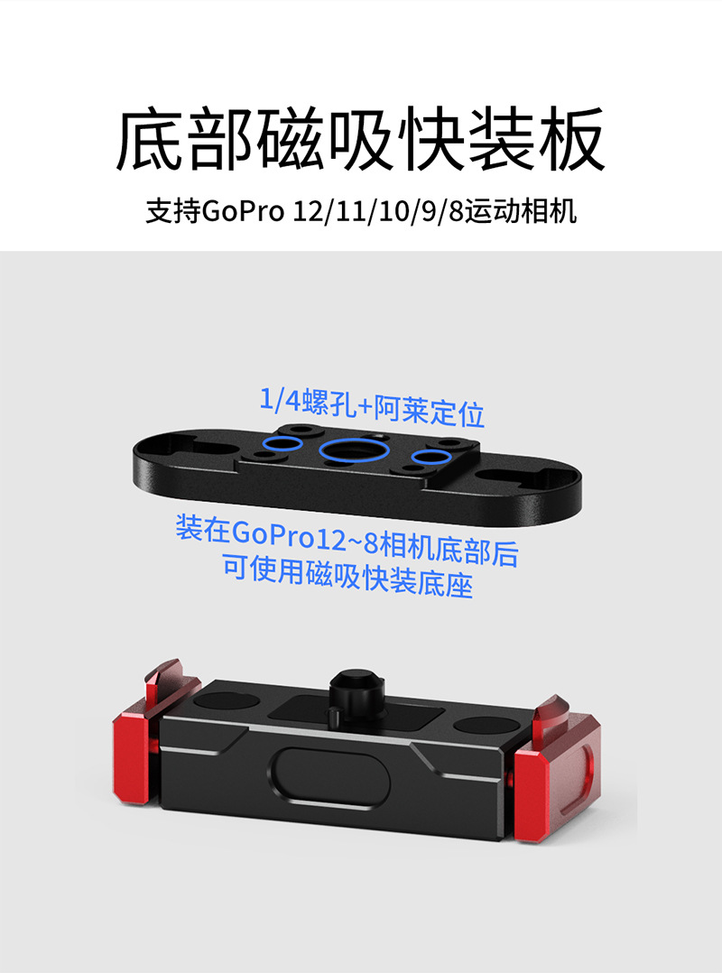 标题:适用GOPRO底部替换座套件 铝合金磁吸快拆快装底座 1/4螺孔阿莱定位孔 N52强磁 双边弹性卡扣 适用于GoPro12/11/10/9/8相机替换 适用于带1/4螺杆亦或1/4阿莱定位配件