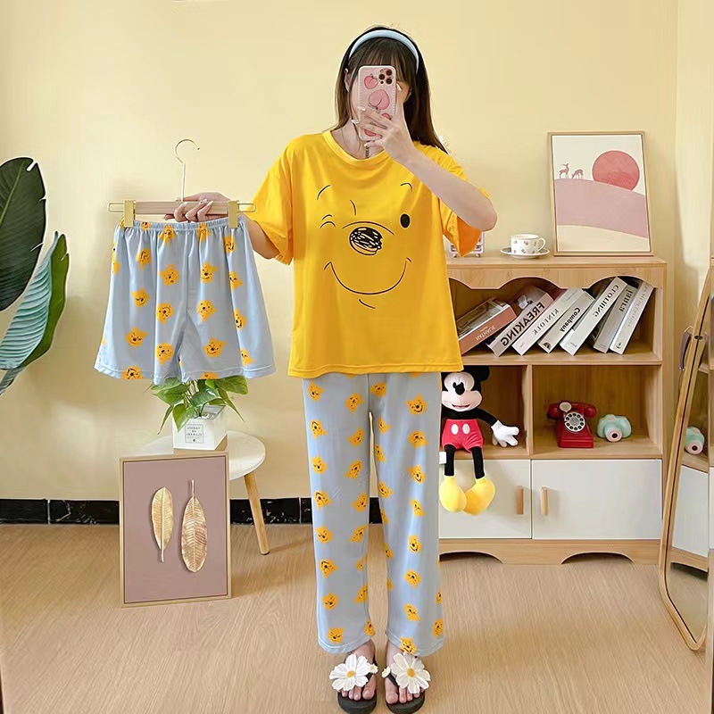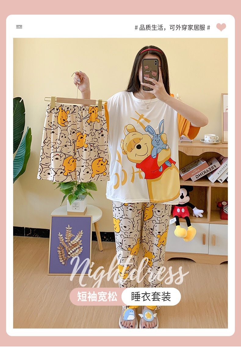 파자마 여성 여름 3 종 세트 반팔 바지 한국식 핫 셀러 만화 패턴 느슨한 잠옷 홈 옷스토어 가기