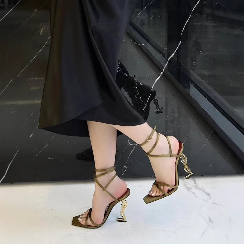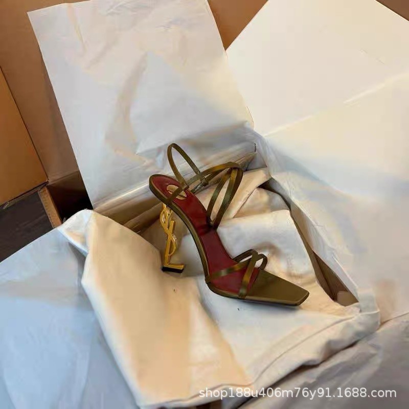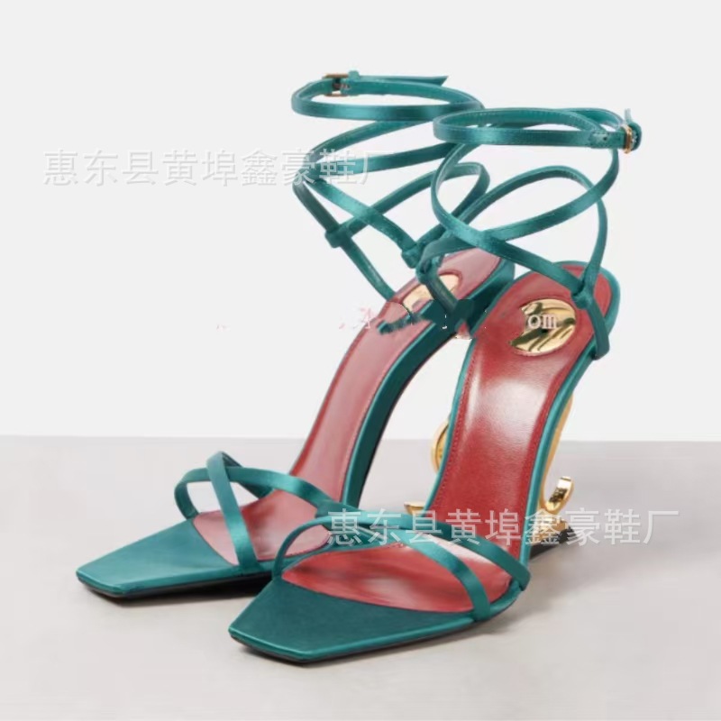 신하오 신발 공장 원라인 버클 스트랩 샌들 여성용 여름 2025 신상 유럽 및 미국 스타일 골드 레터 힐 섹시 하이힐