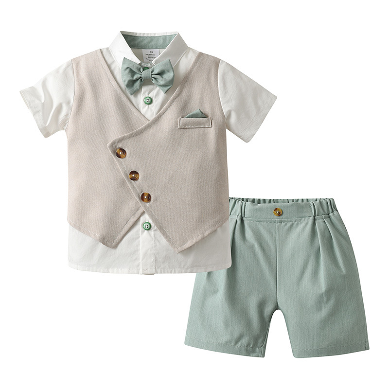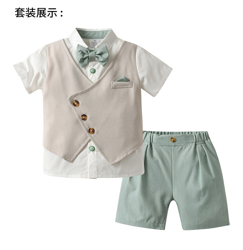첫 번째 소스 신사 세트 투피스 아동복 아기 여름 반팔 반바지 가짜 양복 조끼 소년 세트