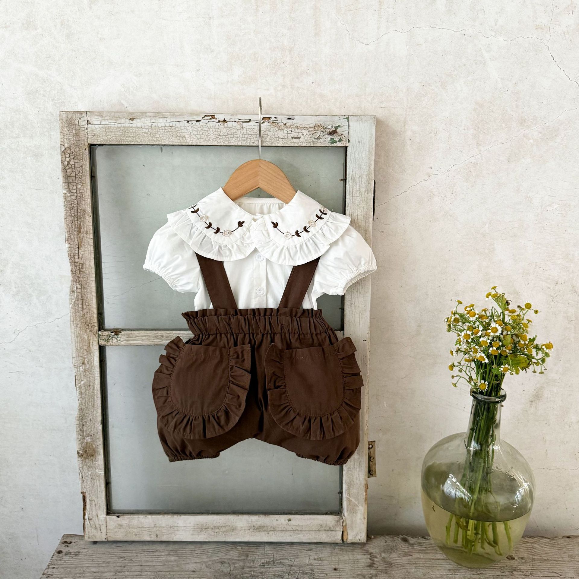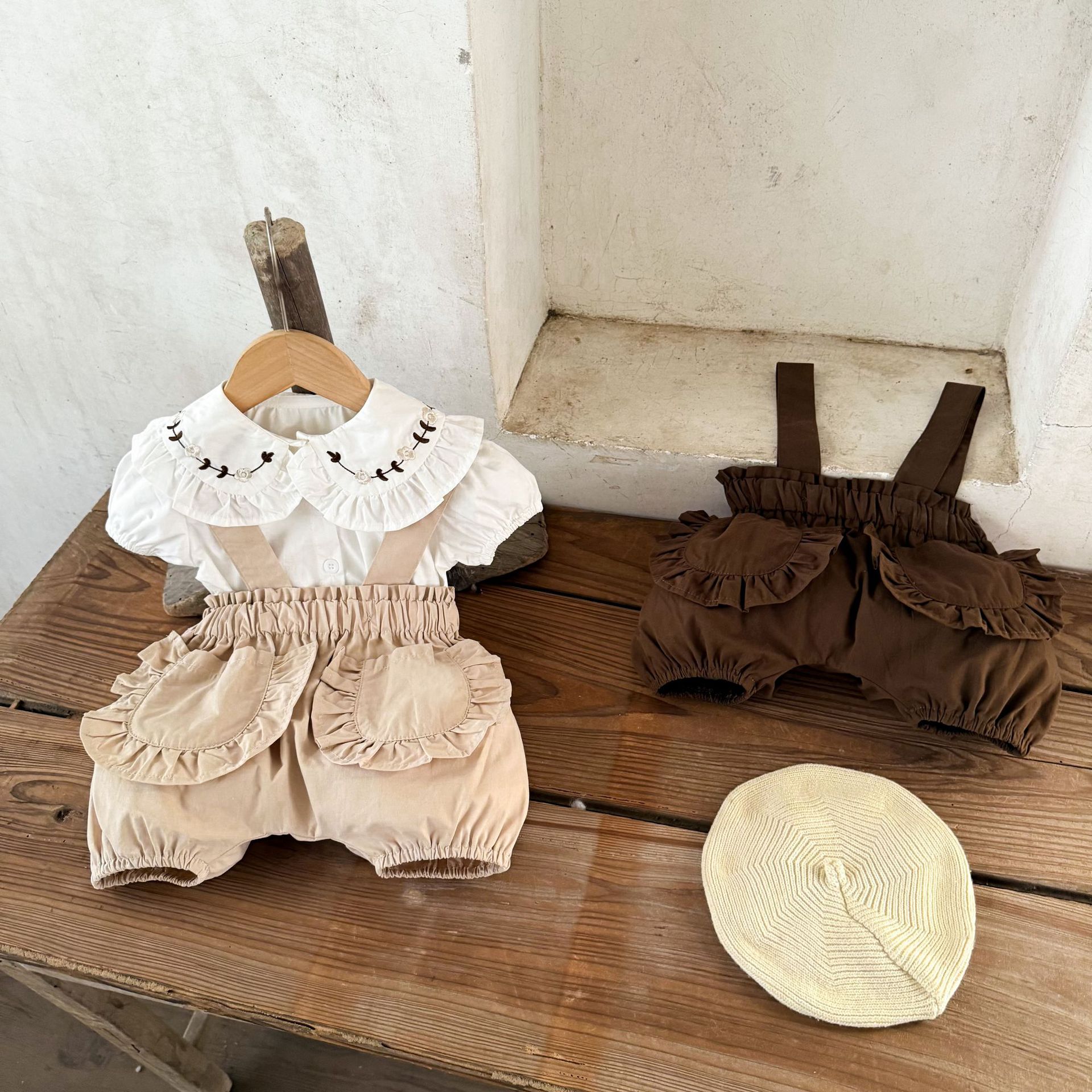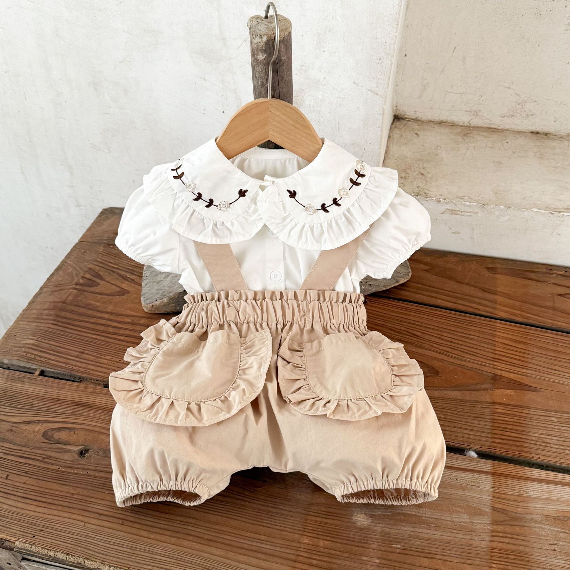 Ins 한국식 소녀 아기의 여름 자수 옷깃 반팔 셔츠 레이스 스트랩 세트 캐주얼 투피스 세트