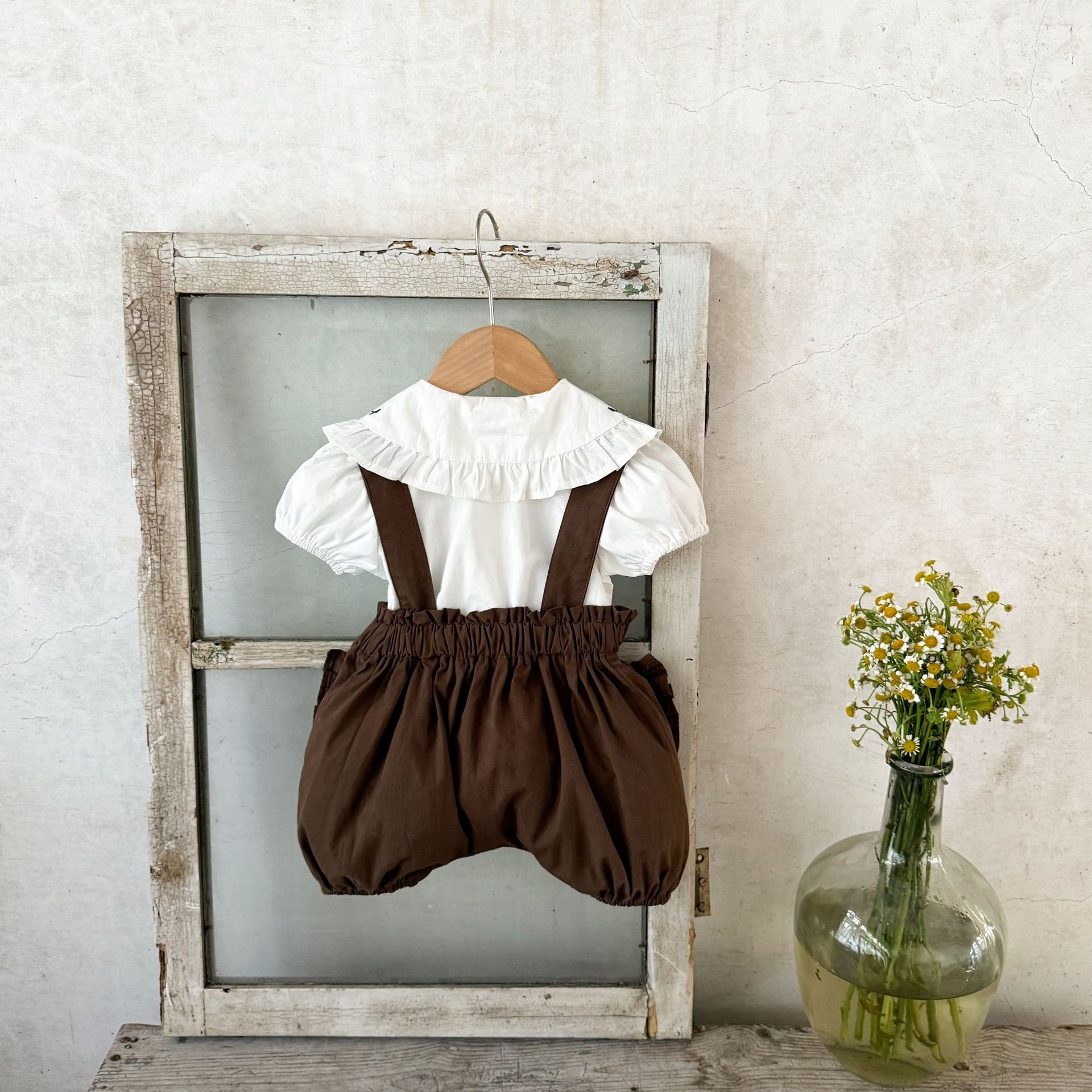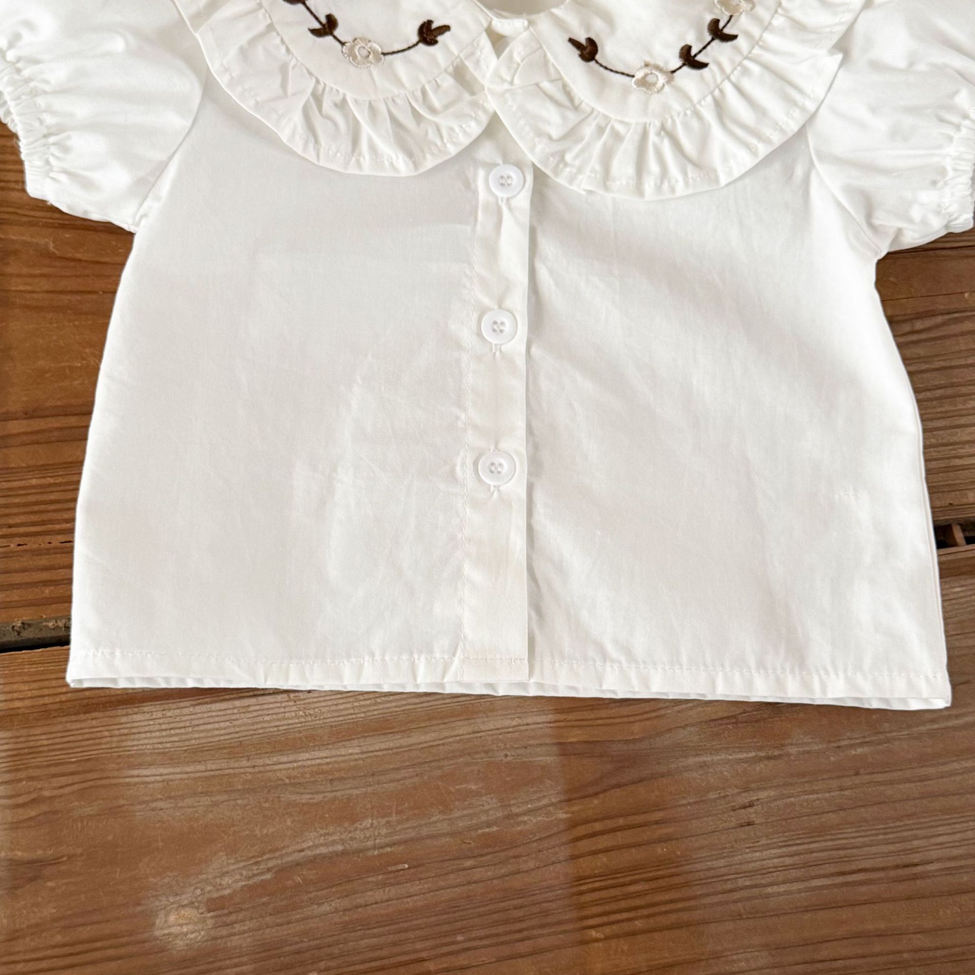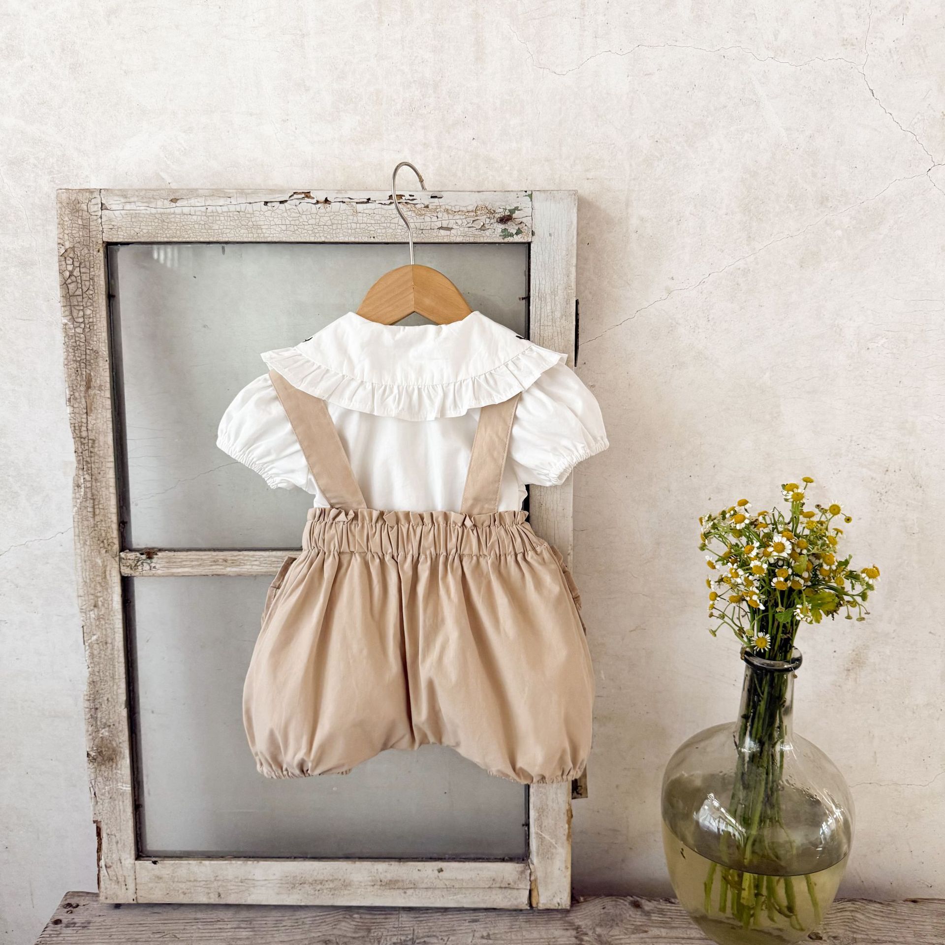 Ins 한국식 소녀 아기의 여름 자수 옷깃 반팔 셔츠 레이스 스트랩 세트 캐주얼 투피스 세트