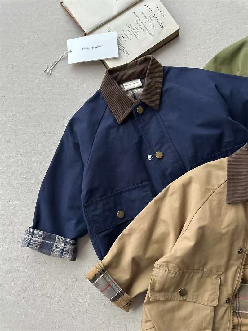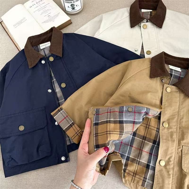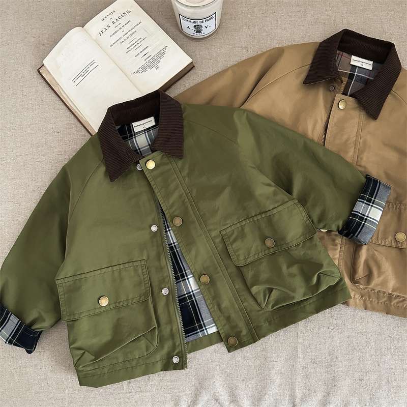 어린이 봄과 가을 코트 2025 소년 소녀를위한 봄 일본과 한국 패션 브랜드 격자 무늬 패치 워크 재킷 아기의 클래식 서양 패션스토어 가기