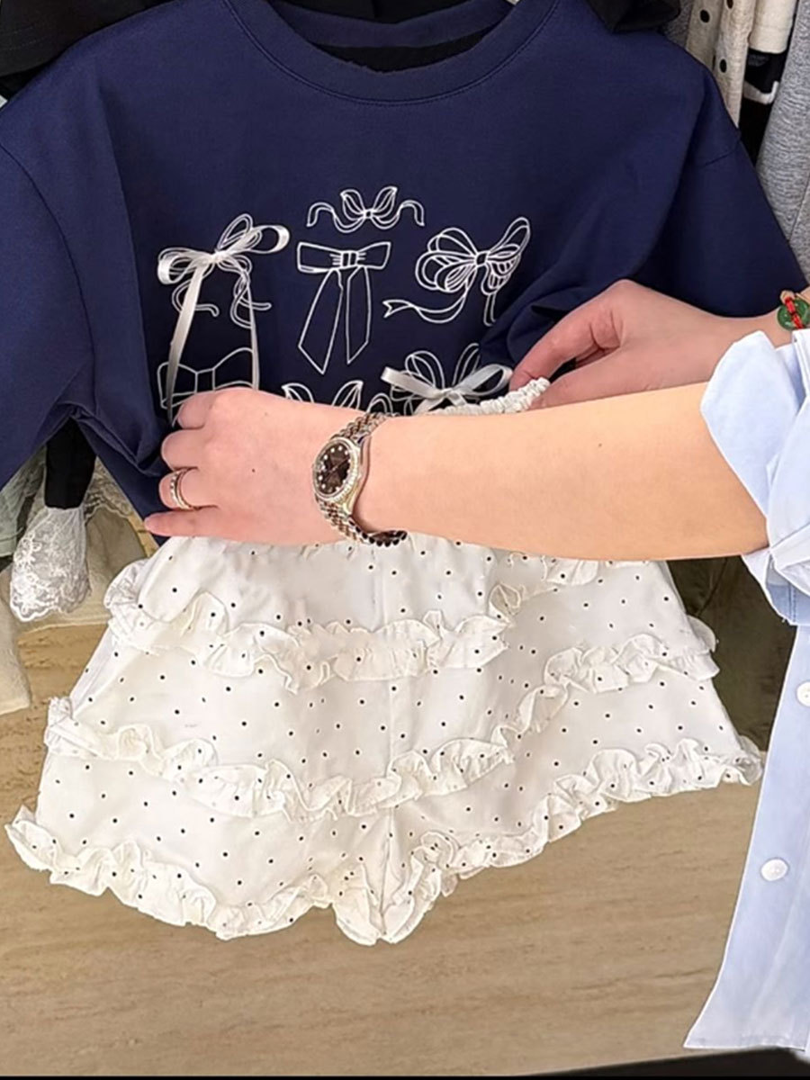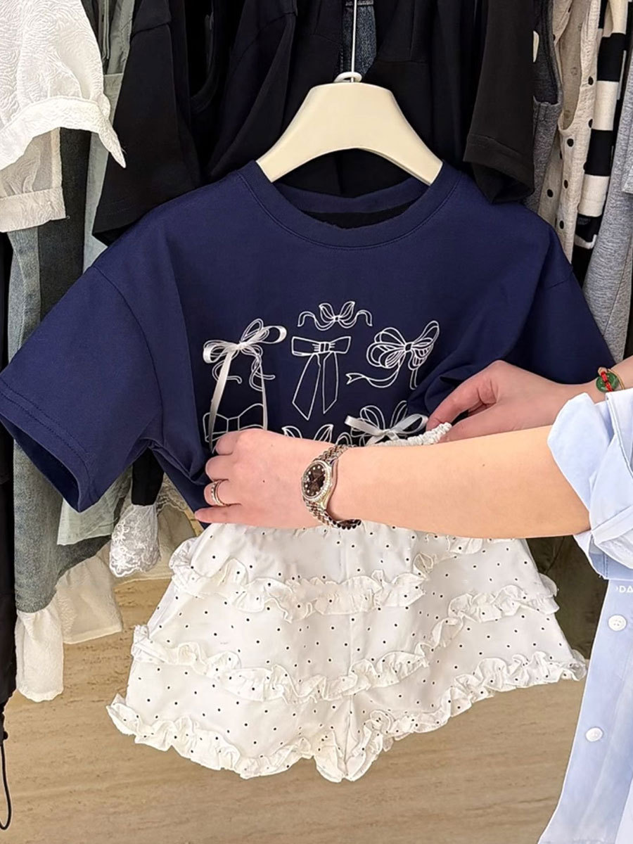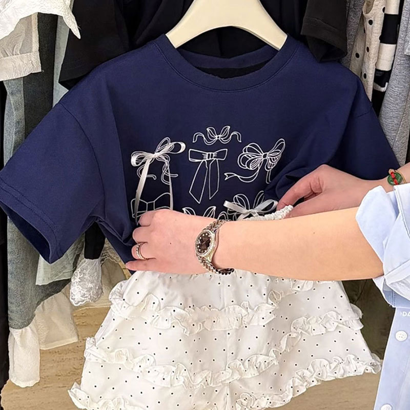 소녀 반팔 티셔츠 어린이 최고 봄과 여름 2025 새로운 큰 어린이 바닥 셔츠 소녀 네이비 옷 조수 1