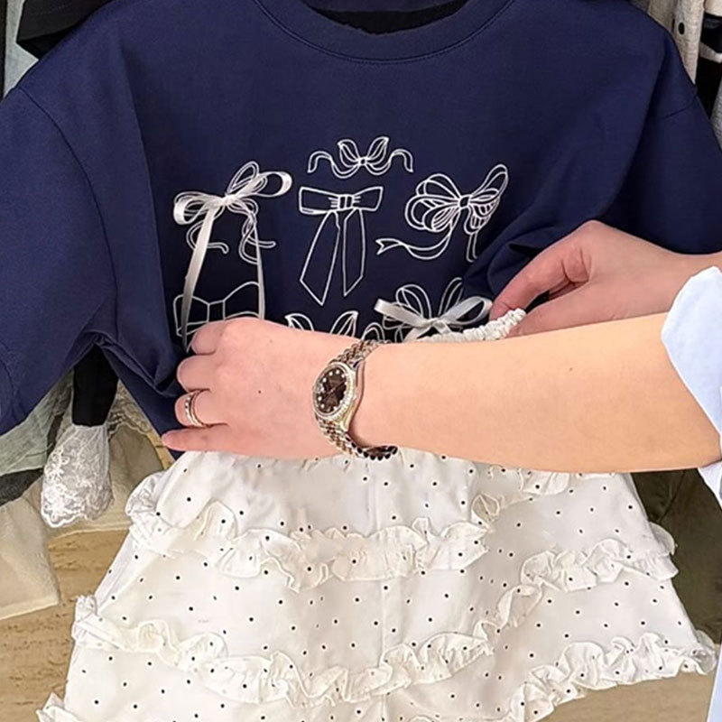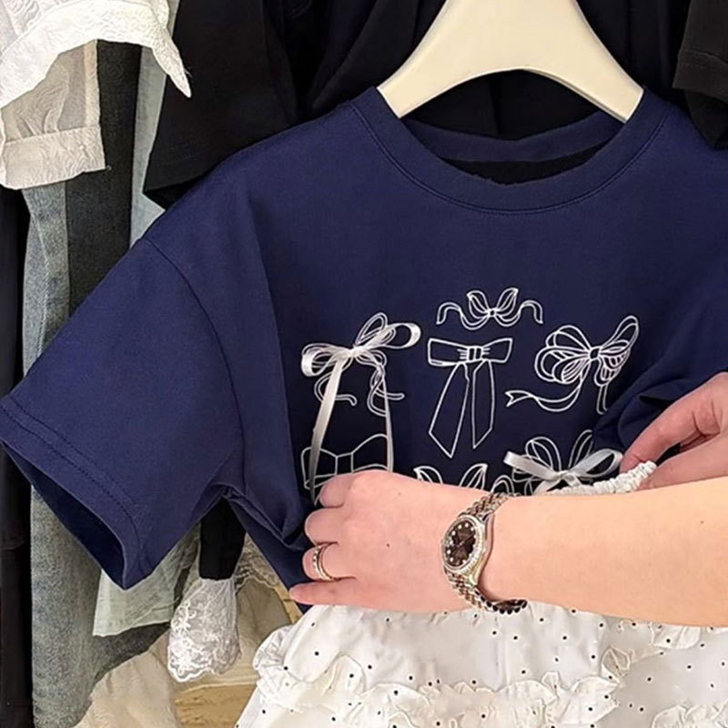소녀 반팔 티셔츠 어린이 최고 봄과 여름 2025 새로운 큰 어린이 바닥 셔츠 소녀 네이비 옷 조수 1스토어 가기