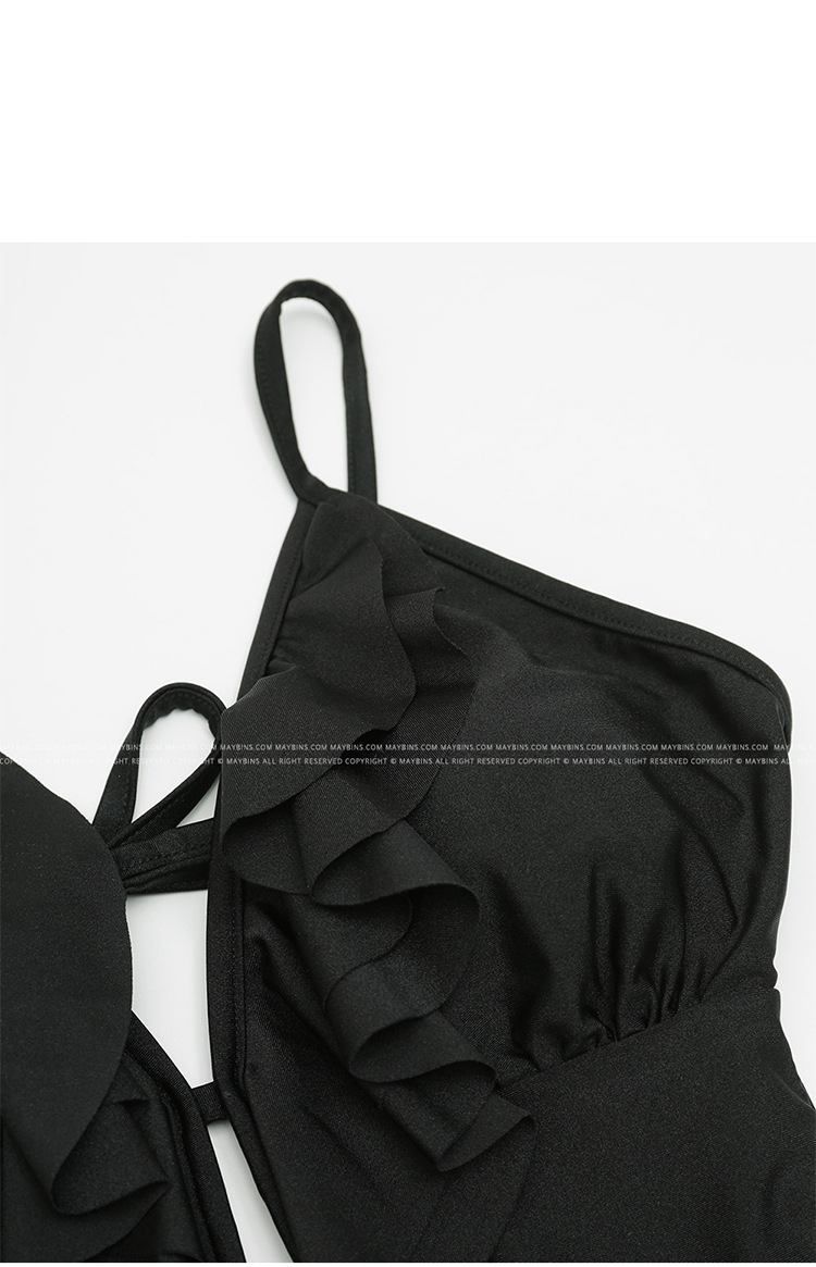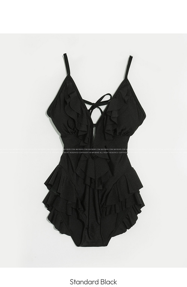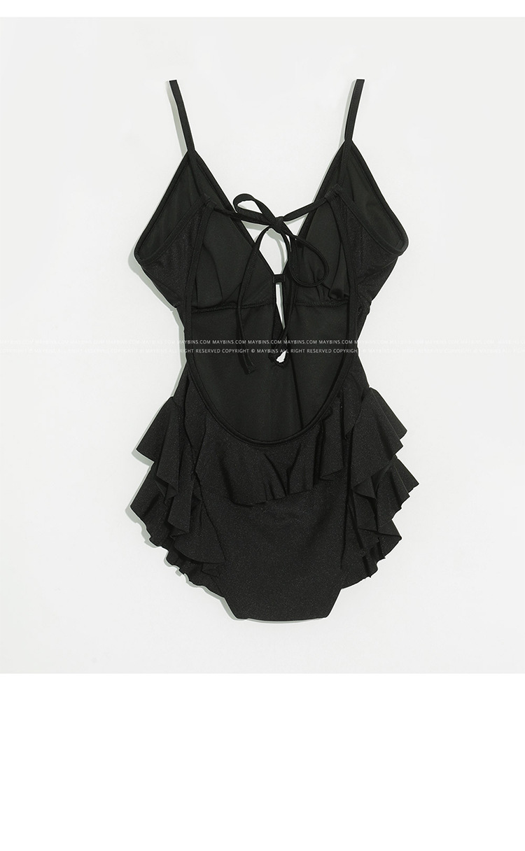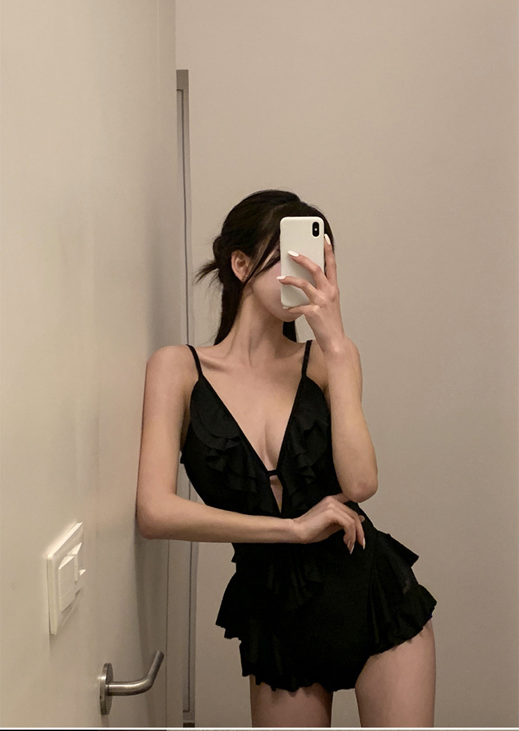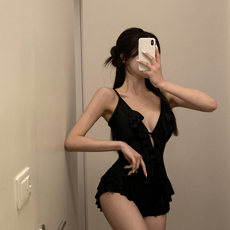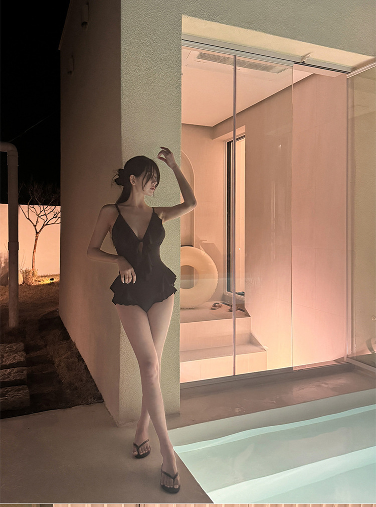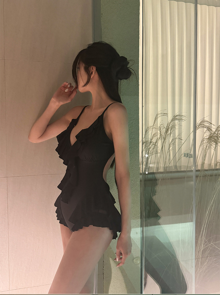 동대문 2025 한국 새로운 온천 백리스 멀티 레이어 솔리드 러플 V 칼라 스커트 수영복스토어 가기
