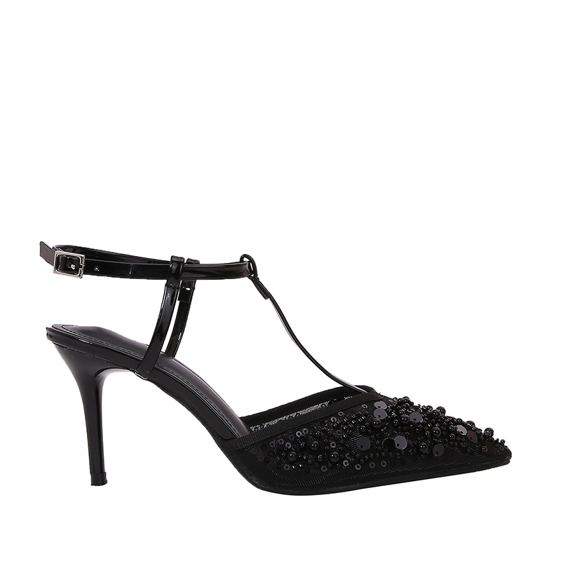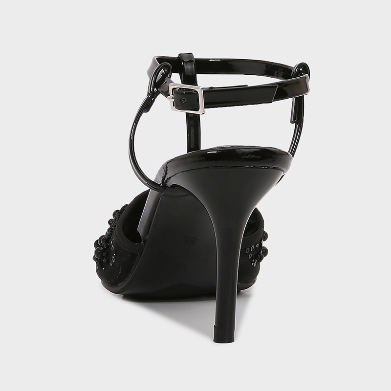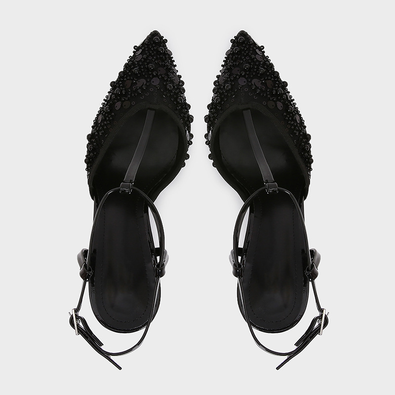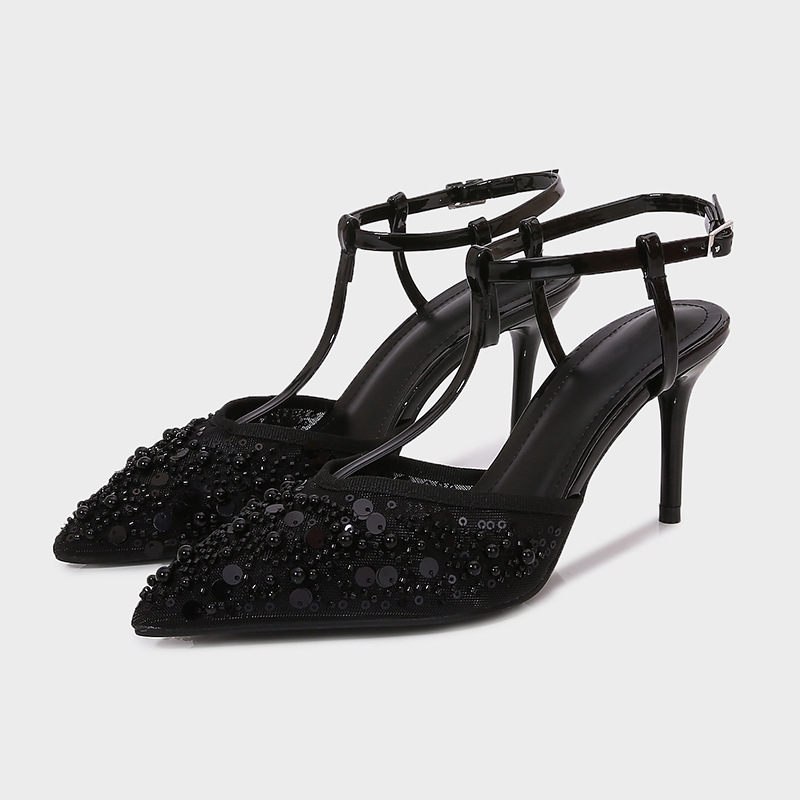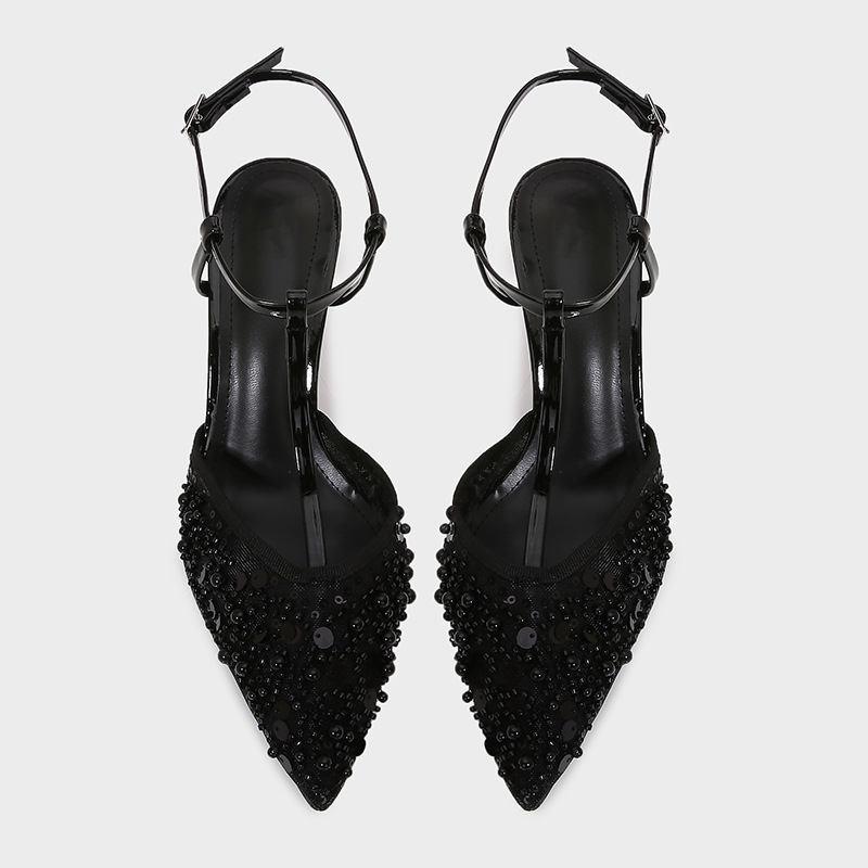ZA2025 여름 새로운 여성 신발 검은 구슬 패널 신발 메쉬 노출 된 뾰족한 하이힐 뮬러 샌들