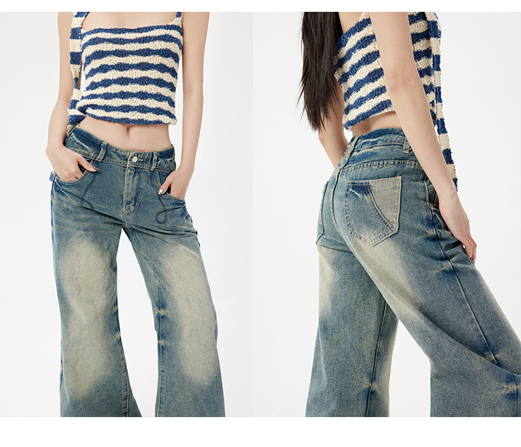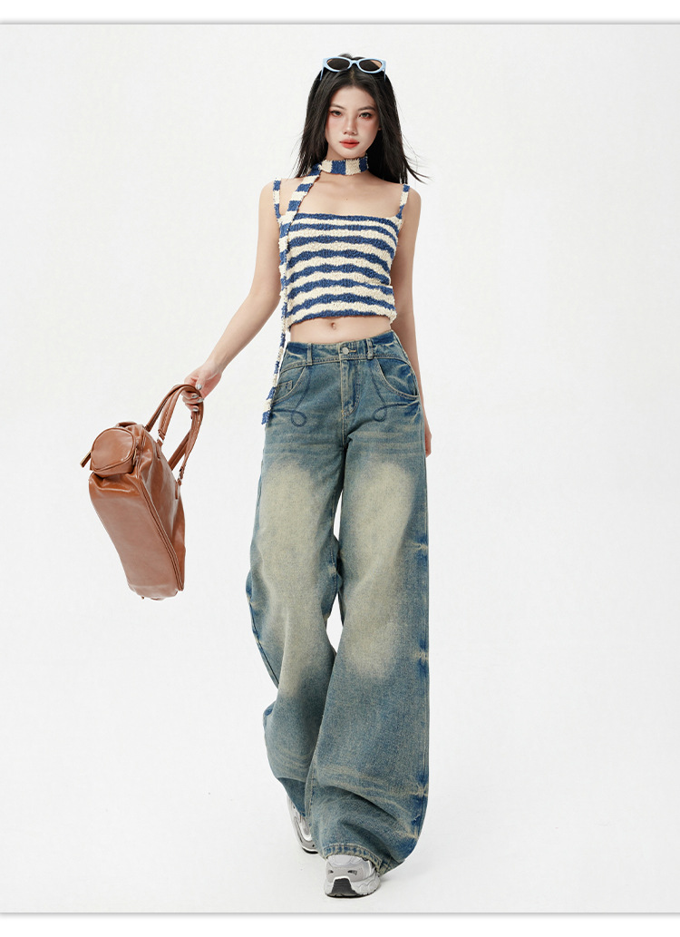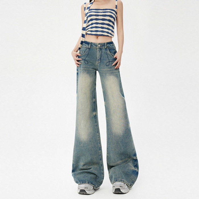 향수를 불러 일으키는 돌 그라인딩 블루 헤비 워시 청바지 미국 스타일 낮은 허리 스트레이트 다리 바지 느슨한 걸레 바지 및 더 긴 바지스토어 가기