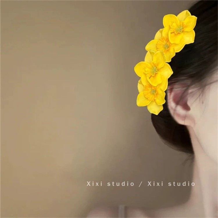 꽃과 데이트! 노란 쌍둥이 꽃 머리핀! 달콤하고 사랑스러운 사이드 클립 분위기 감각 앞머리 클립 헤어 클립