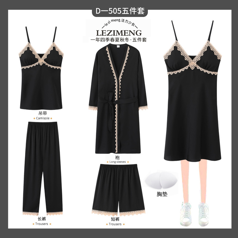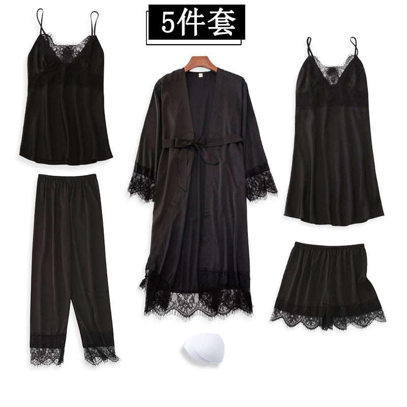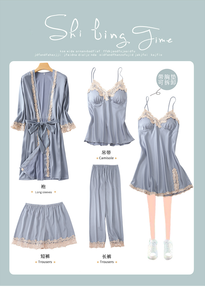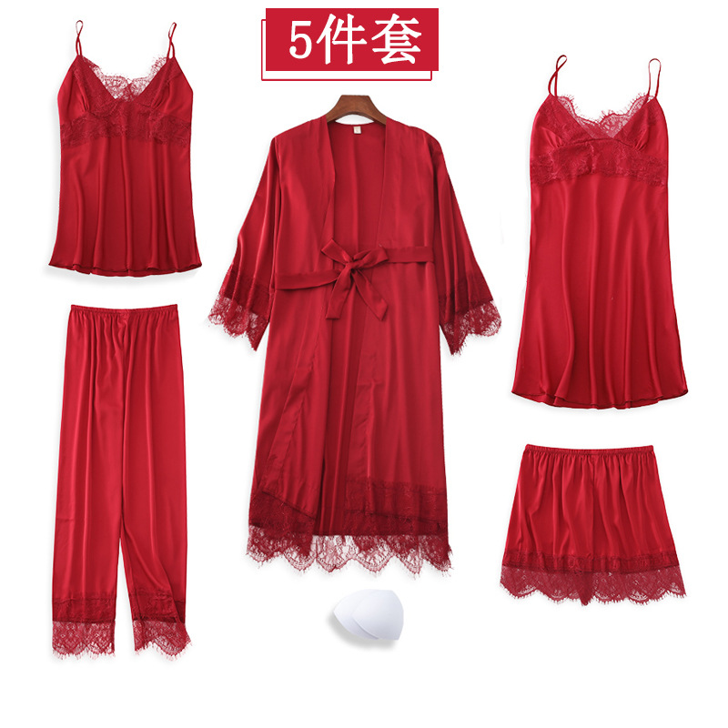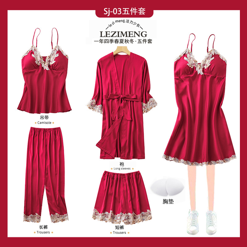 여성을위한 얼음 실크 잠옷 봄과 여름 새로운 긴팔 하이 엔드 달콤한 실크 홈웨어 5 피스 세트