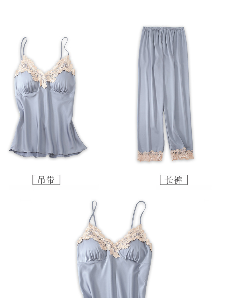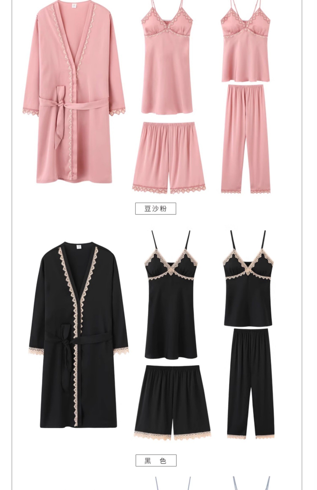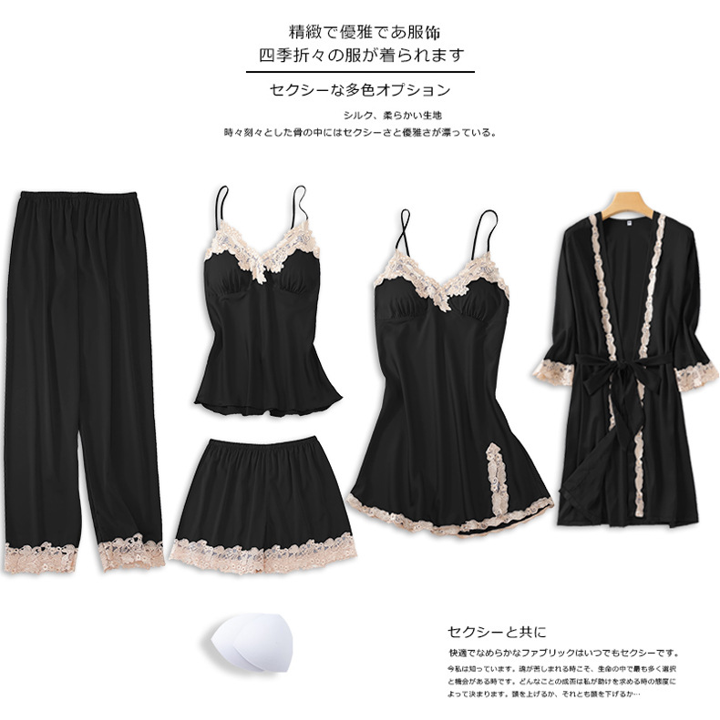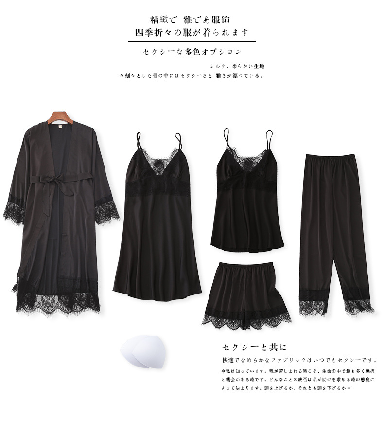 여성을위한 얼음 실크 잠옷 봄과 여름 새로운 긴팔 하이 엔드 달콤한 실크 홈웨어 5 피스 세트