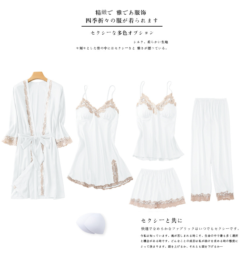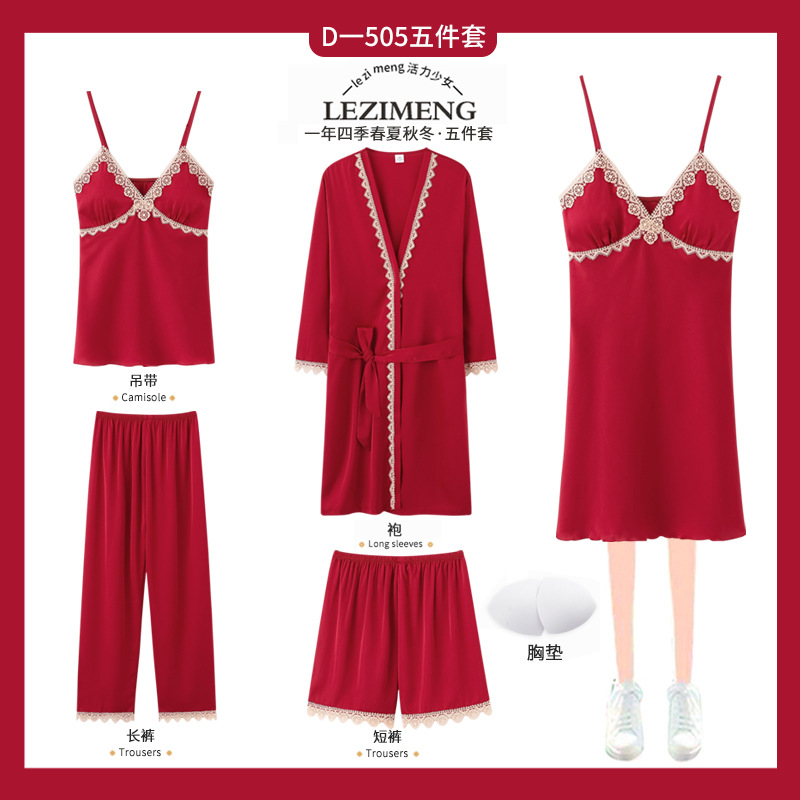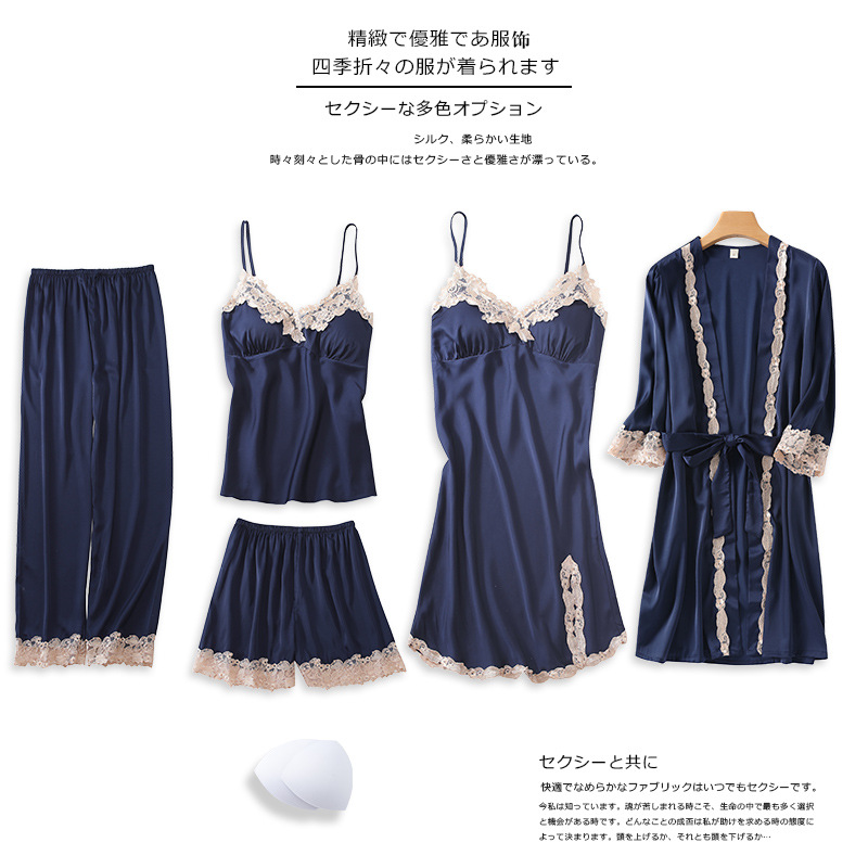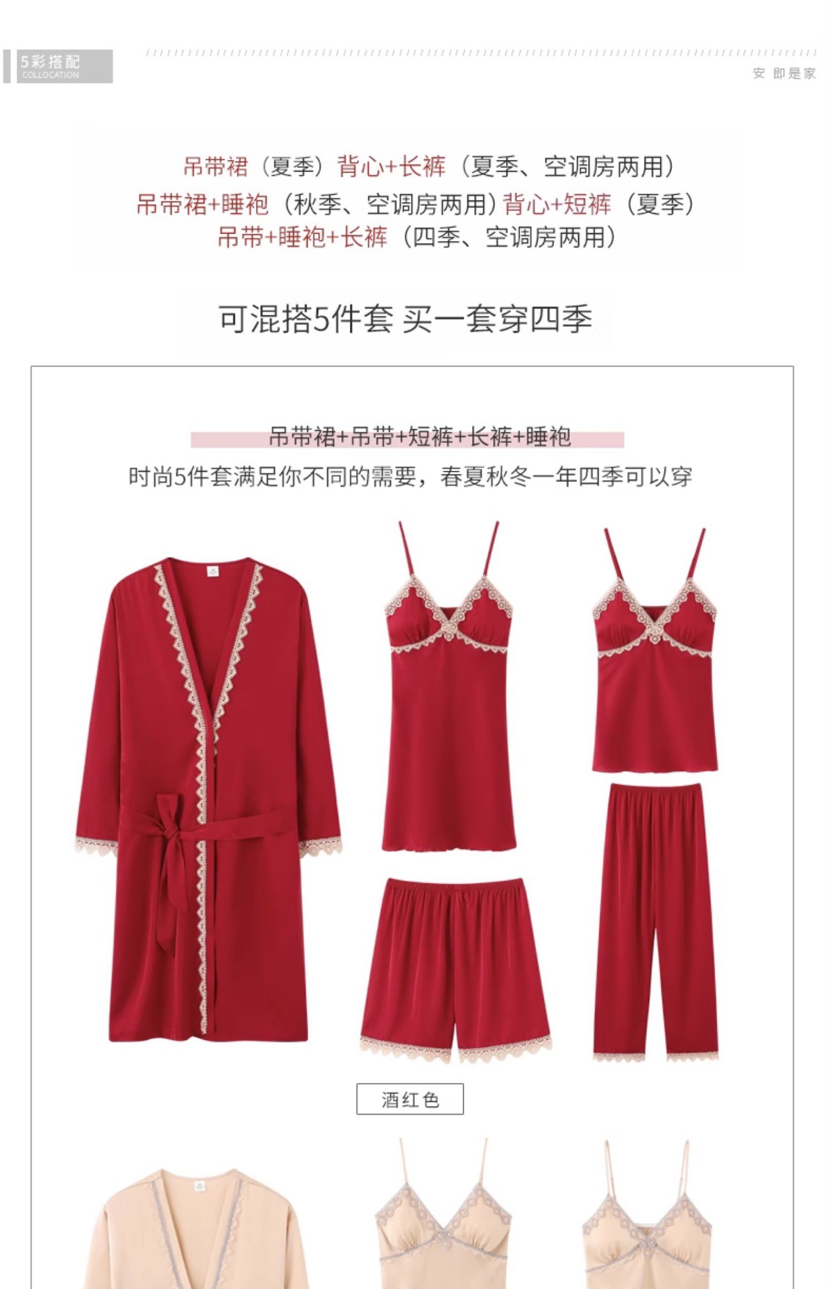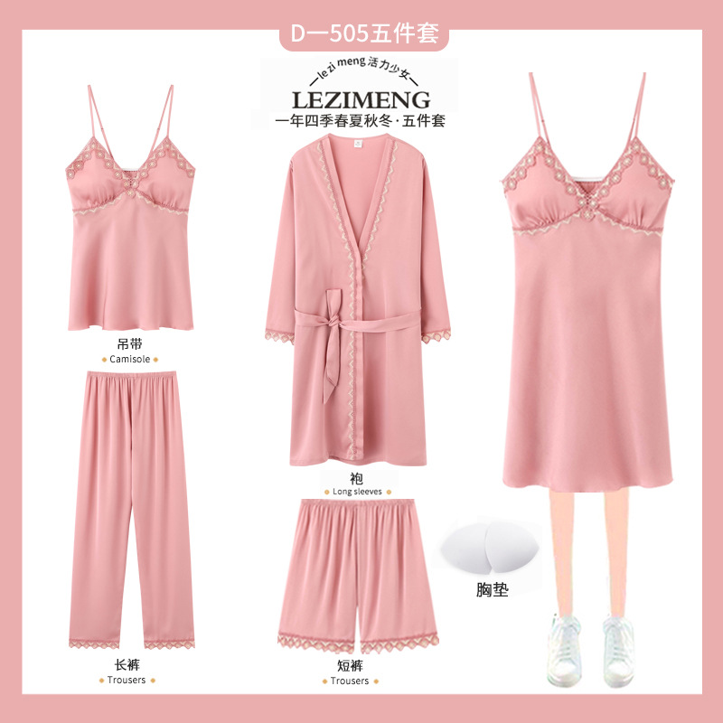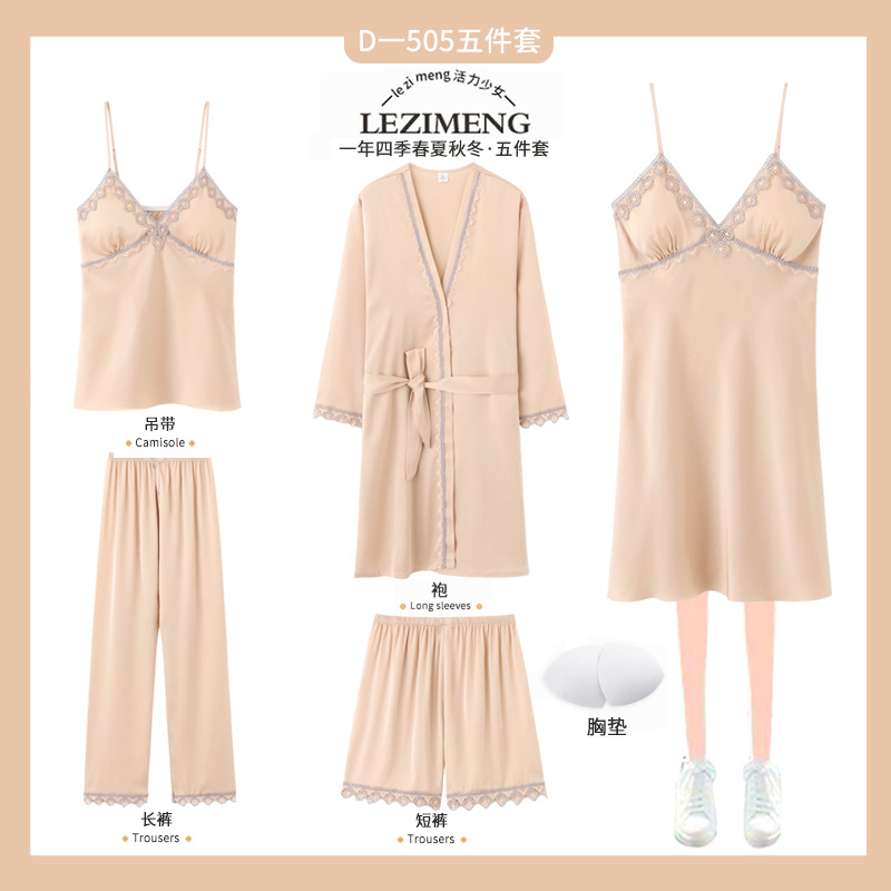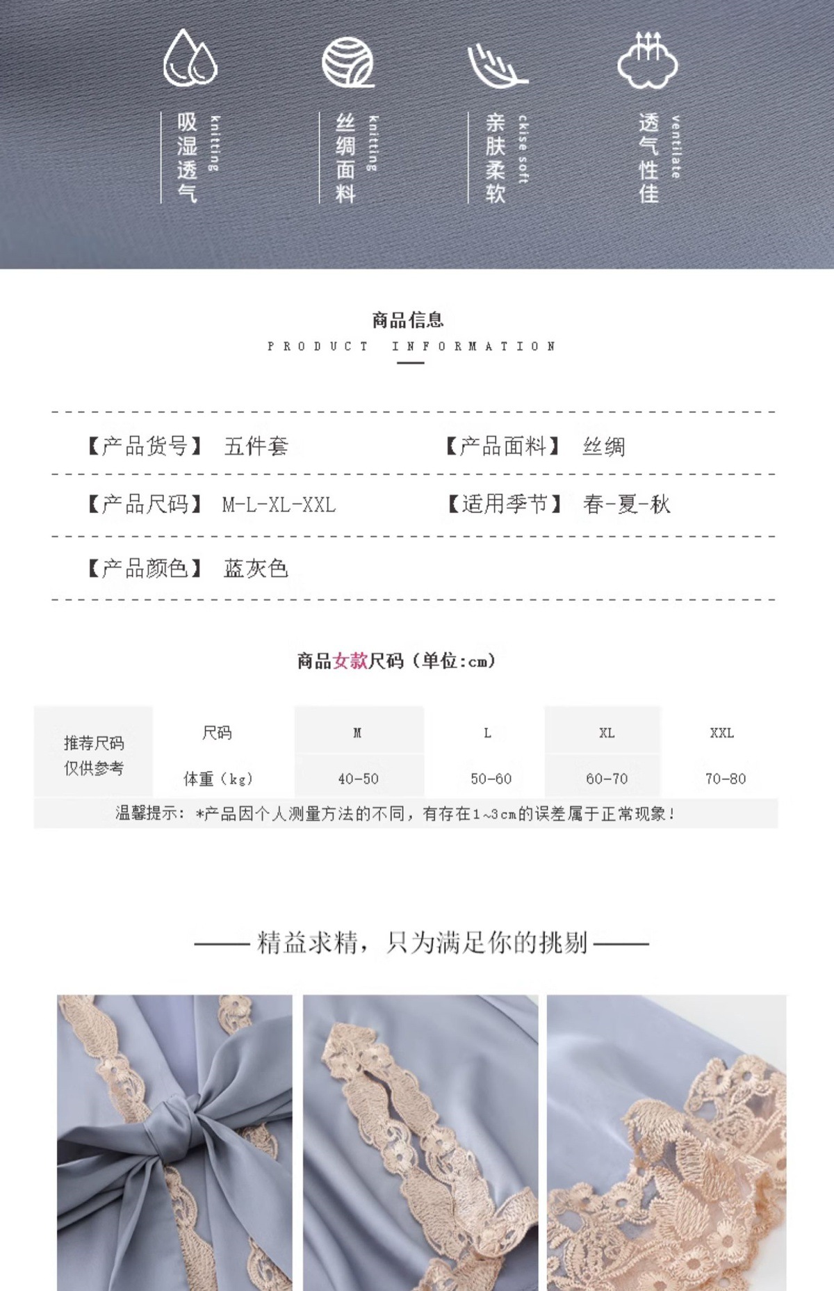 여성을위한 얼음 실크 잠옷 봄과 여름 새로운 긴팔 하이 엔드 달콤한 실크 홈웨어 5 피스 세트스토어 가기
