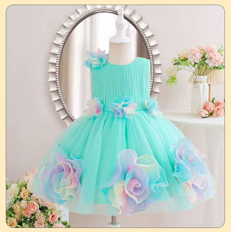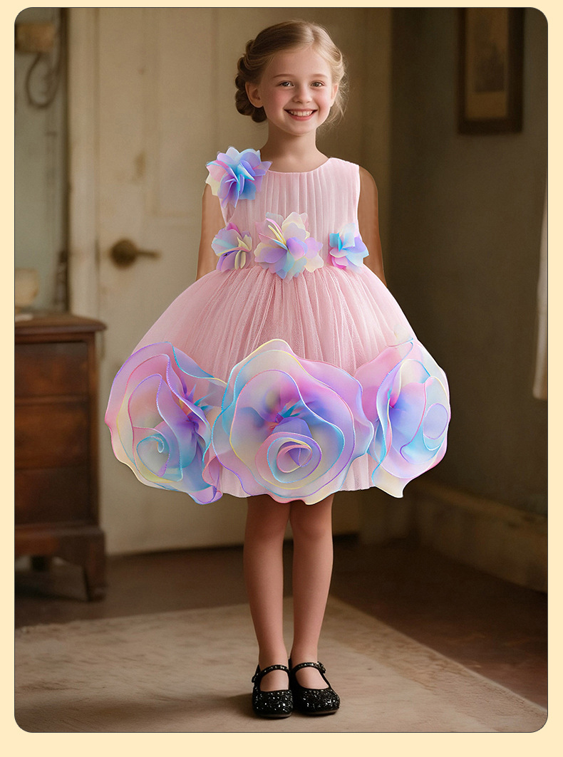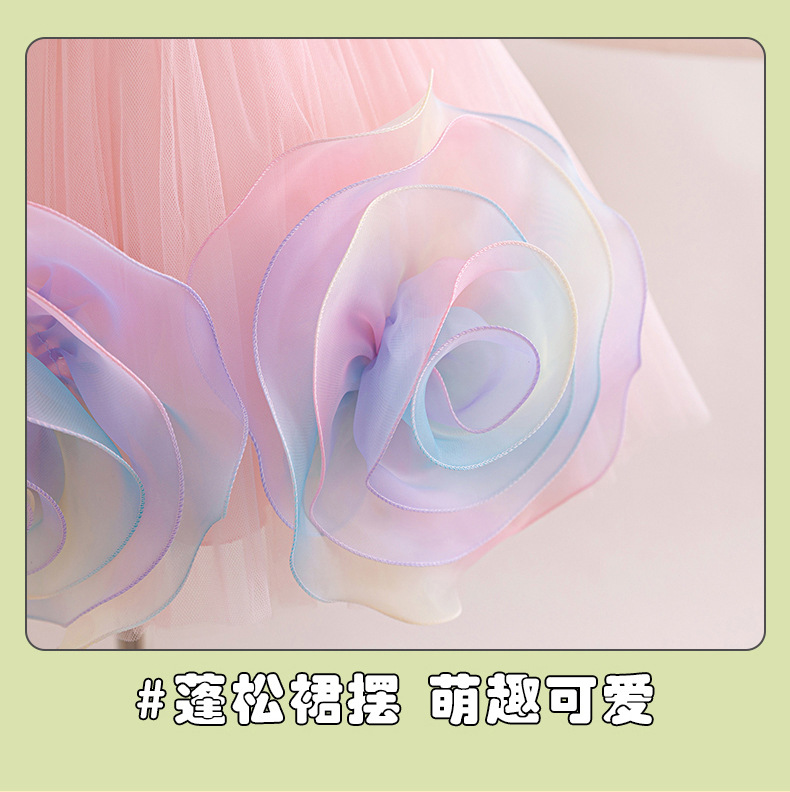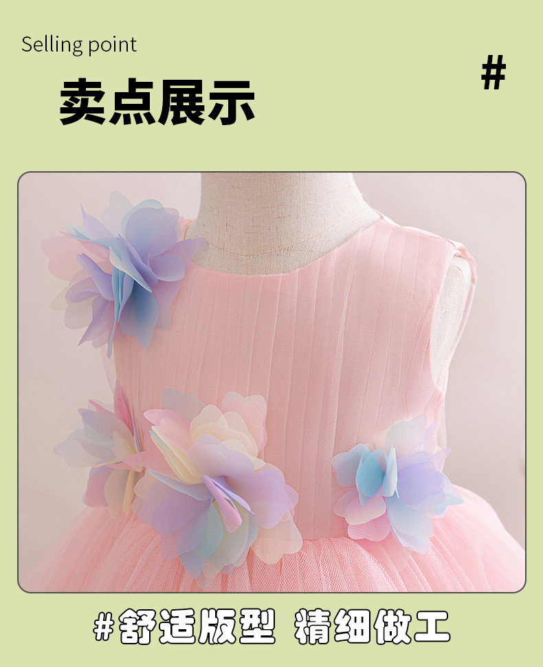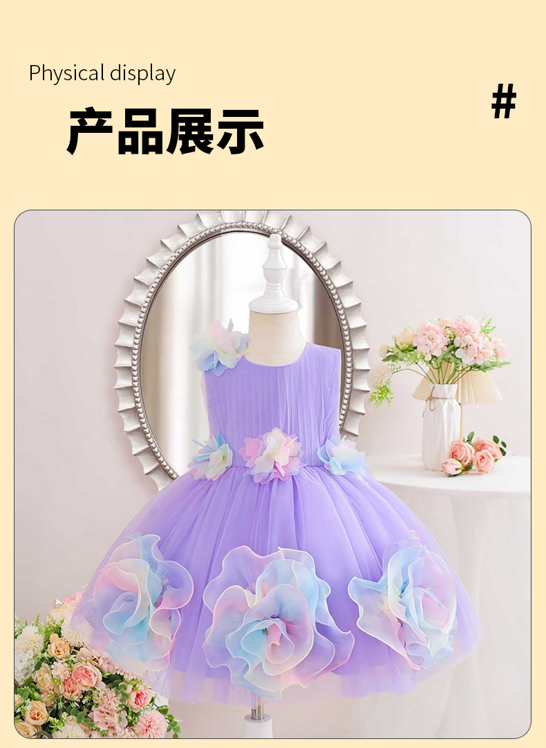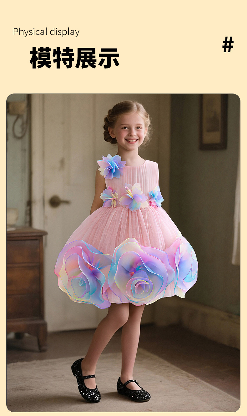 0-100-110-120码-130码    新款跨境女童连衣裙彩色花朵网纱公主裙小花童婚礼晚宴女童礼服裙