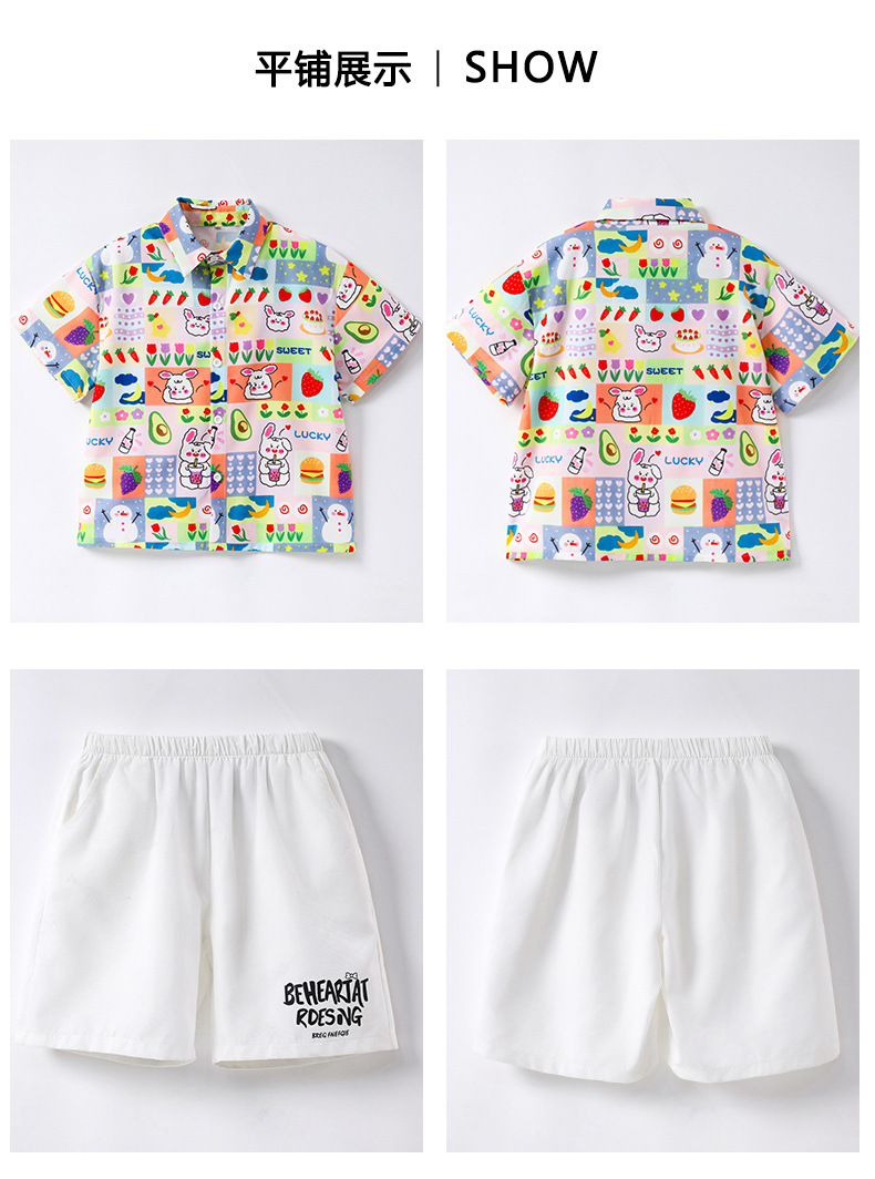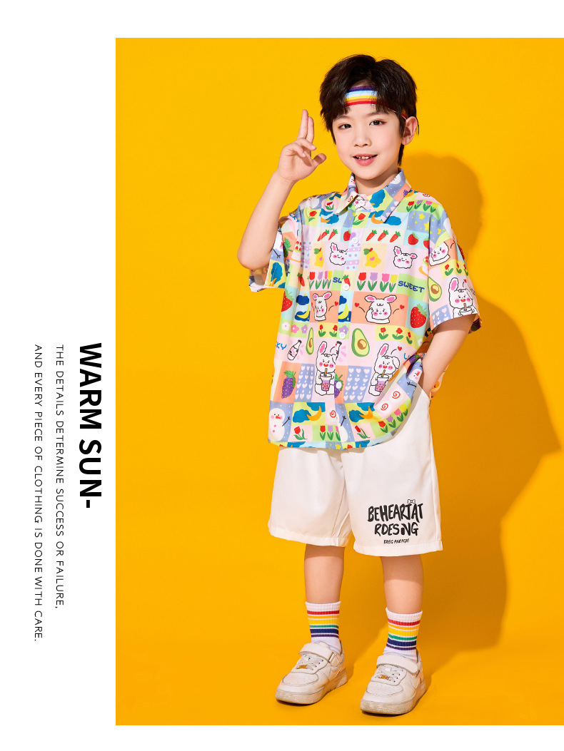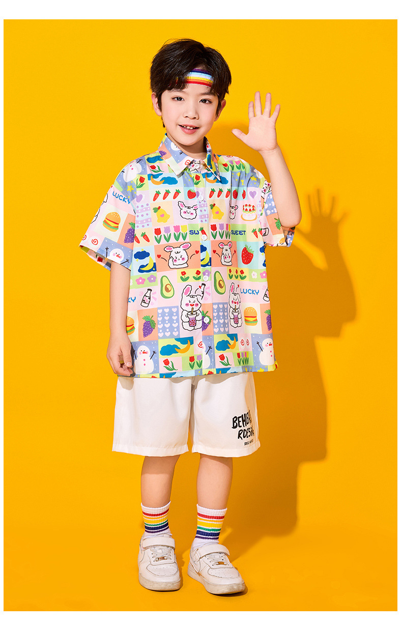 • 반팔 셔츠 + 흰색 반바지 + 무지개 머리띠
