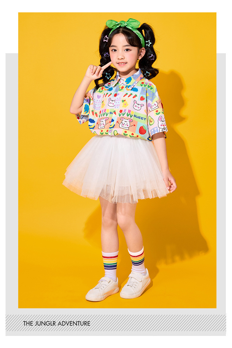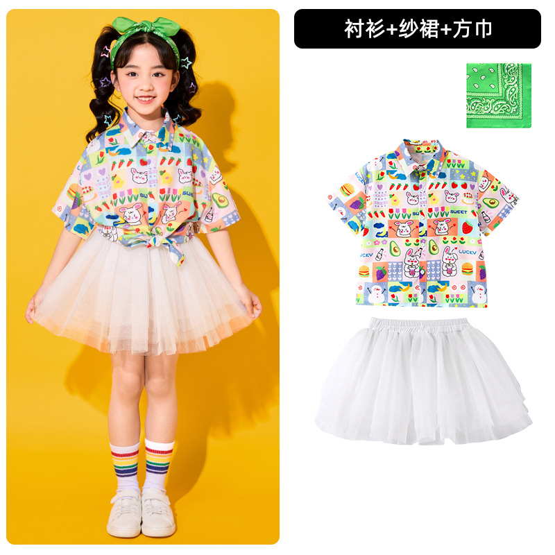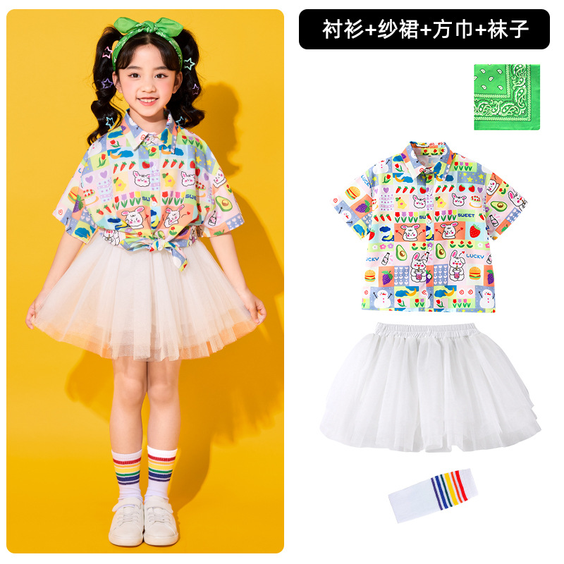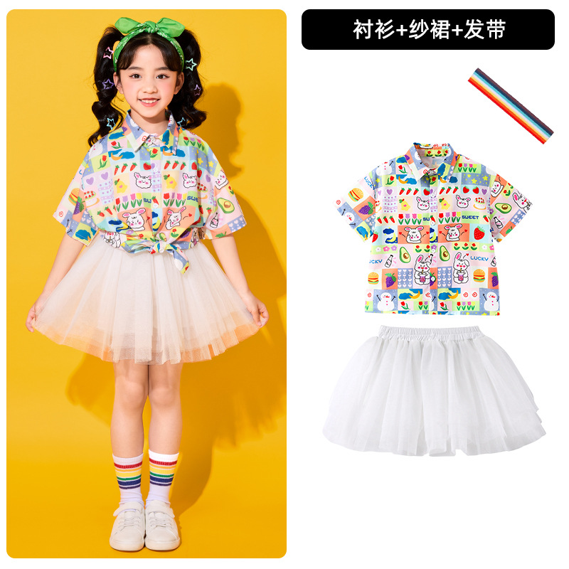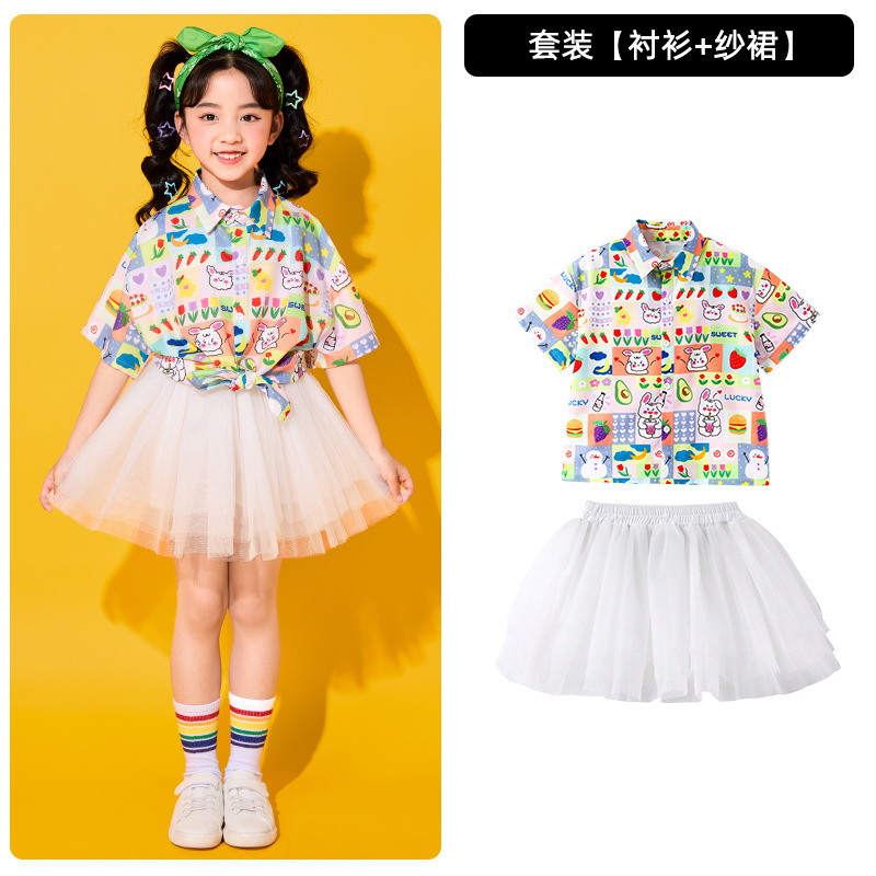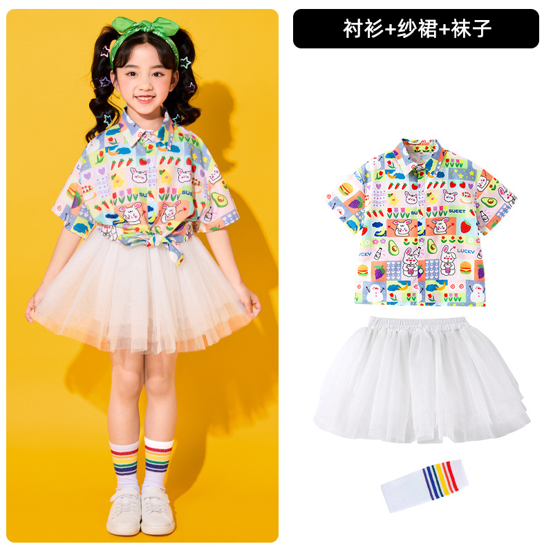 어린이 치어리딩 의상, 초등학교 체육복, 여아 셔츠, 거즈 스커트, 유치원 합창복