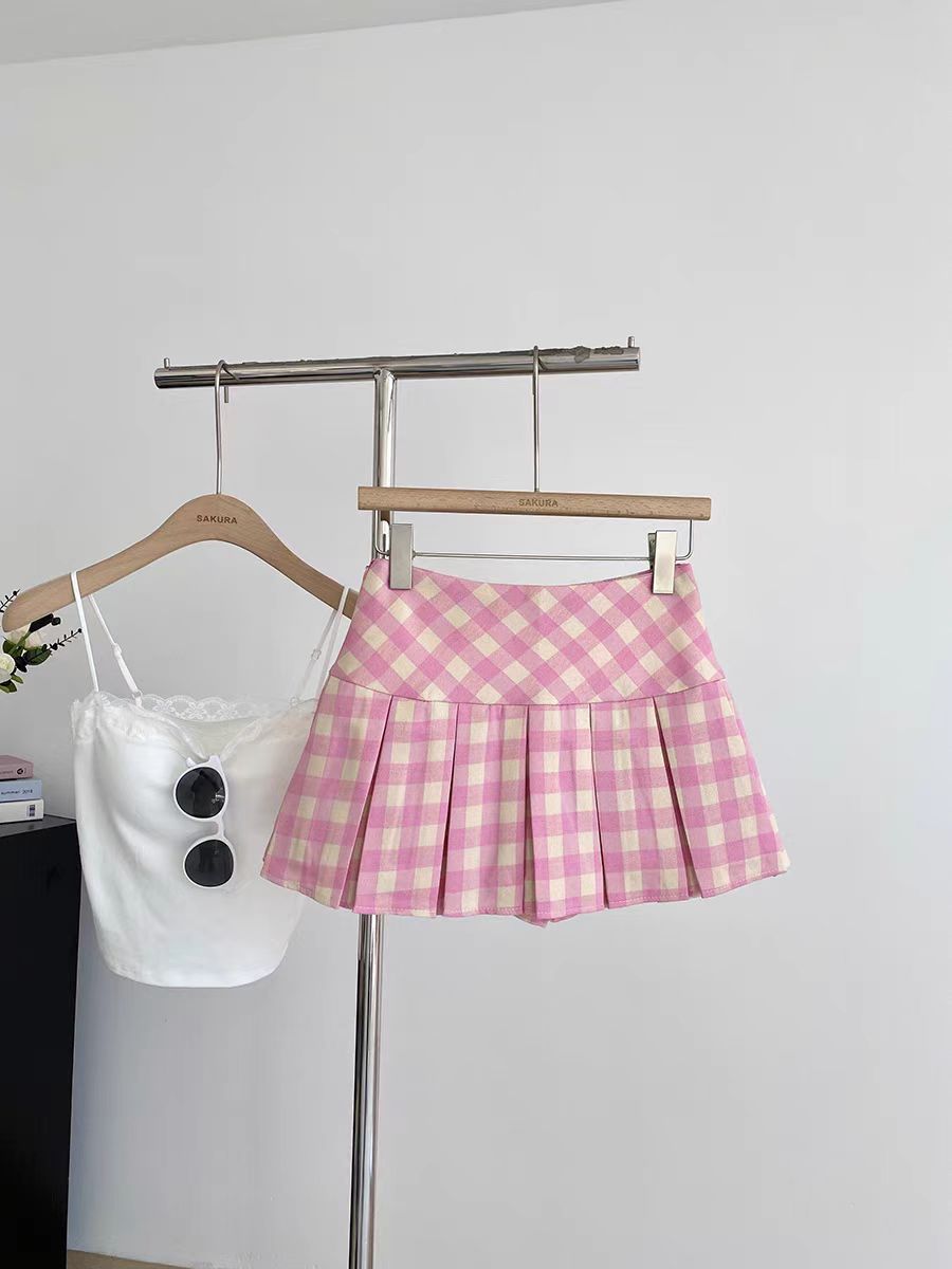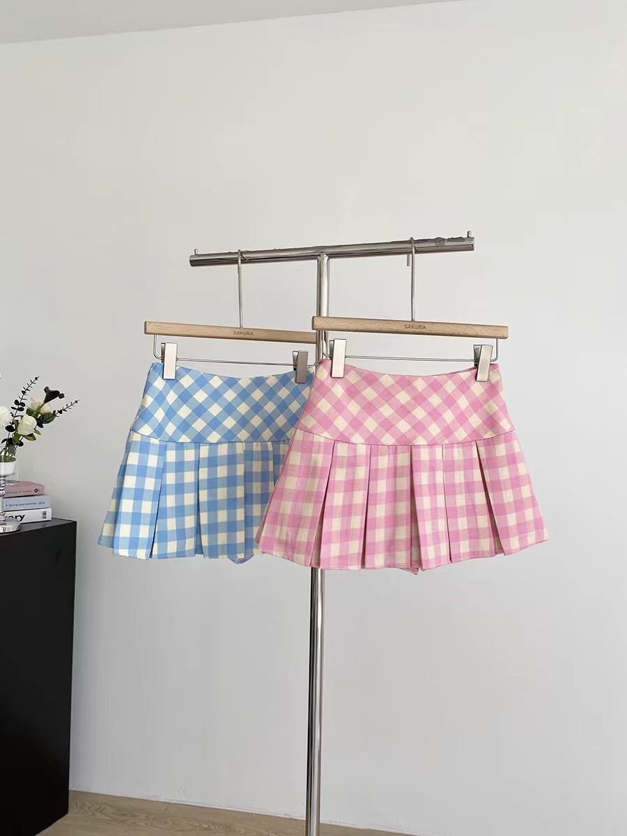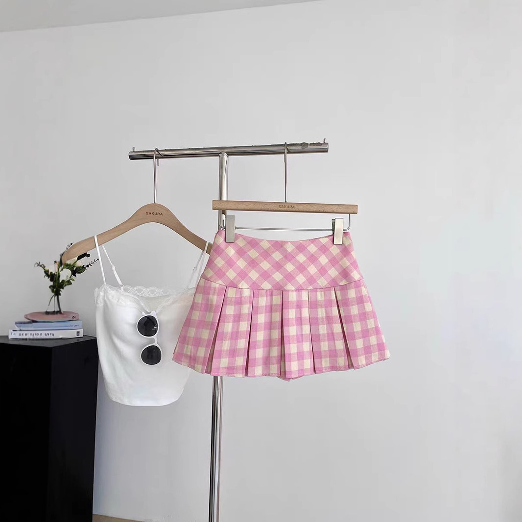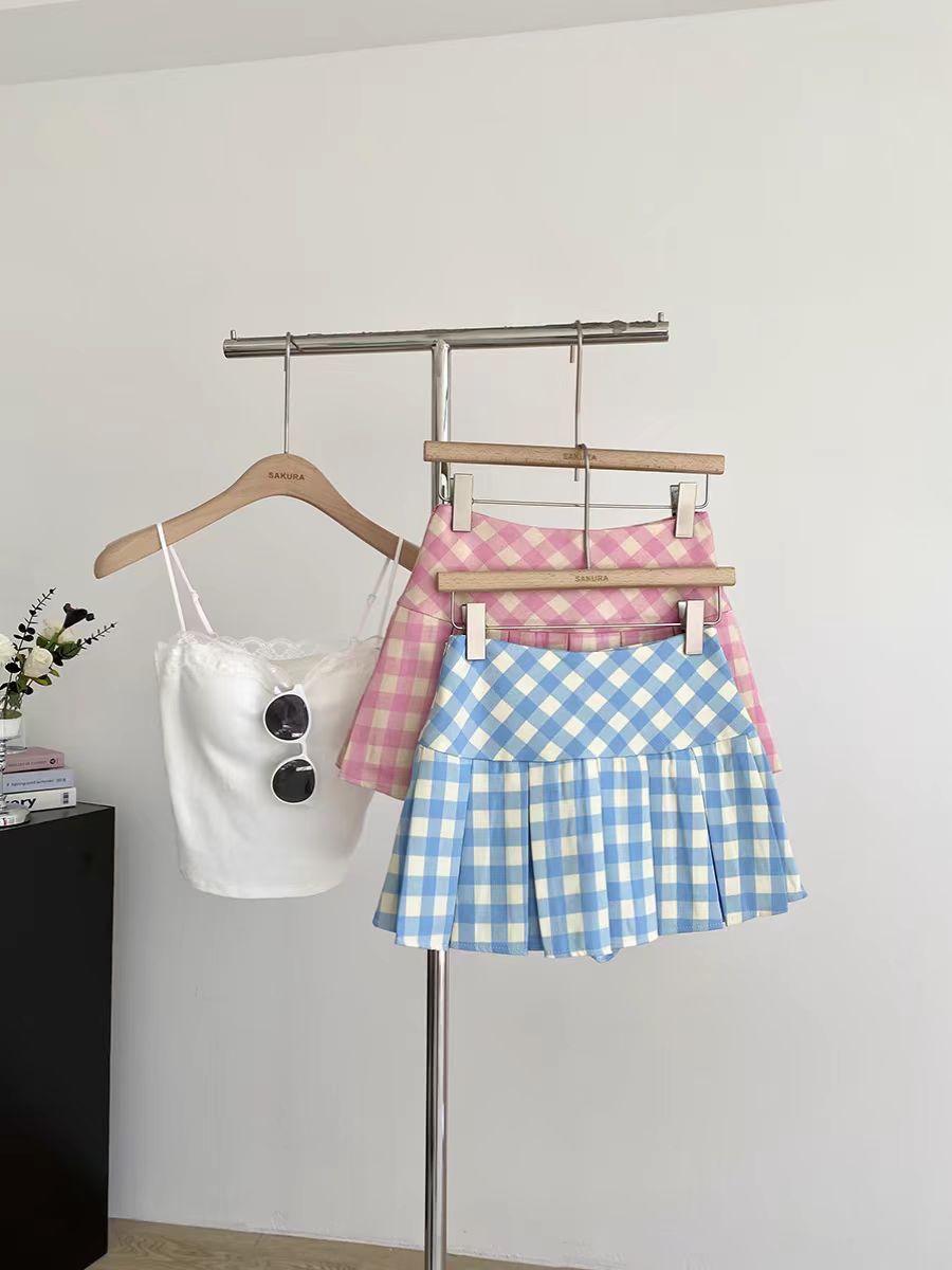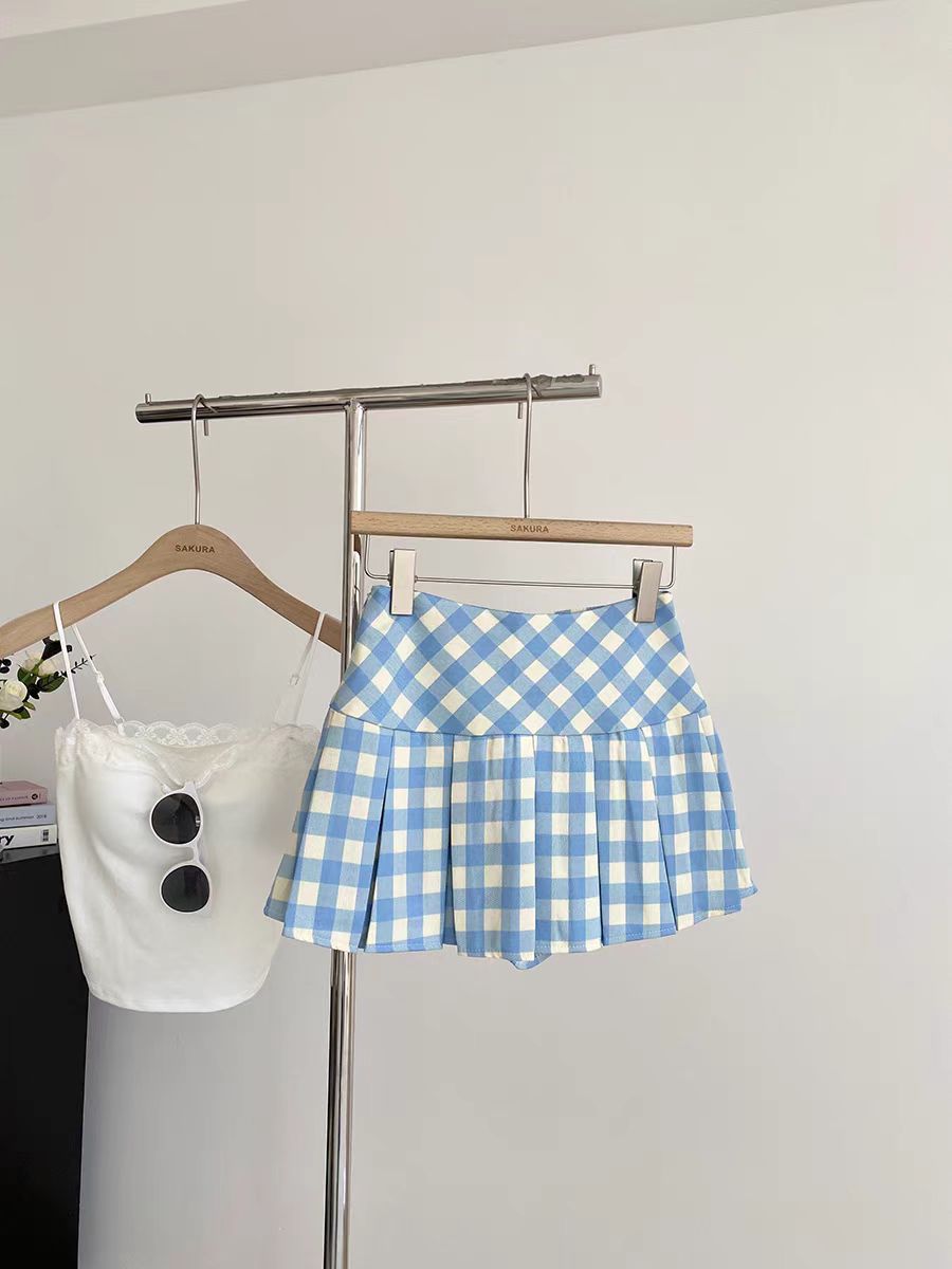 달콤한 체크무늬 블루 플리츠 스커트 여아용 봄 여름 2026년 신상 한국 스타일 노출방지 하이웨이스트 스커트스토어 가기