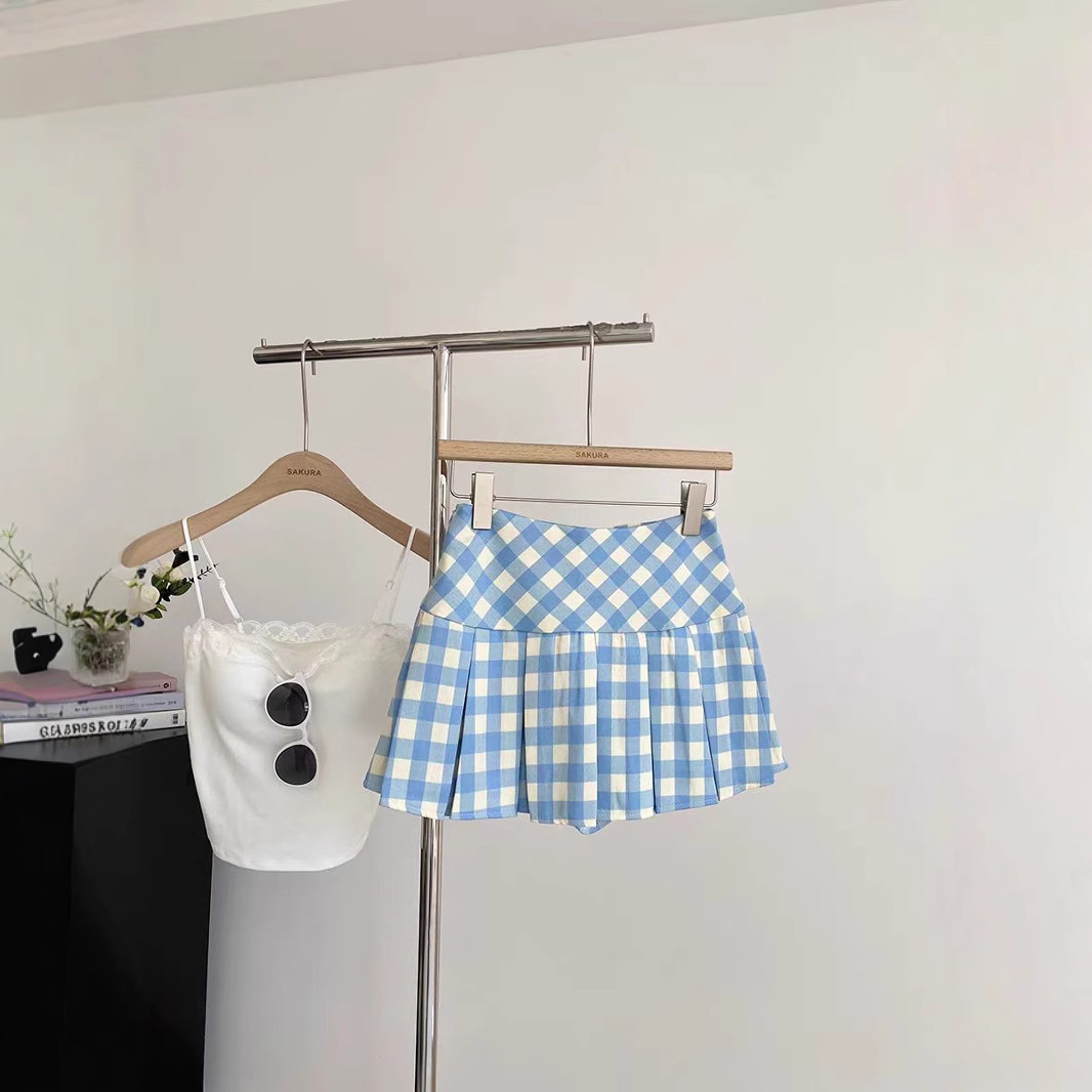 달콤한 체크무늬 블루 플리츠 스커트 여아용 봄 여름 2026년 신상 한국 스타일 노출방지 하이웨이스트 스커트