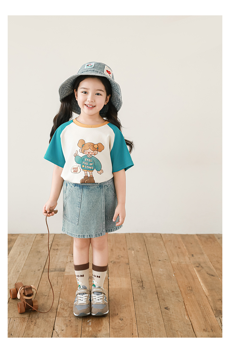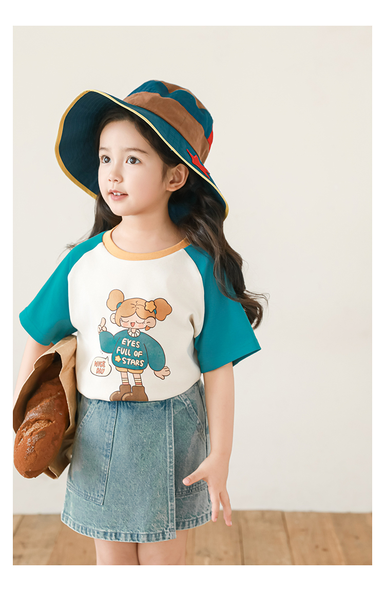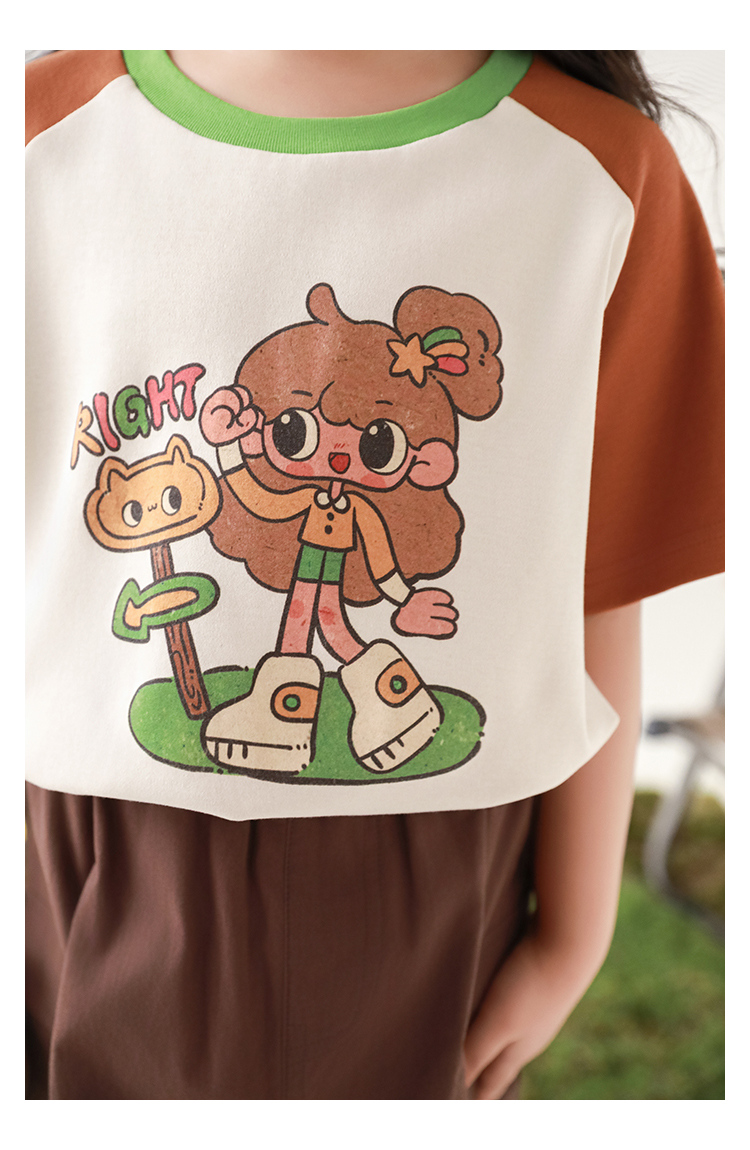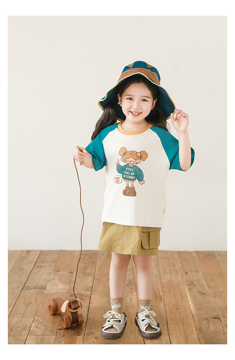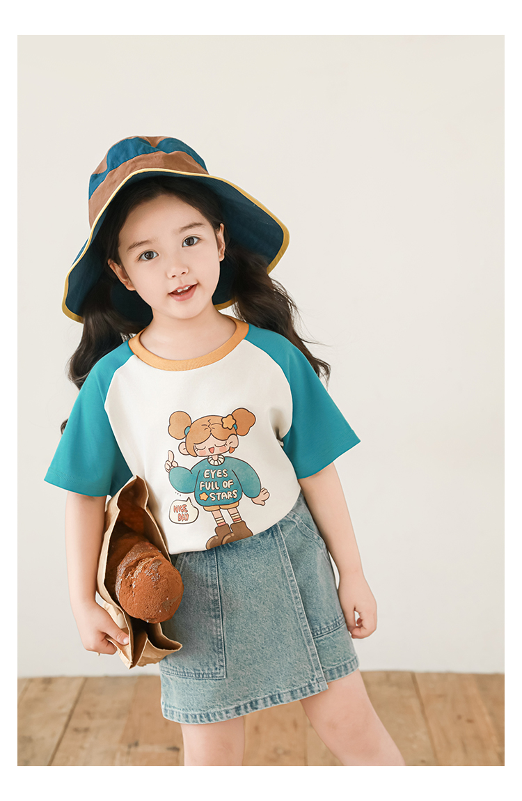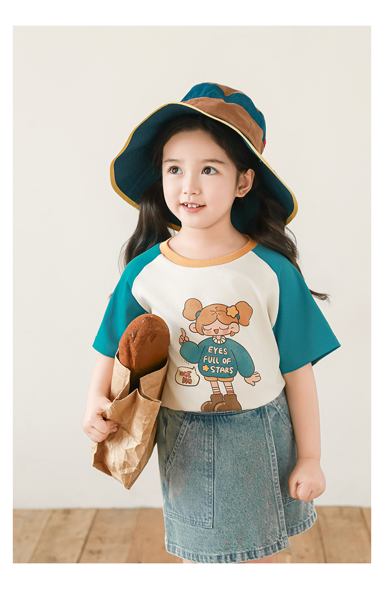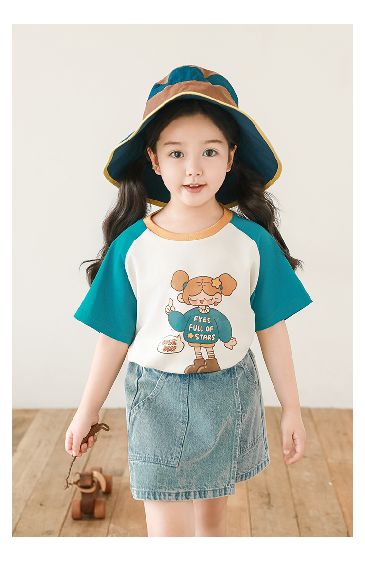 Wulibuyi 소녀 만화 프린트 라글란 슬리브 티셔츠 2025 여름 경량 대비 색상 골지 반팔 탑 트렌디스토어 가기