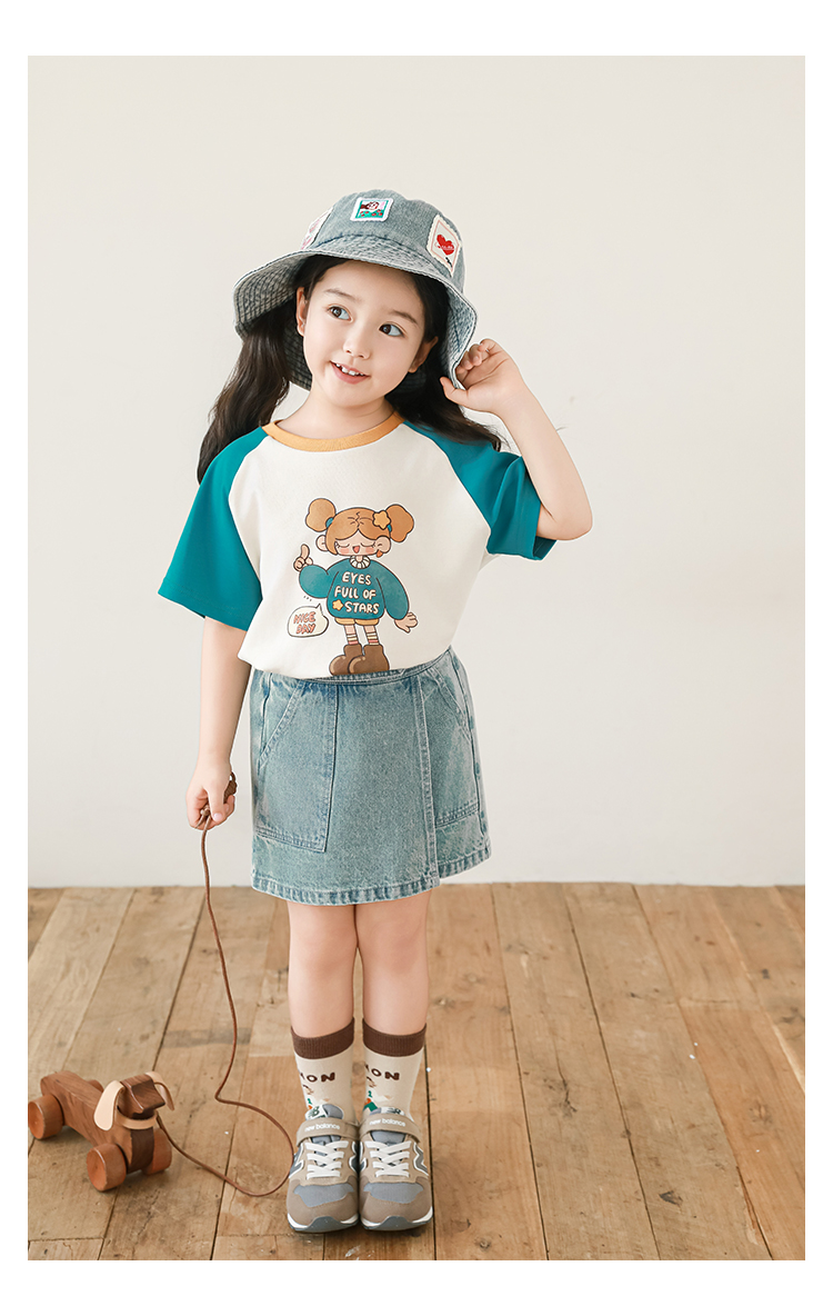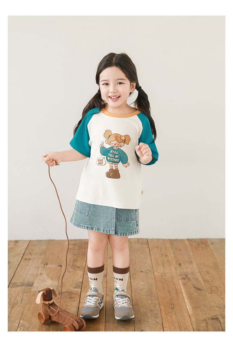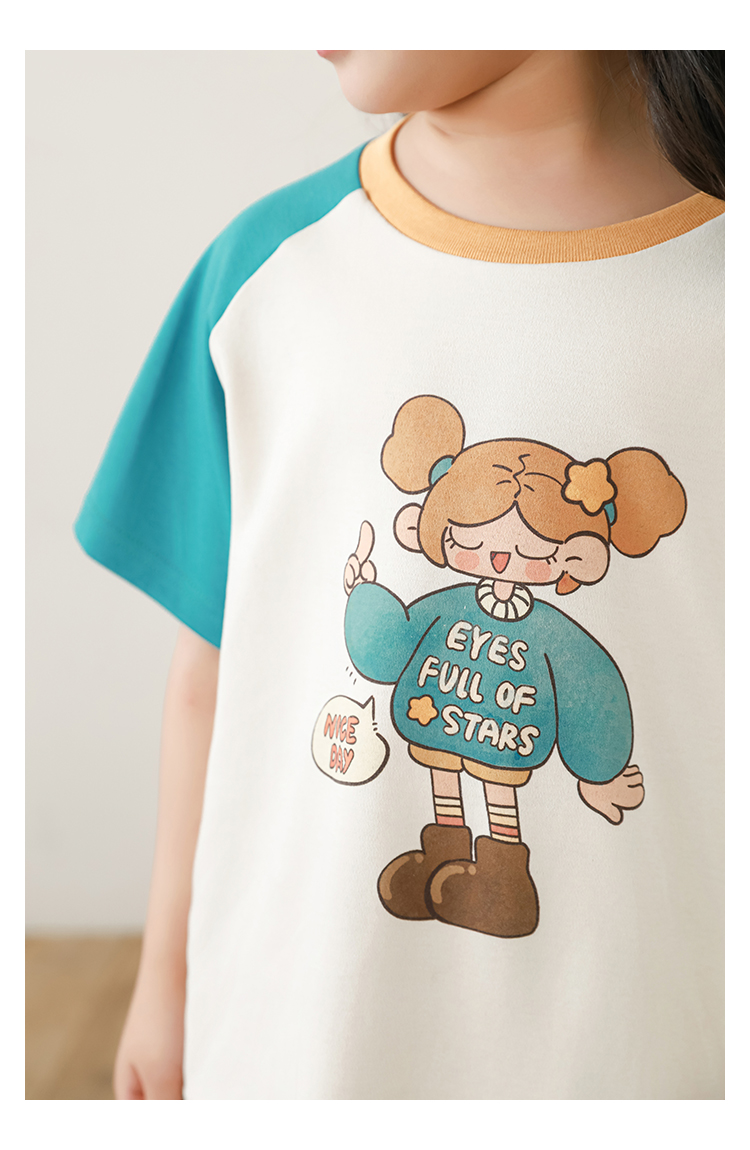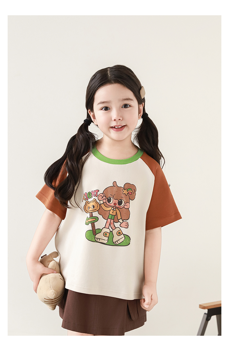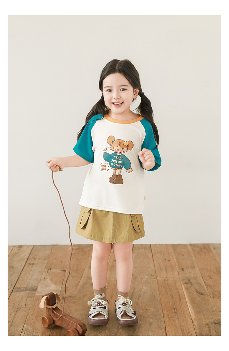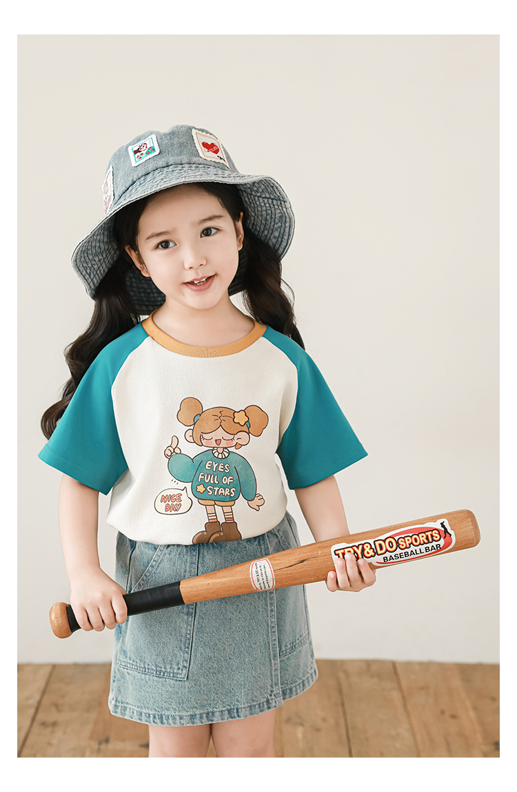 Wulibuyi 소녀 만화 프린트 라글란 슬리브 티셔츠 2025 여름 경량 대비 색상 골지 반팔 탑 트렌디스토어 가기