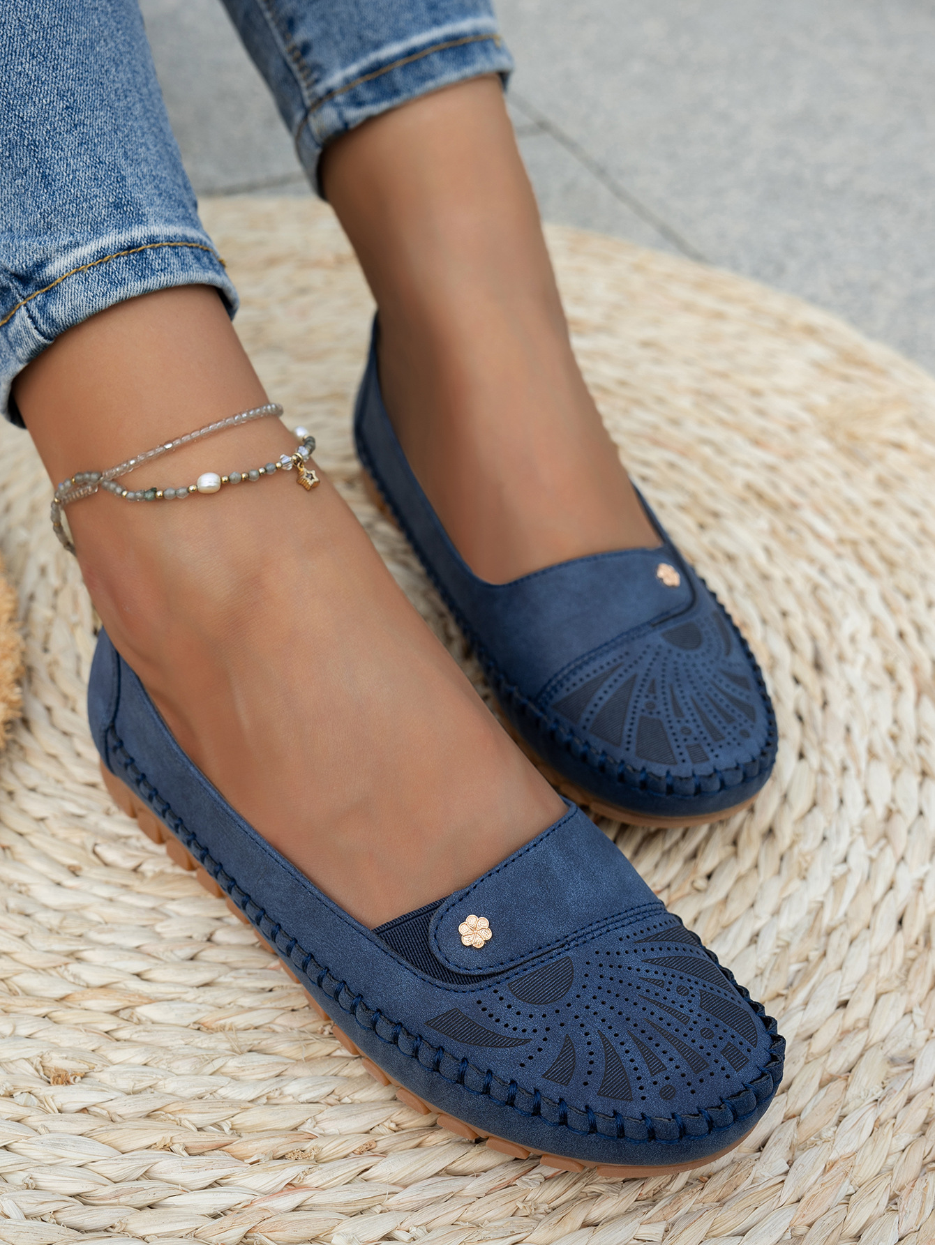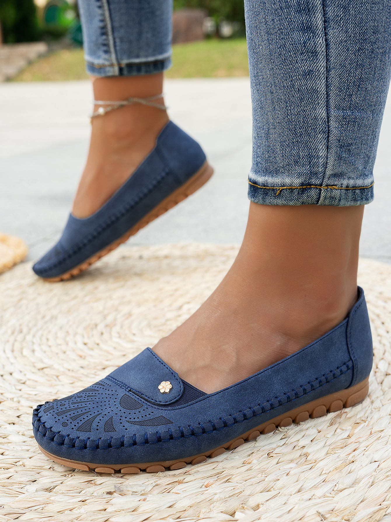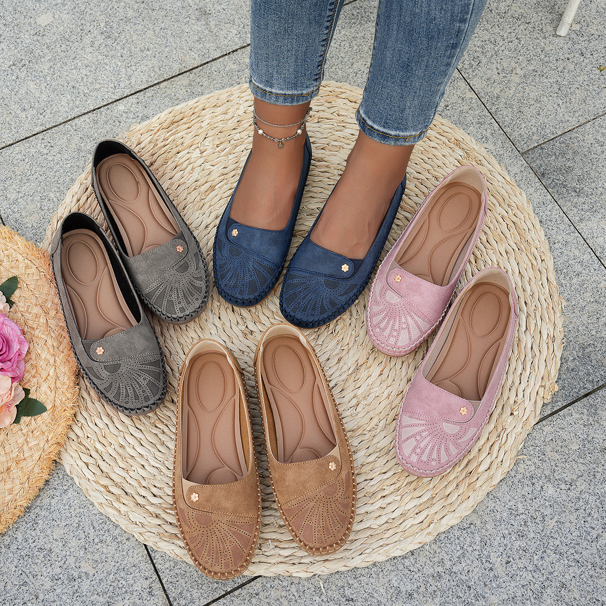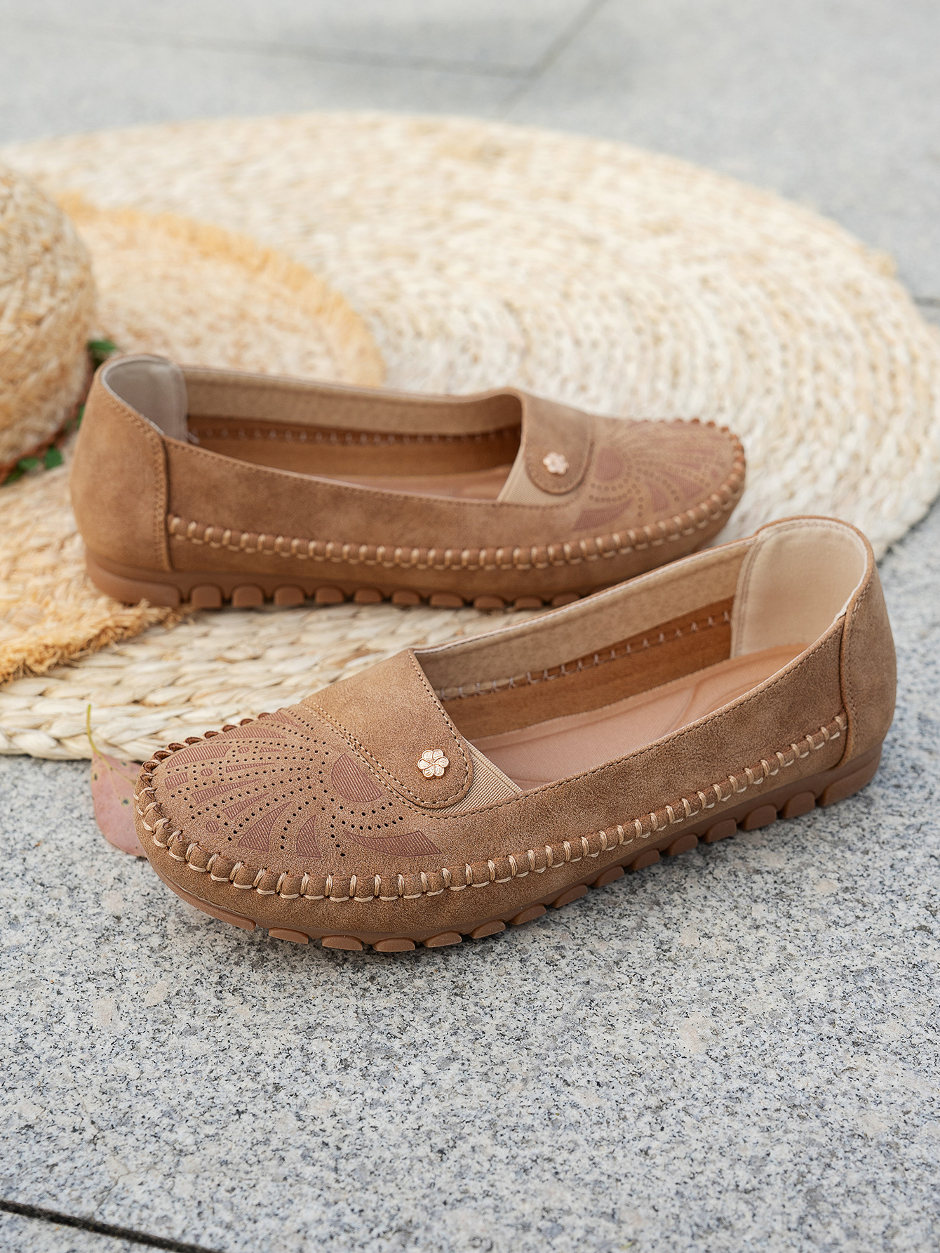 대형 사이즈 수출용 스티치 장식 금속 버클 여성 플랫 로퍼 신발, 해외 전자상거래 공급, 레트로하고 편안하며 다용도스토어 가기