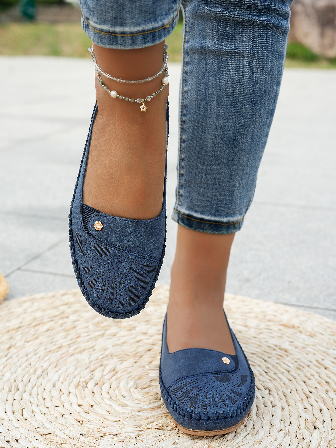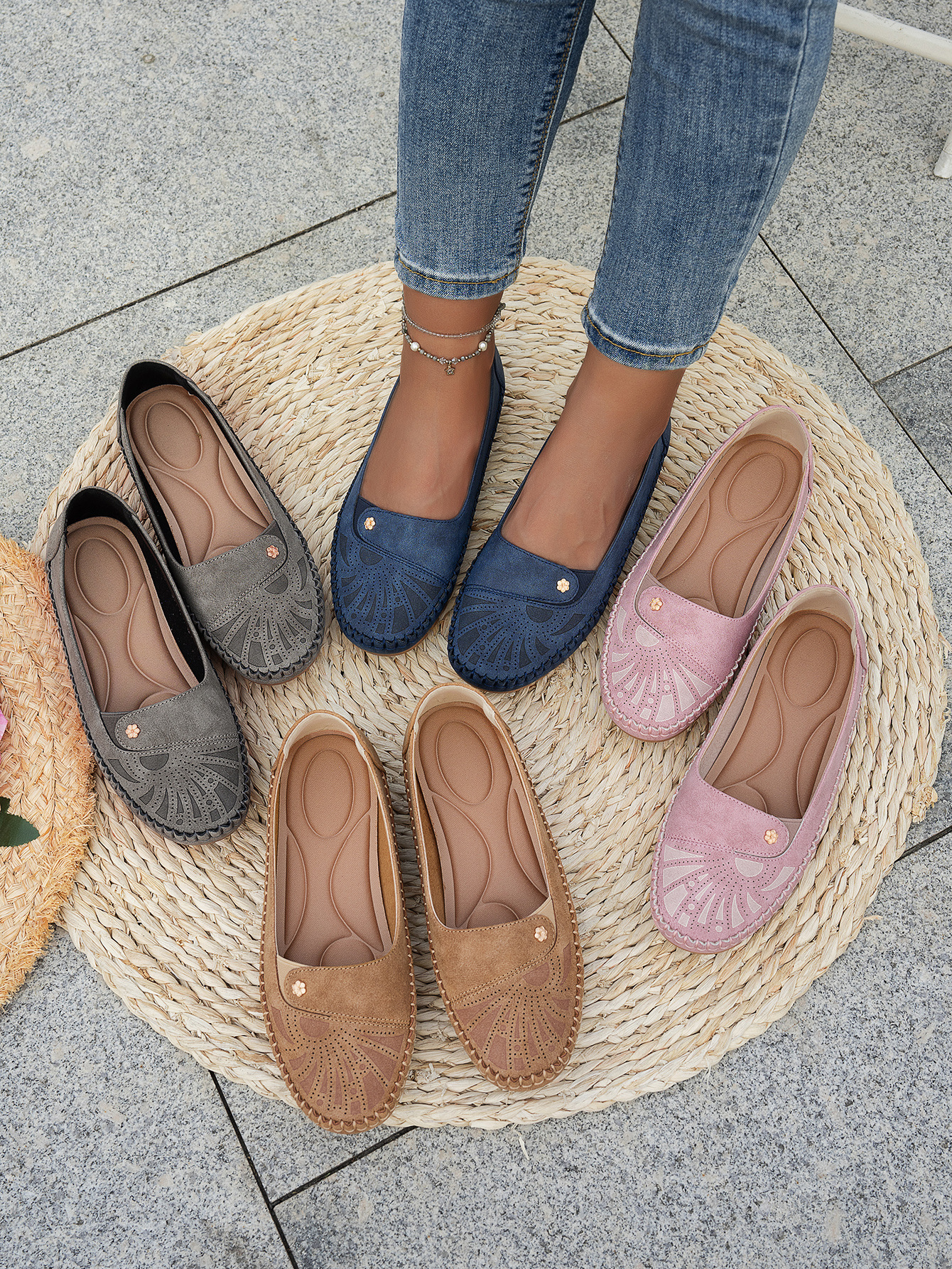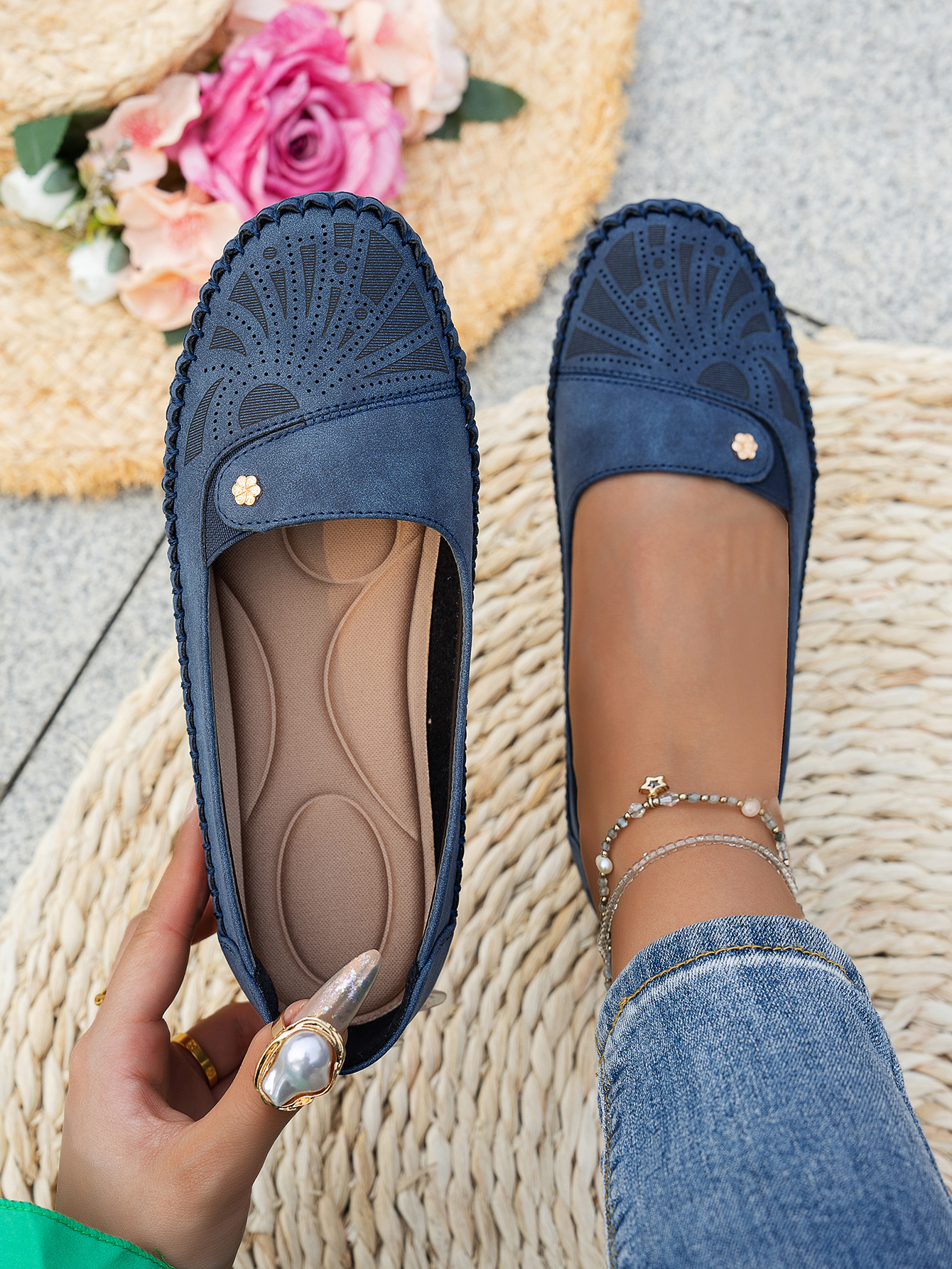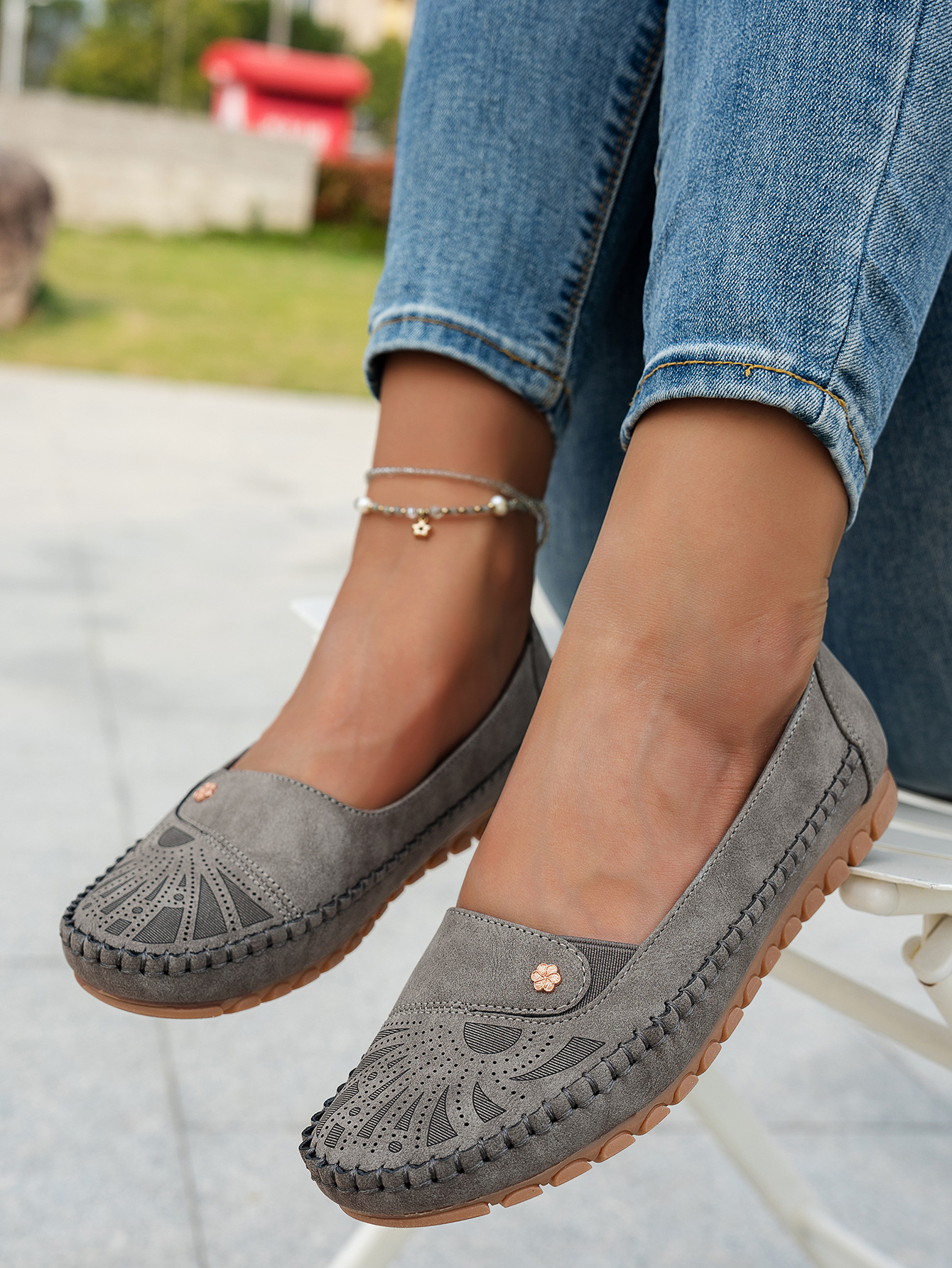 대형 사이즈 수출용 스티치 장식 금속 버클 여성 플랫 로퍼 신발, 해외 전자상거래 공급, 레트로하고 편안하며 다용도스토어 가기