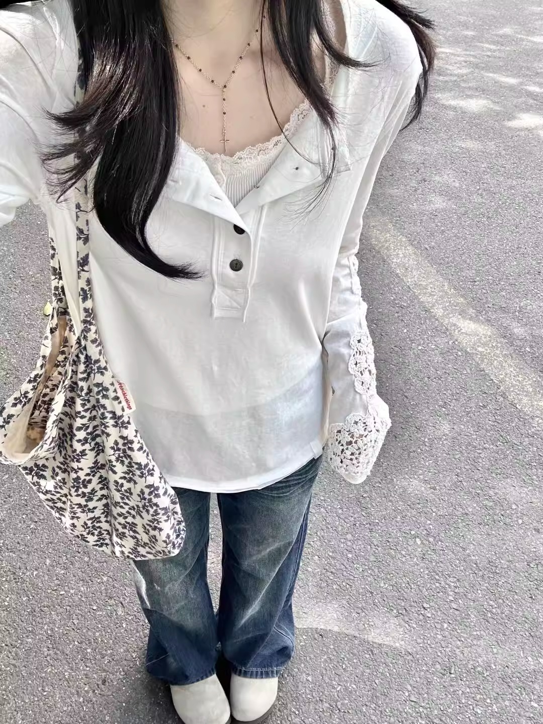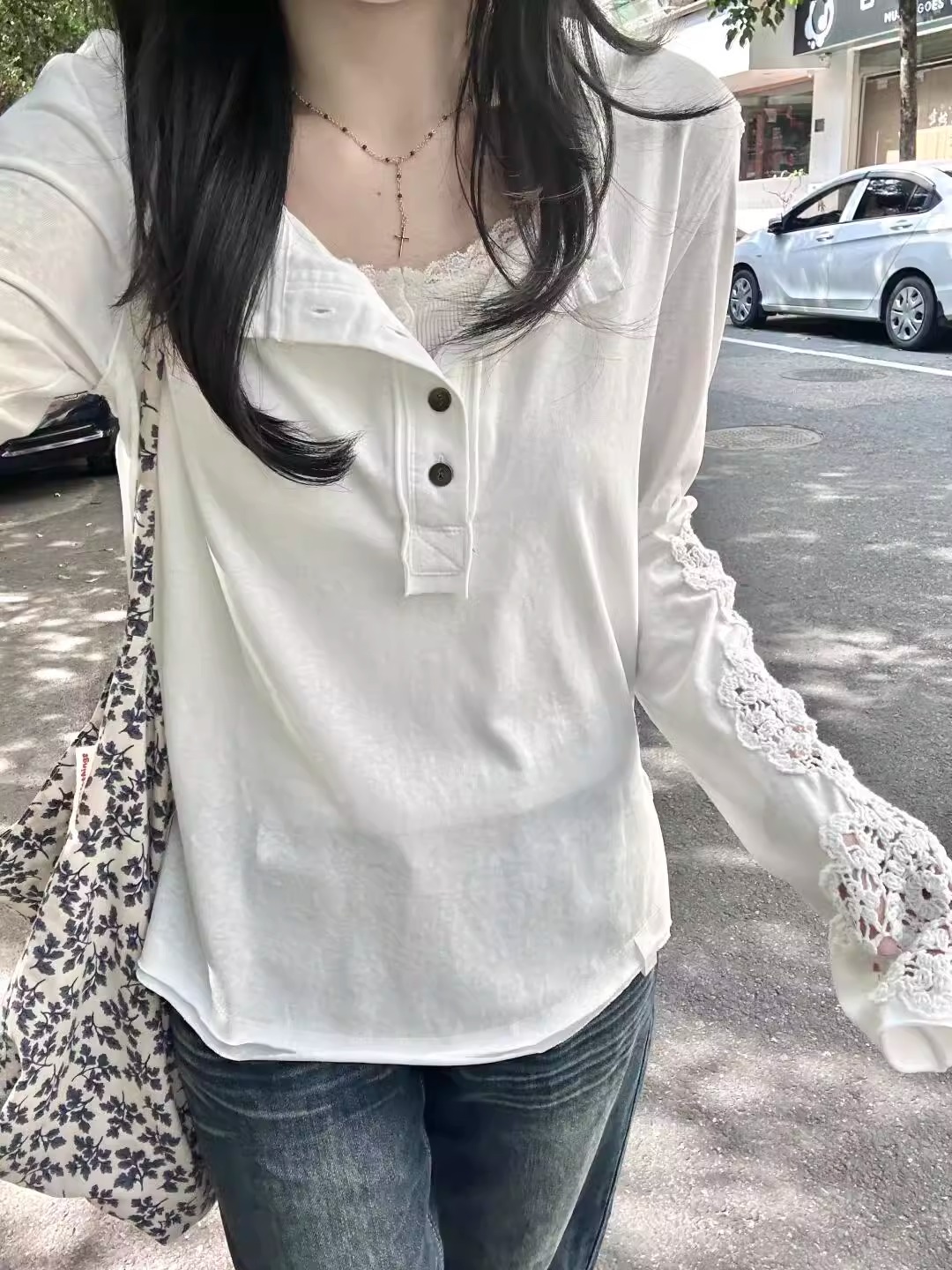 화이트 레이스 할로우 자수 헨리 칼라 긴팔 티셔츠 여성 봄 2025 새로운 여름 선 스크린 블라우스 탑