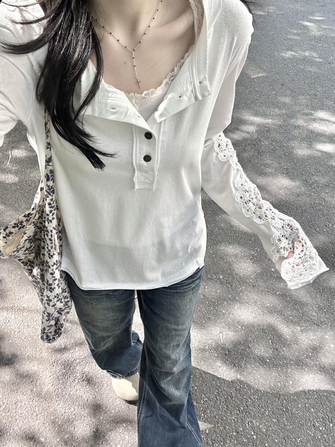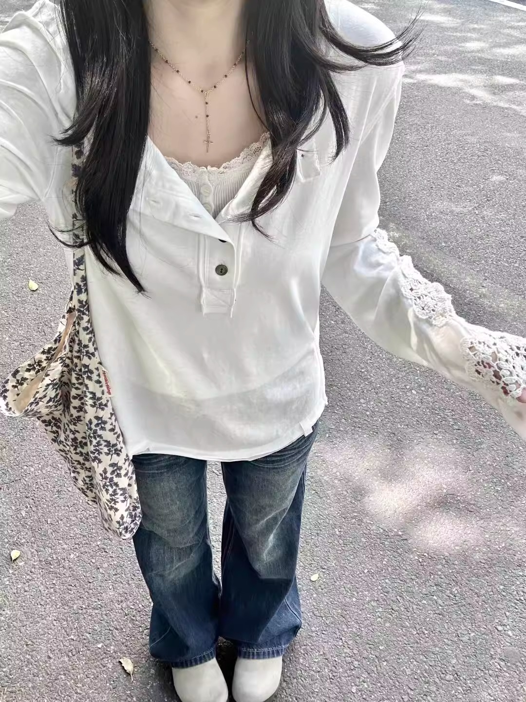 화이트 레이스 할로우 자수 헨리 칼라 긴팔 티셔츠 여성 봄 2025 새로운 여름 선 스크린 블라우스 탑스토어 가기