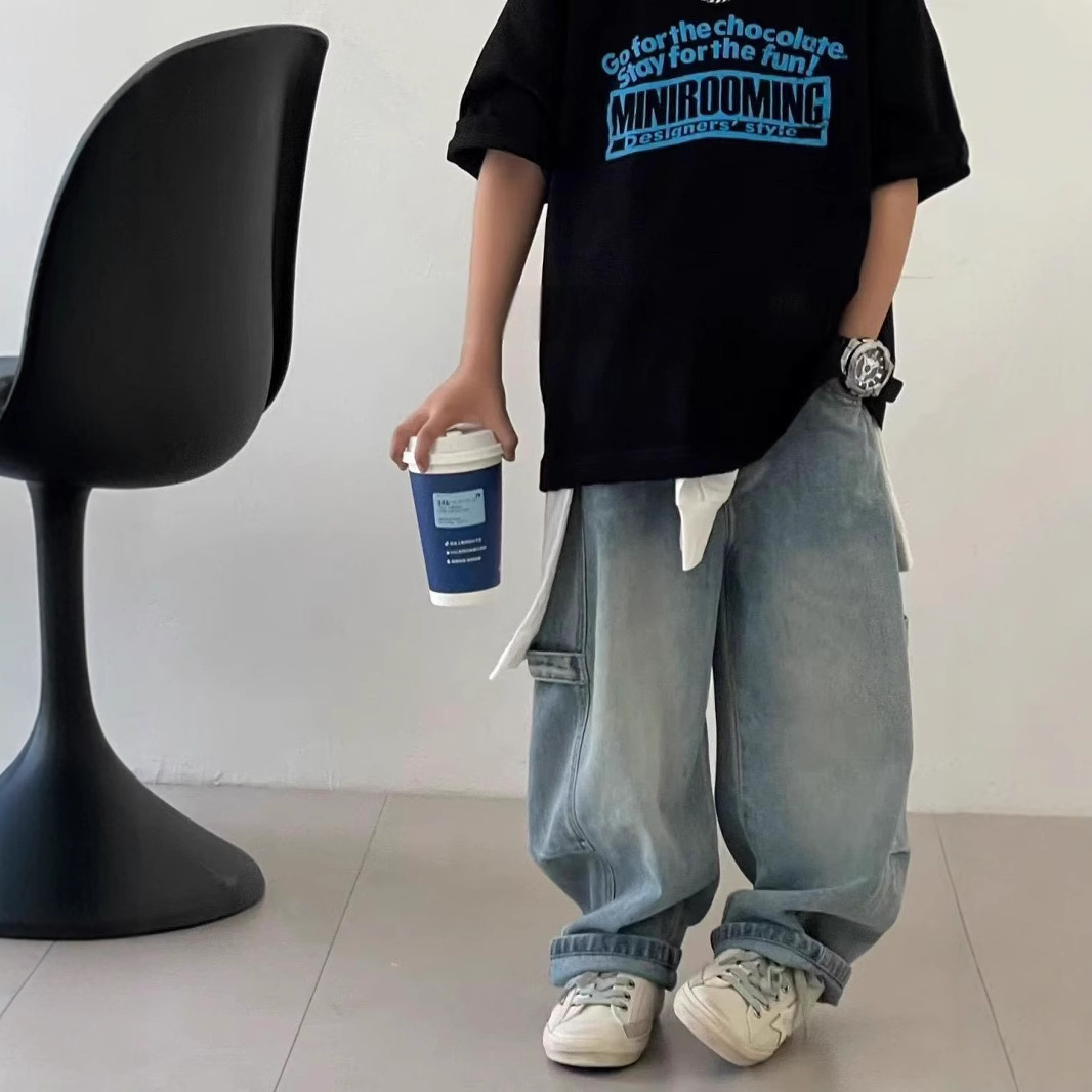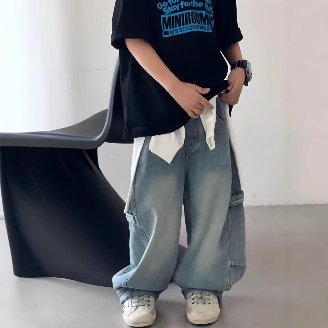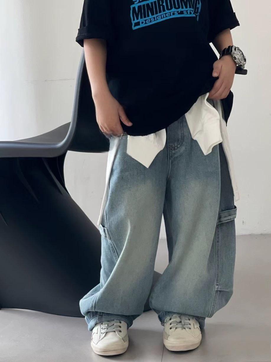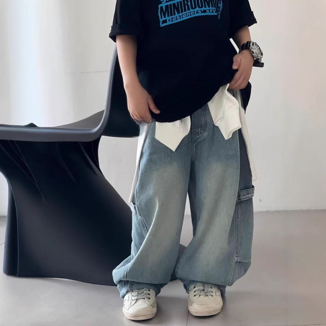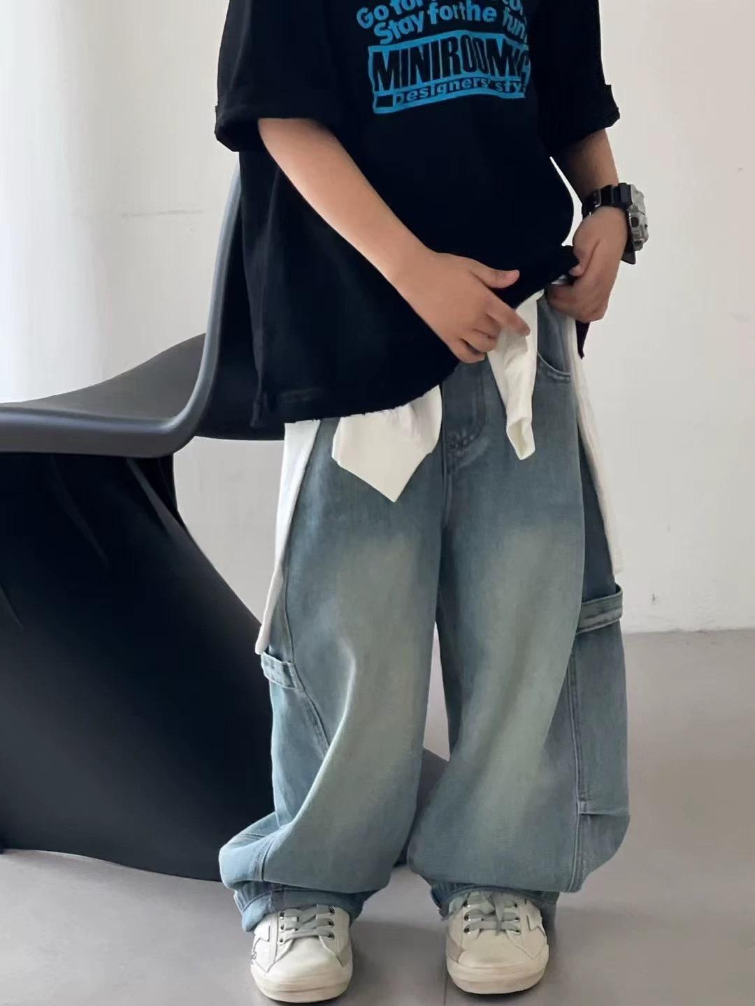 소년을위한 거리 트렌디 쿨 청바지 2025 여름 새로운 한국식 느슨한 올매치 캐주얼 바지 어린이 아빠 바지스토어 가기