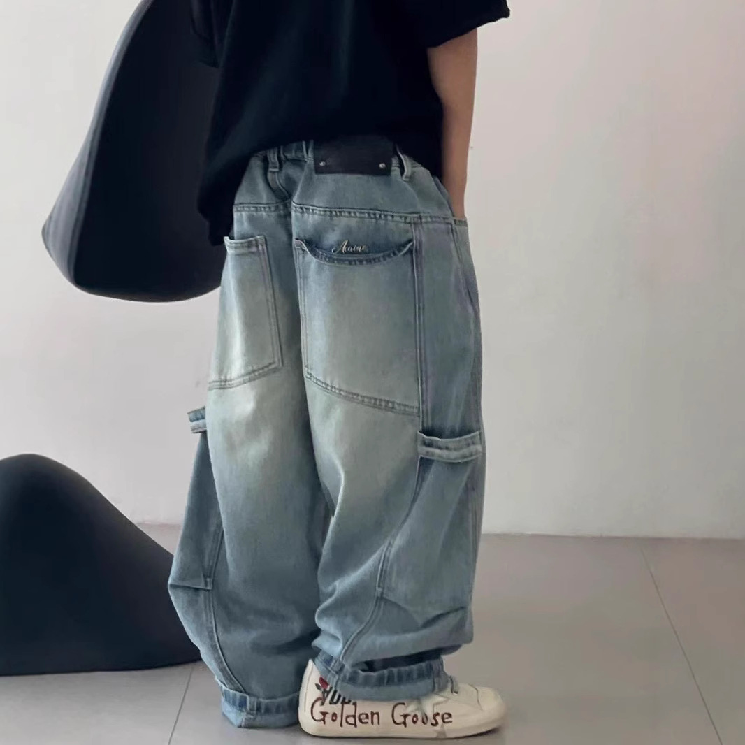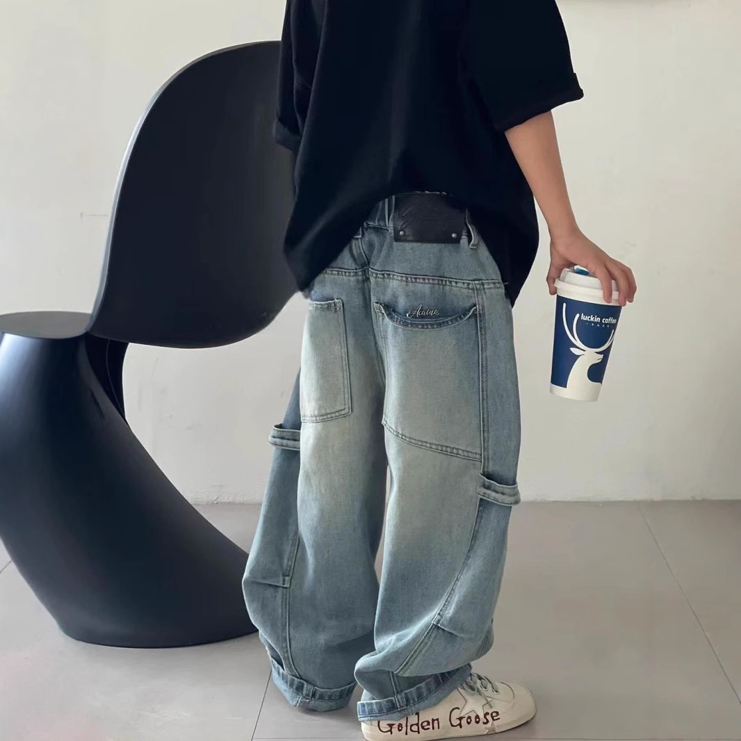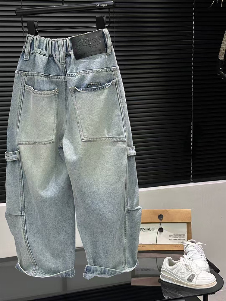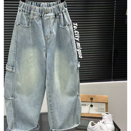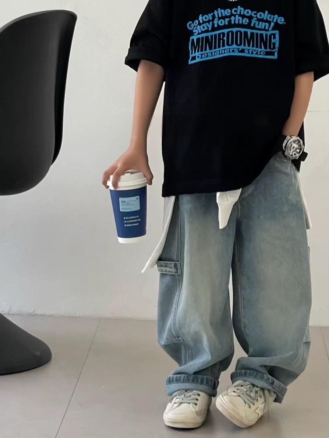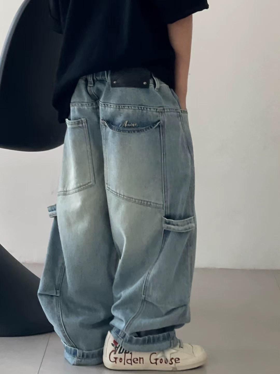 소년을위한 거리 트렌디 쿨 청바지 2025 여름 새로운 한국식 느슨한 올매치 캐주얼 바지 어린이 아빠 바지스토어 가기