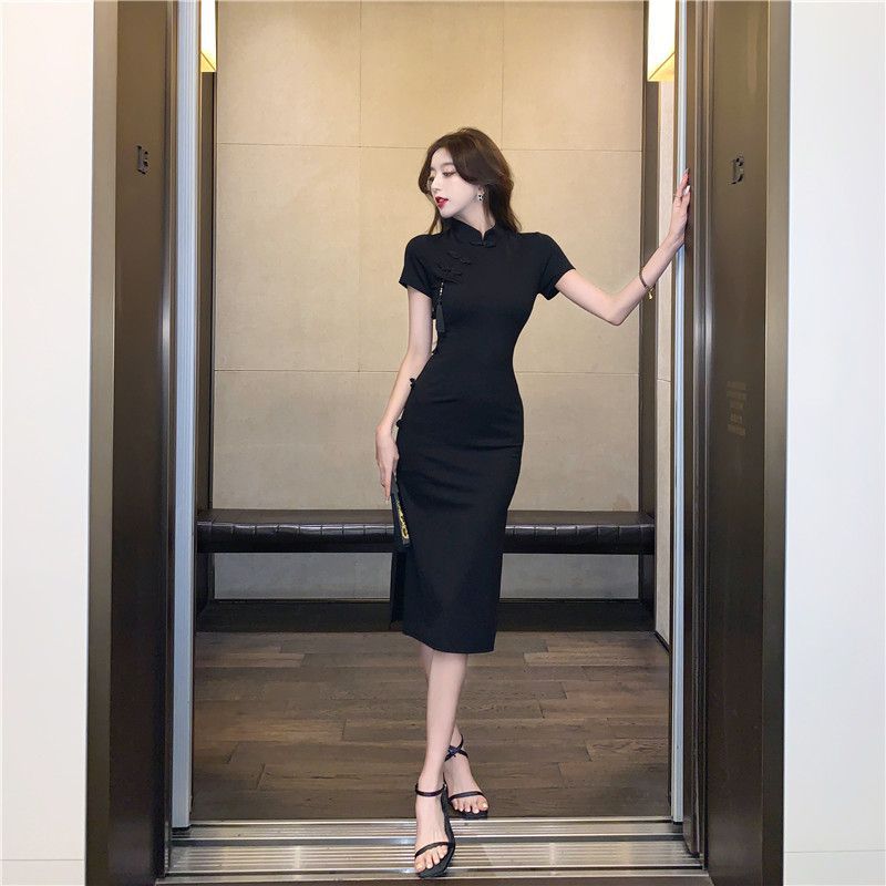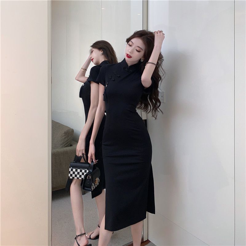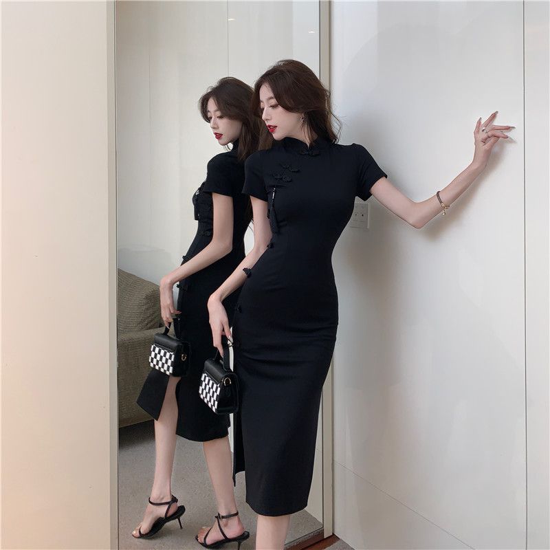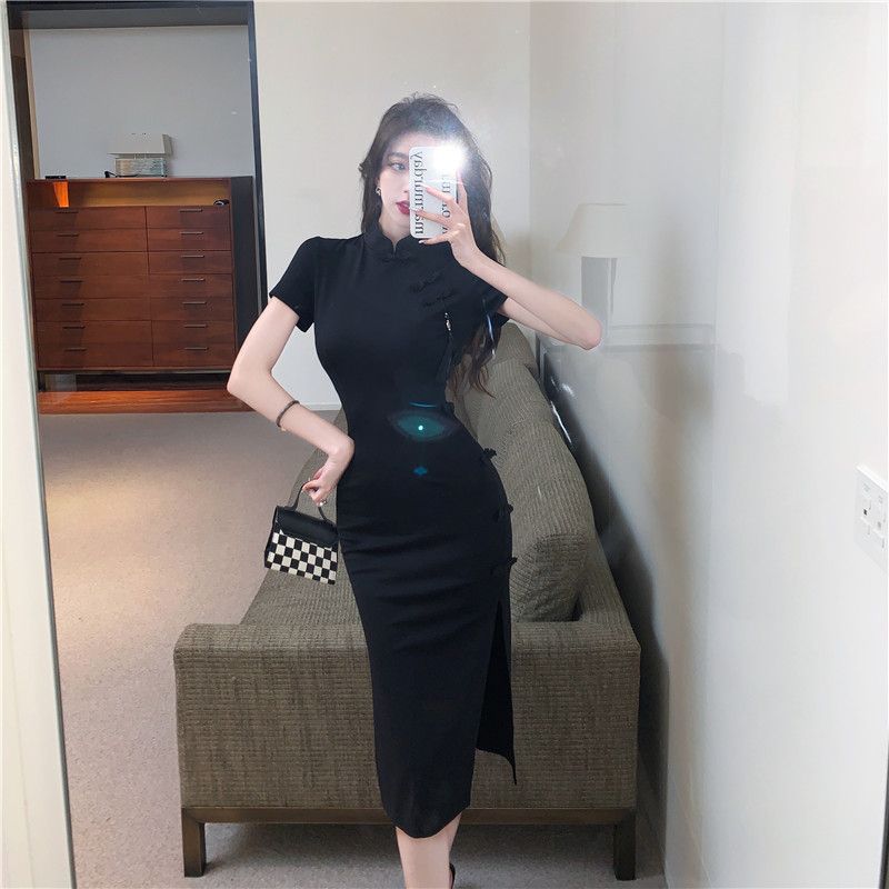 중국 빈티지 버클 수정 청삼 원피스 여성 하이 엔드 블랙 원피스 여름 허리 스플릿 힙합 스커트스토어 가기