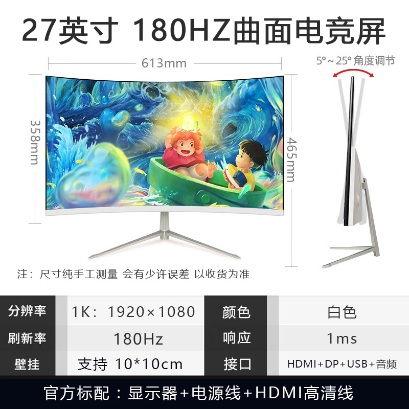• 27inch 프레임리스 곡선형 흰색 1K180HZ 업그레이드 모델 - 공식 표준 SF Express 무료 배송