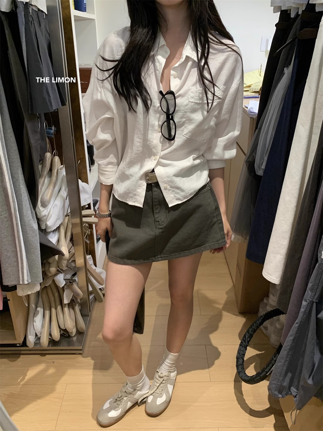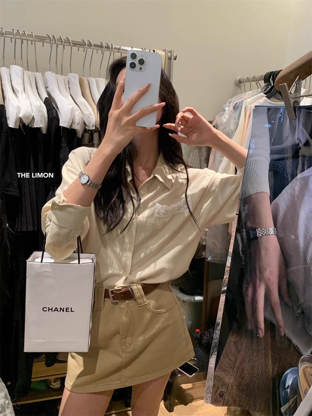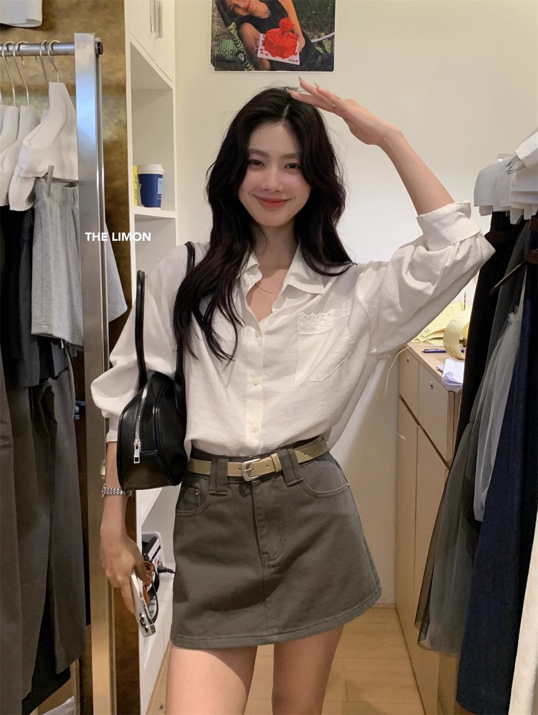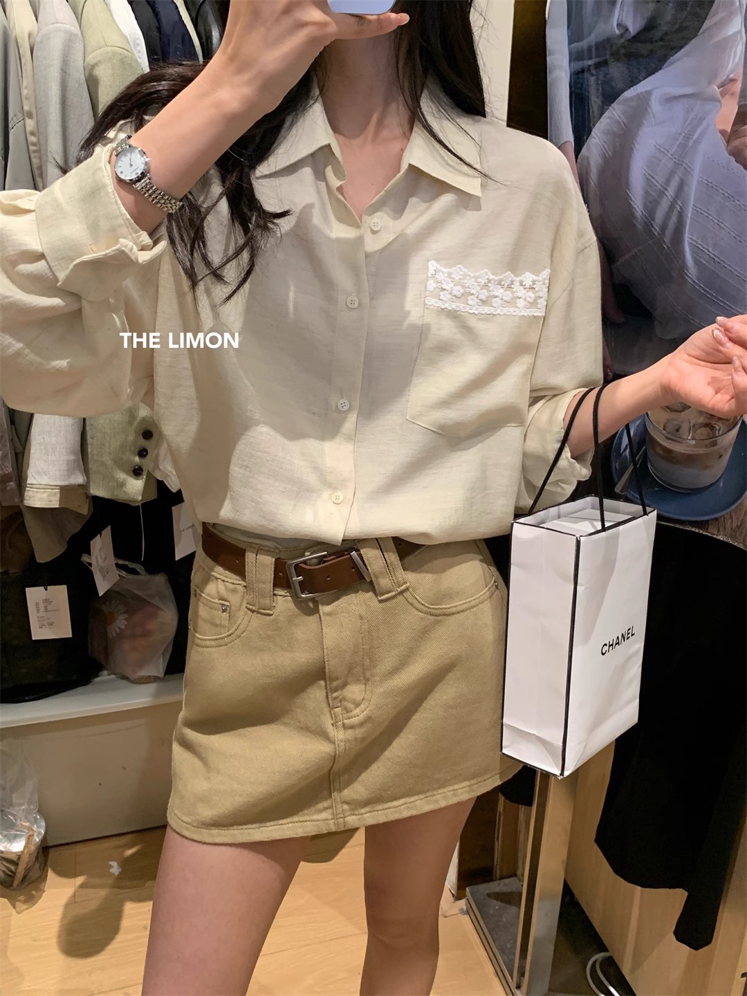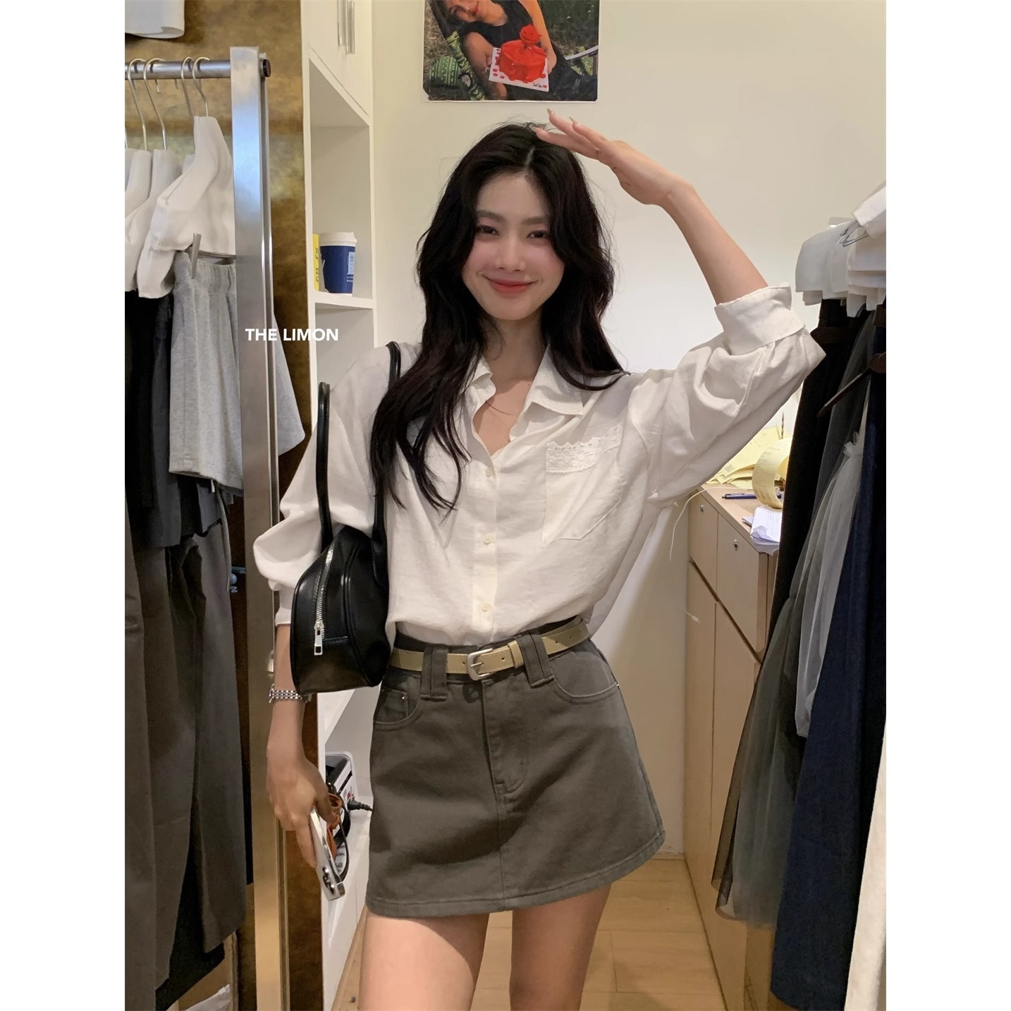 한국식 하이 엔드 레이스 포켓 디자인 셔츠 여성의 봄 새로운 하이 웨이스트 작업복 하프 길이 스커트 투피스 세트스토어 가기