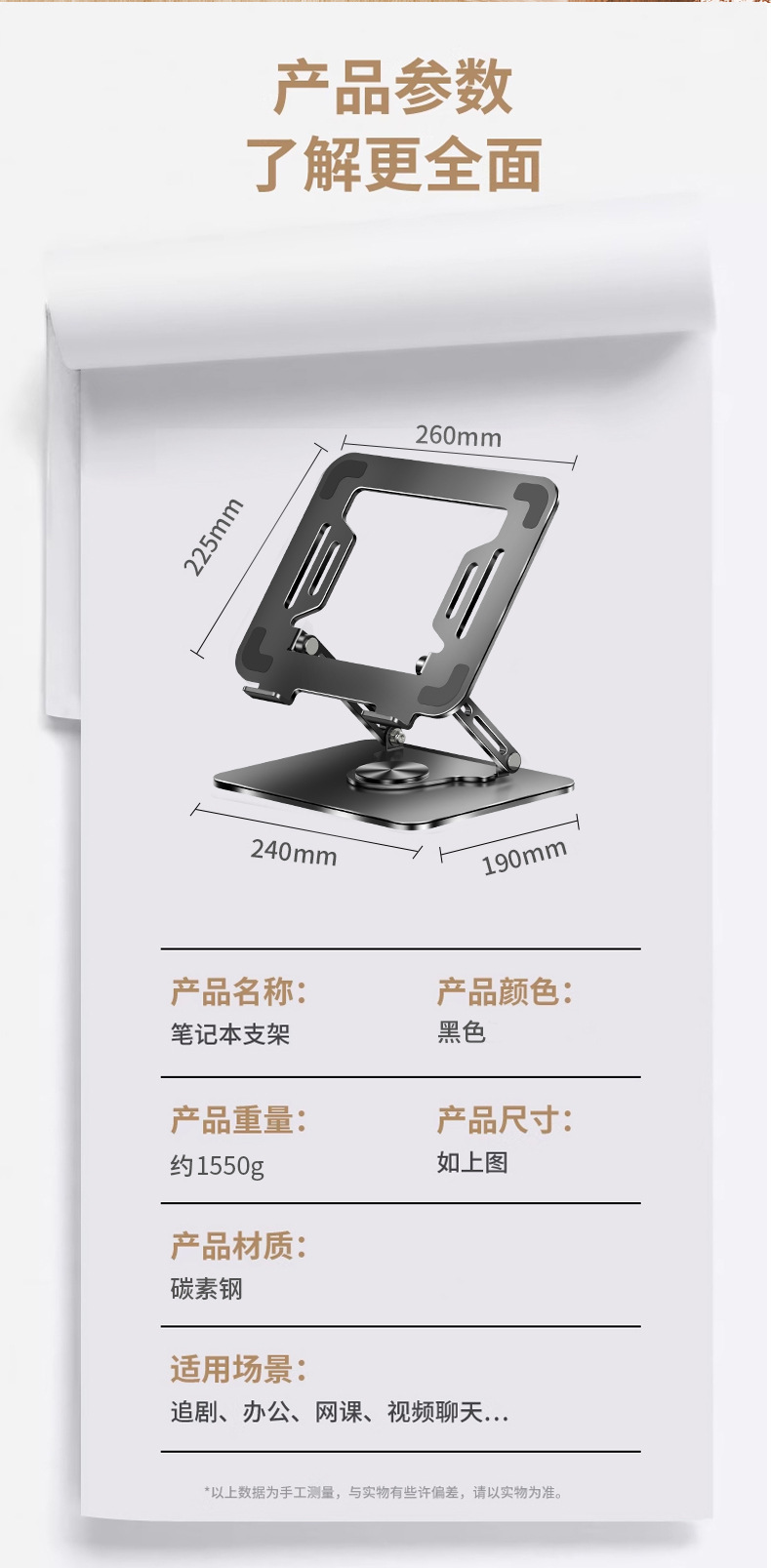 노트북 스탠드 데스크탑 공중 냉각 360도 회전식 리프팅 및 접이식 스탠드 내구성